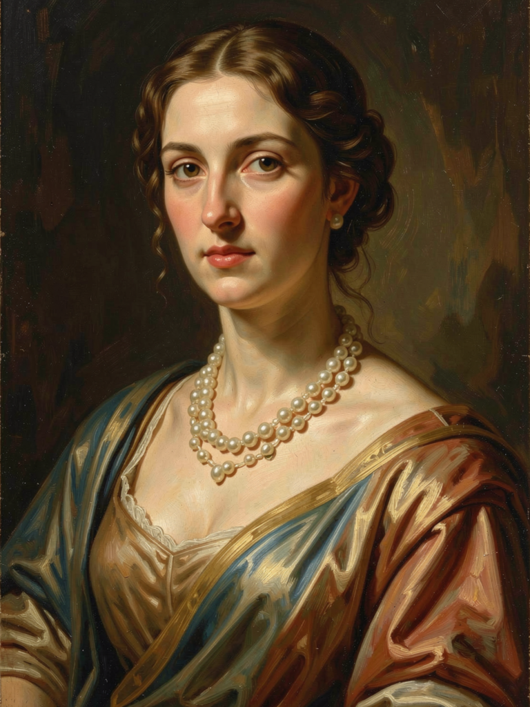 “Create a digital portrait of a young woman in her 30s, lit by warm candlelight from the left side, rendered in the style of Baroque oil painting. She looks contemplative, slightly downward gaze, wearing deep burgundy fabric. Textured brushwork, dark atmospheric background.”