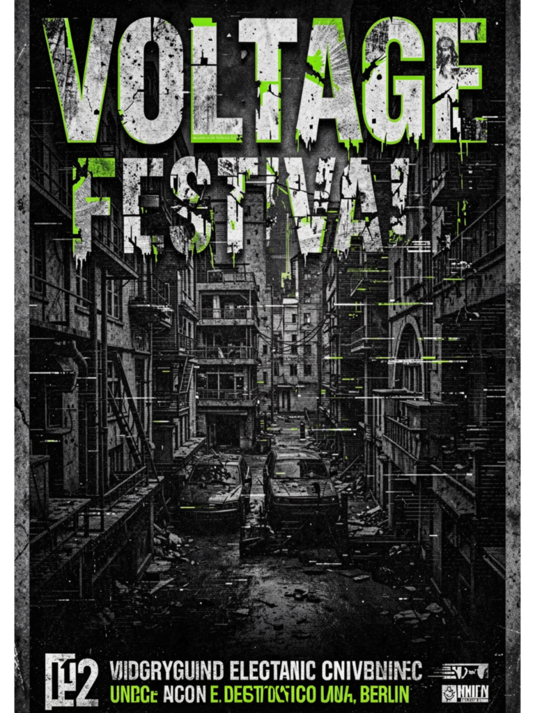 “Design a poster concept for ‘Voltage Festival,’ an underground electronic music event in Berlin. Aesthetic: brutalist typography, glitch art distortion, monochromatic with a single neon green accent. The headline ‘VOLTAGE’ should feel like it’s breaking apart at the edges. Include space for a date and venue at the bottom. Dark, industrial, raw energy.”