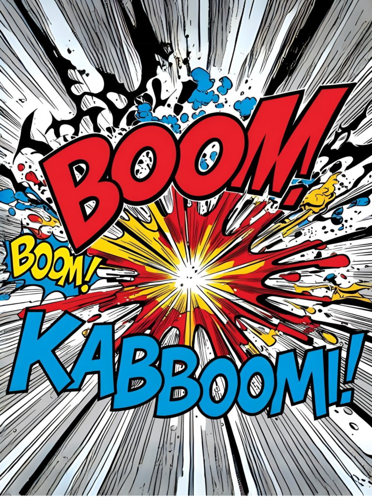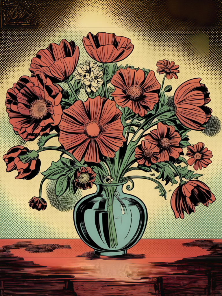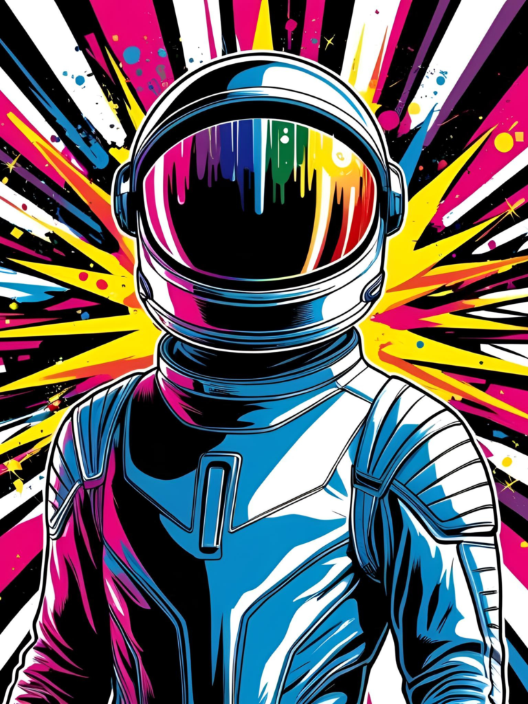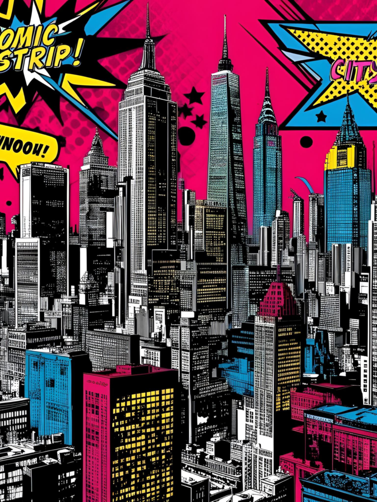 3. “Generate a piece inspired by comic book aesthetics, using halftone dots and vibrant colors to create a dramatic and engaging composition.”