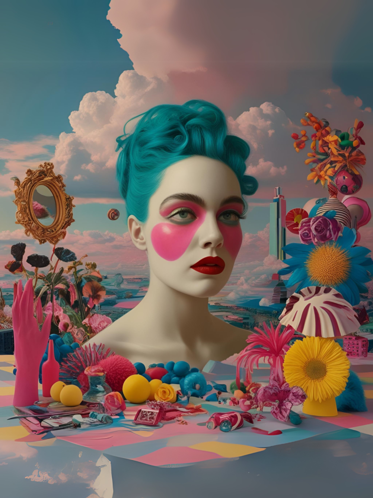 2. “Design a collage that combines elements from consumer products, media, and everyday objects. It should reflect the playful and critical nature of Pop Art.”
