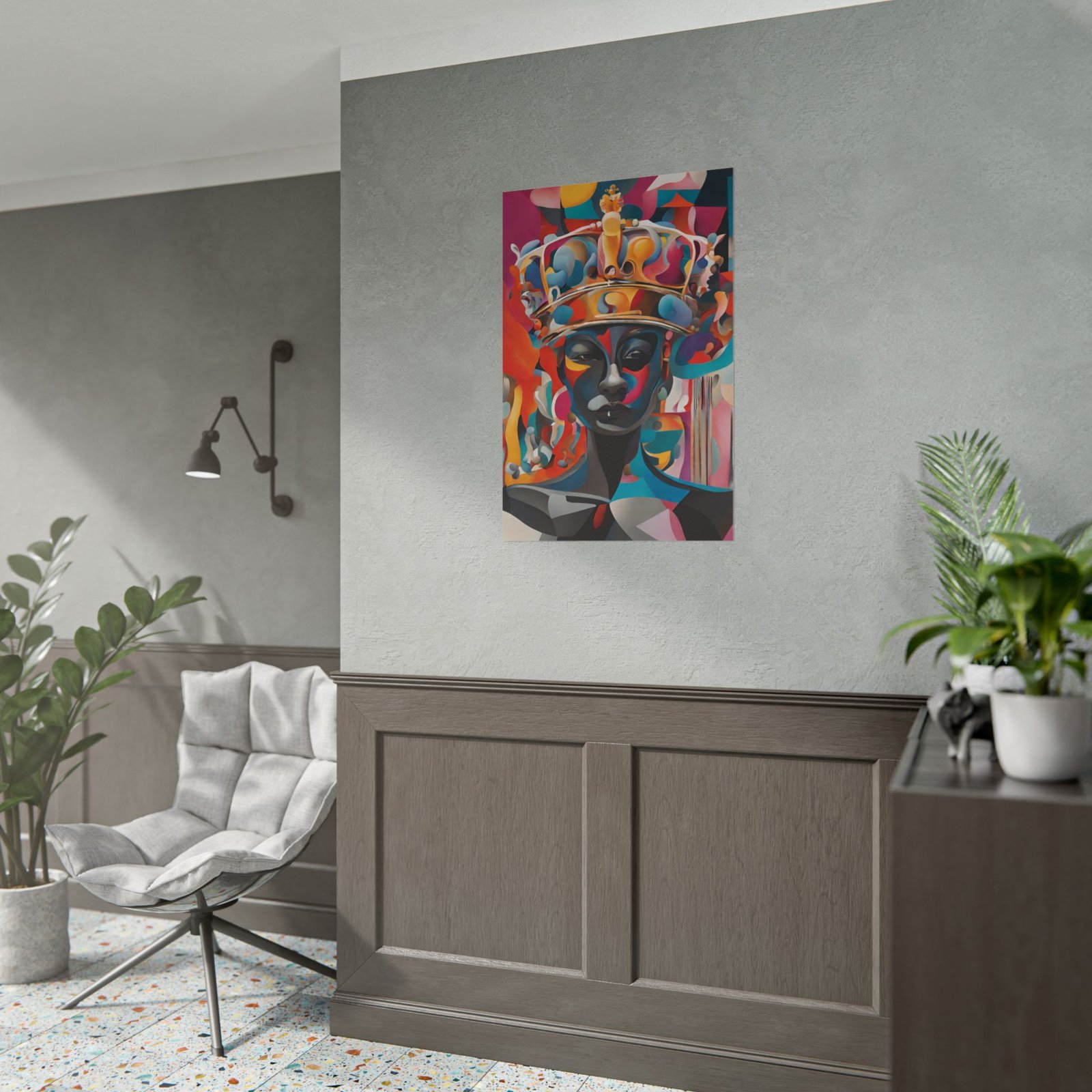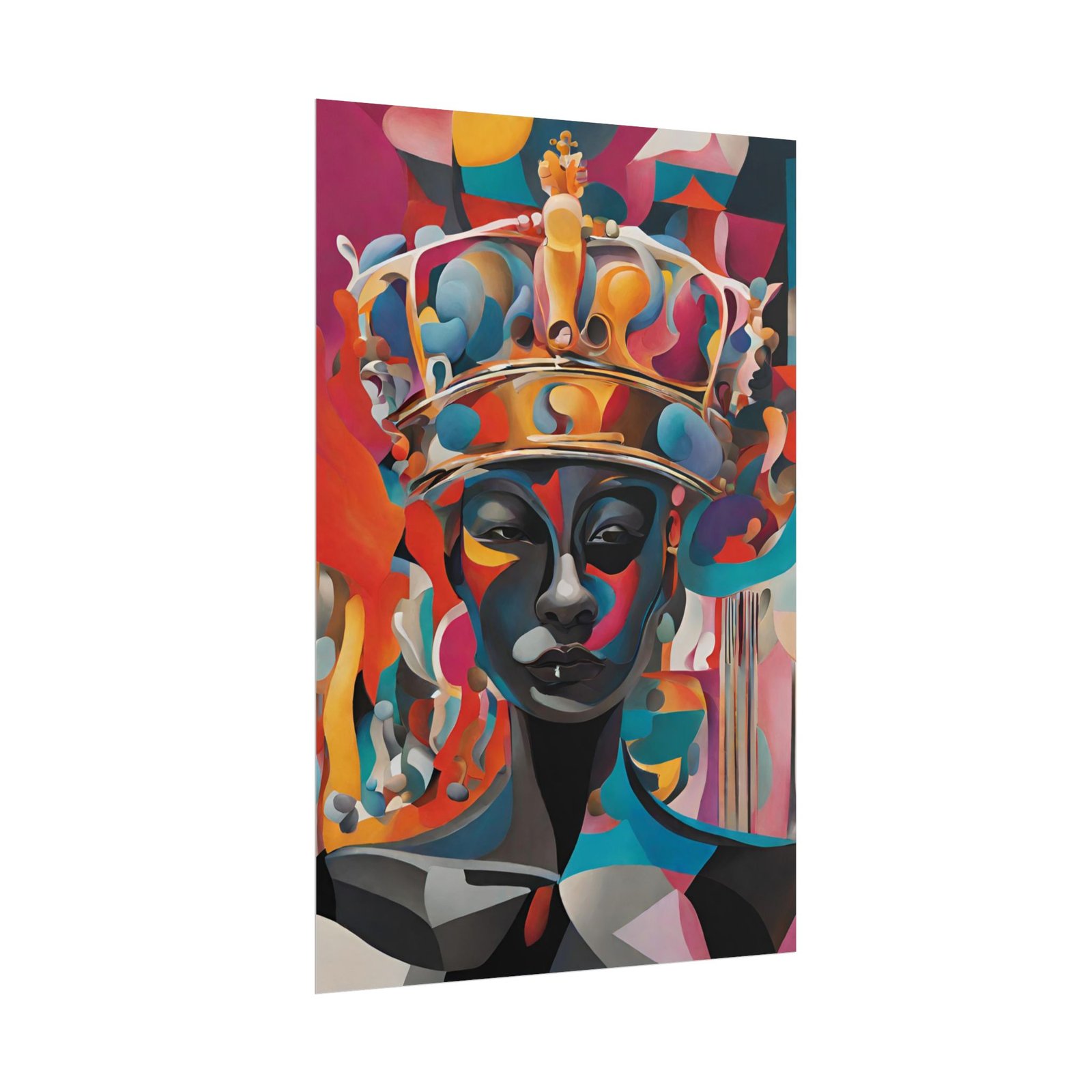 Bright, expressive poster art that brings bold color and modern soul into any room. This rolled poster features a vibrant, crown-wearing figure rendered in layered shapes and saturated hues — a conversation-starting centerpiece that feels both contemporary and timeless. Choose from a satin semi-gloss for punchy photographic fidelity, or a matte option for a muted, museum-like finish. it ships rolled for easy framing or mounting and holds up to regular sunlight thanks to high-quality giclée printing. Hang it in a studio, living room, or office to add instant personality and depth.