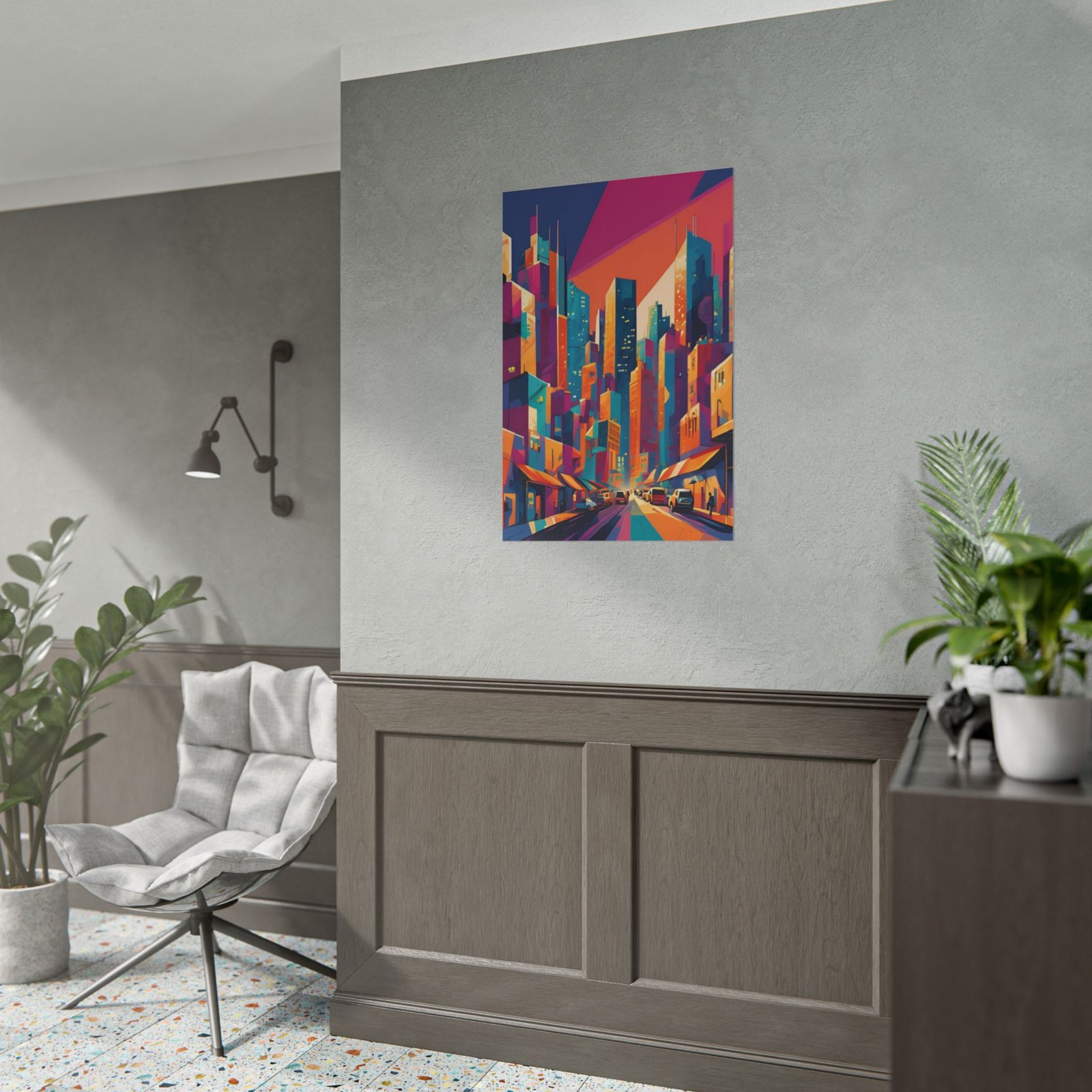 Rolled poster featuring a vivid, geometric cityscape that breathes color and motion into any room. Sunlit prisms of orange, fuchsia, teal and cobalt stack into soaring buildings, while angled streets draw the eye into an energetic downtown scene. Printed with archival-quality giclée inks on your choice of semi-glossy, or matte paper, this poster preserves crisp detail and saturated hues whether you hang it in a studio, office, or living room. semi-gloss brings out sharp color fidelity; matte tones down glare for a modern, understated look.
