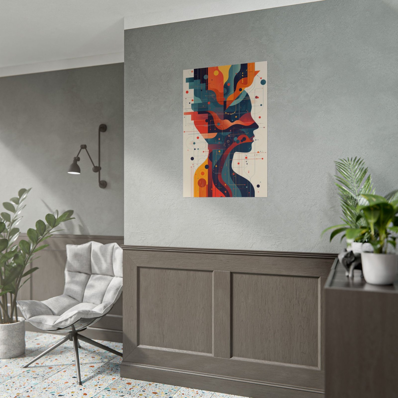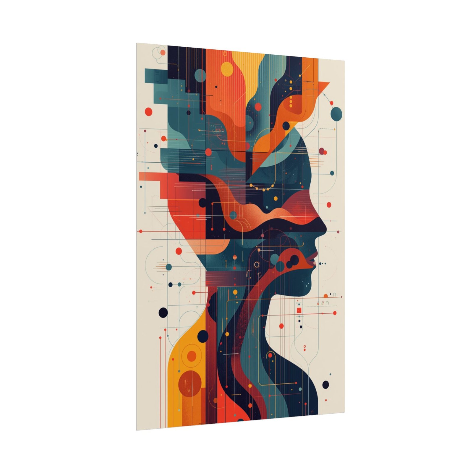 “Complexity ” presents a striking profile woven from geometric shapes and layered patterns, blending deep blues with vibrant oranges and reds. The interplay of circles, lines, and curves conveys a sense of interconnected complexity, echoing both technology and human thought. This piece reveals a balance between structure and fluidity, making it an intriguing addition to any contemporary space.