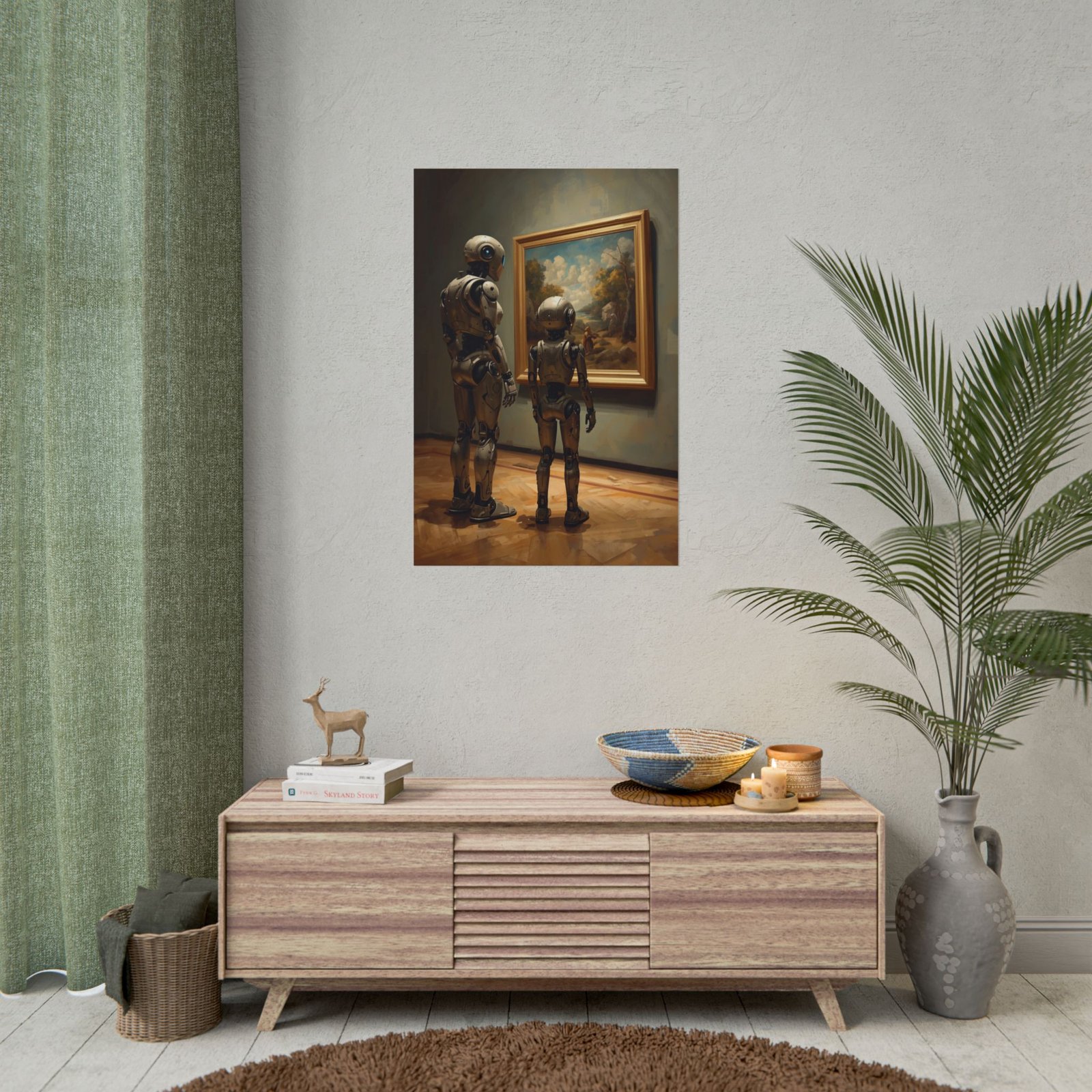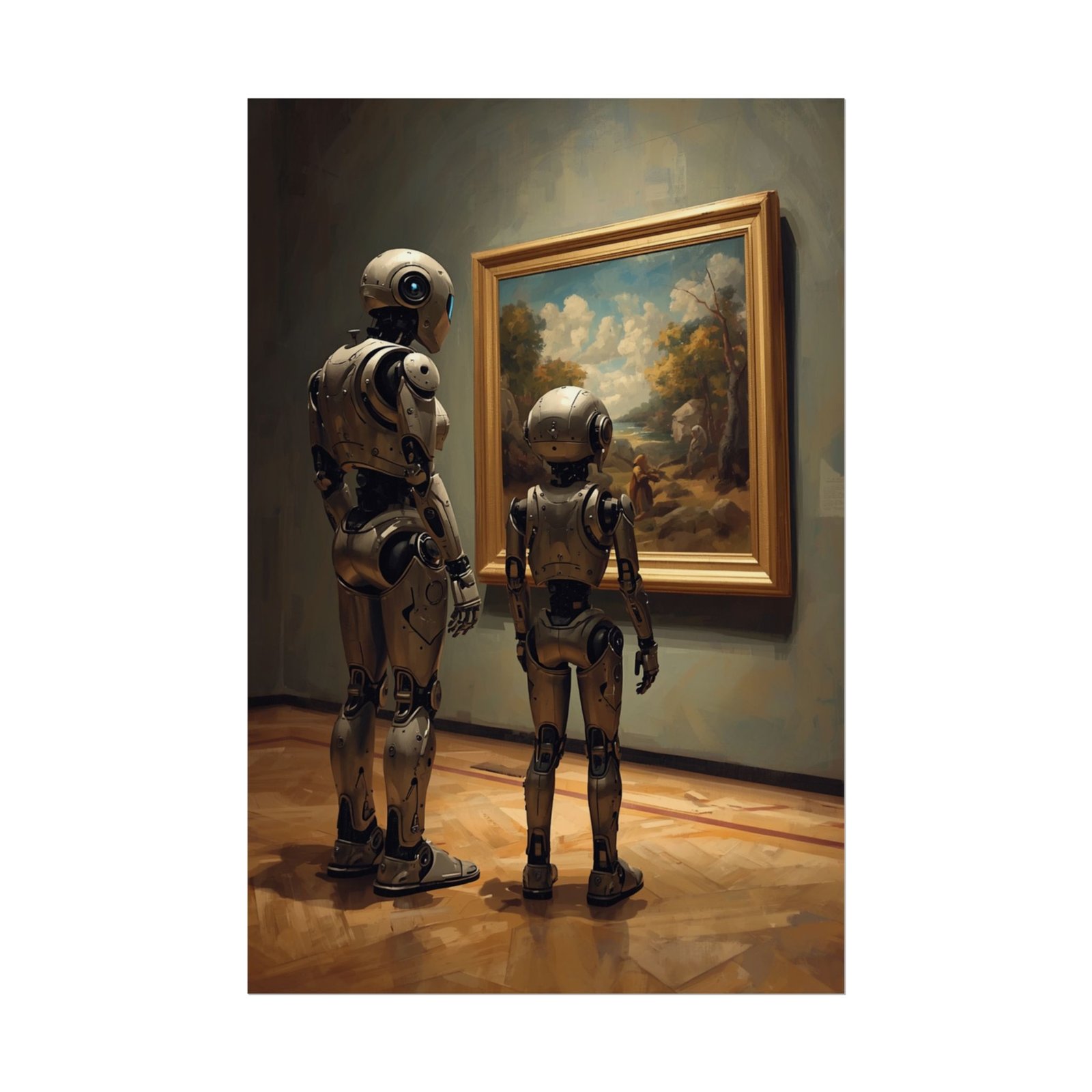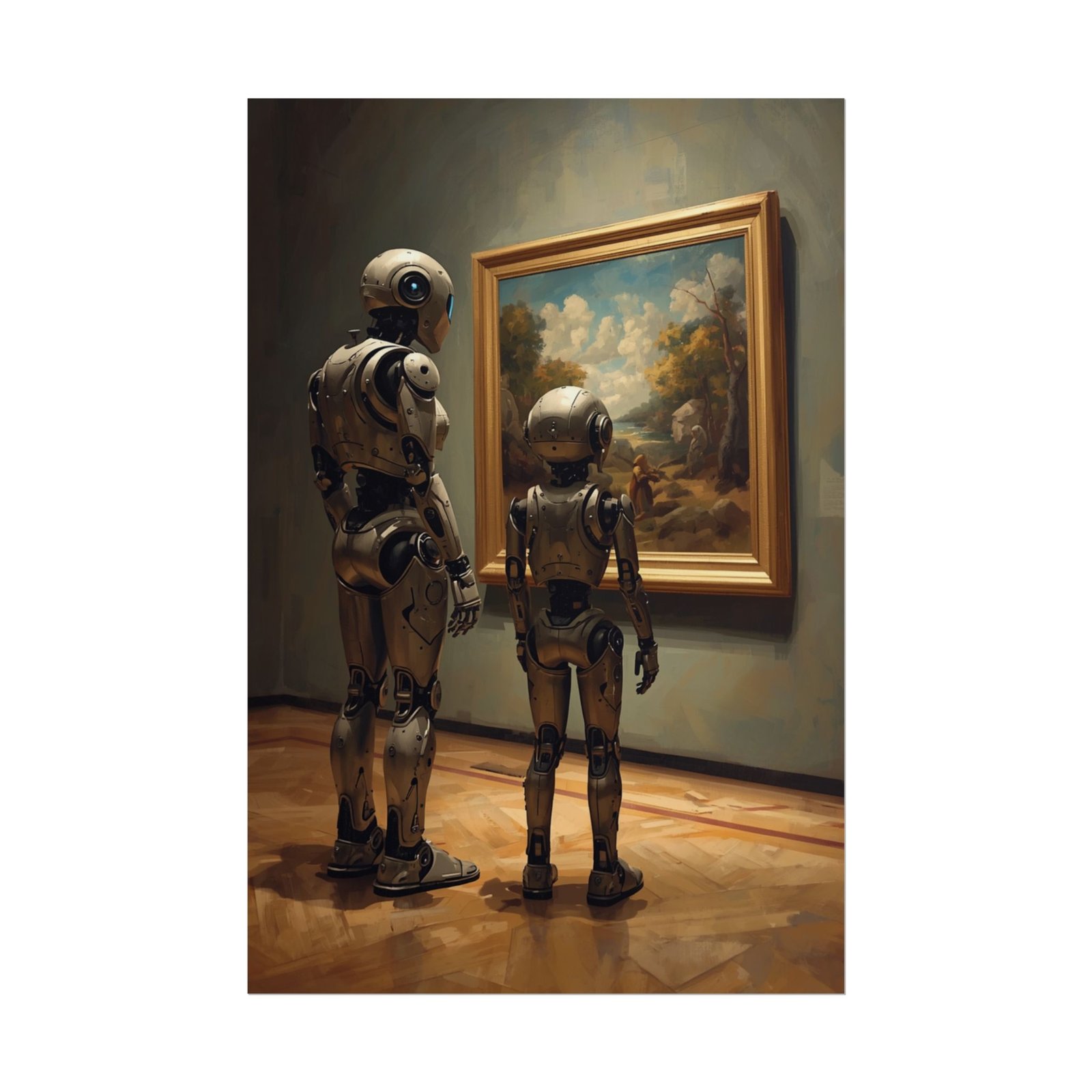 “Contemplating Tomorrow” presents a striking scene where two robots, an adult and a child, stand in quiet reflection before a classic landscape painting. The contrast between futuristic technology and traditional art reveals a dialogue between past and future, inviting viewers to consider the evolution of perception and creativity. This piece offers a unique perspective that would enrich any space with its thoughtful blend of innovation and history.