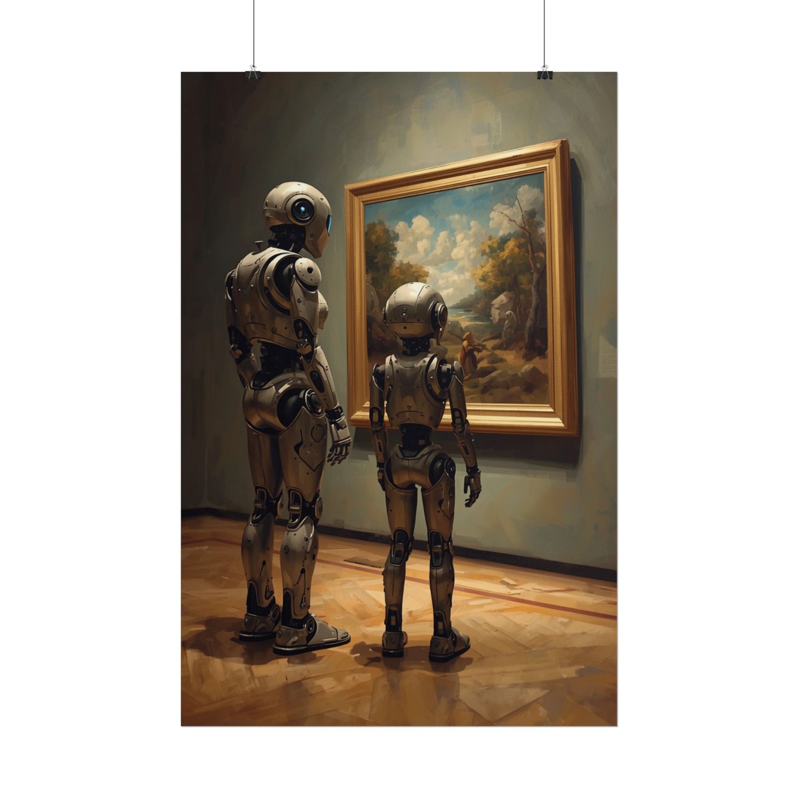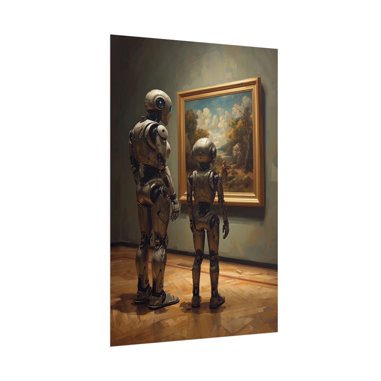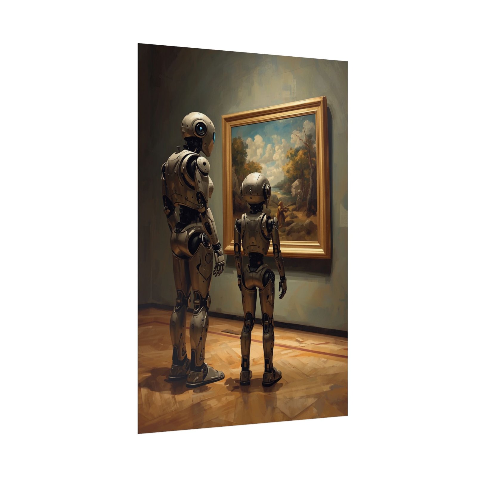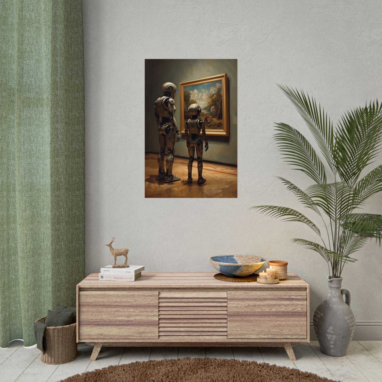 “Contemplating Tomorrow” presents a striking scene where two robots, an adult and a child, stand in quiet reflection before a classic landscape painting. The contrast between futuristic technology and traditional art reveals a dialogue between past and future, inviting viewers to consider the evolution of perception and creativity. This piece offers a unique perspective that would enrich any space with its thoughtful blend of innovation and history.