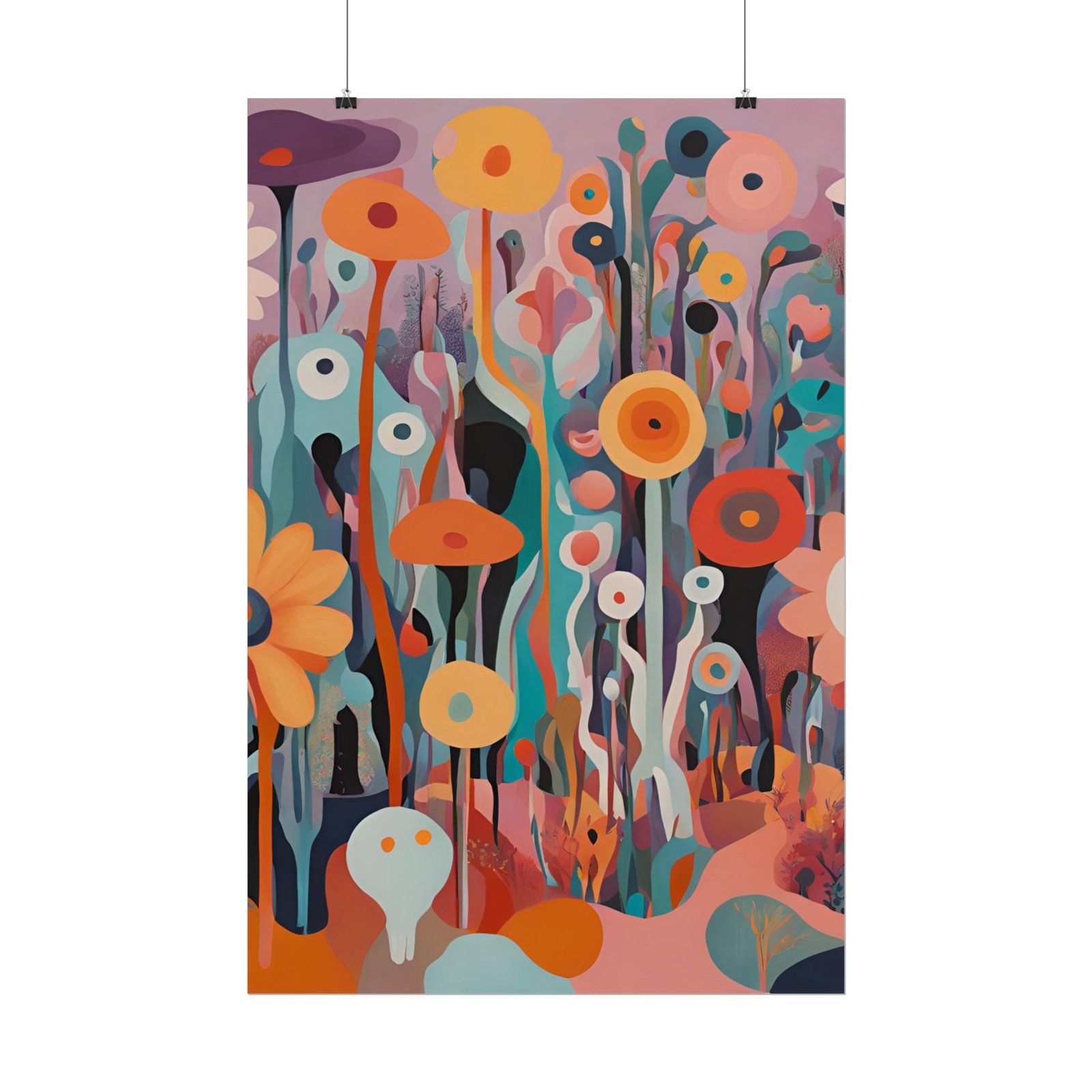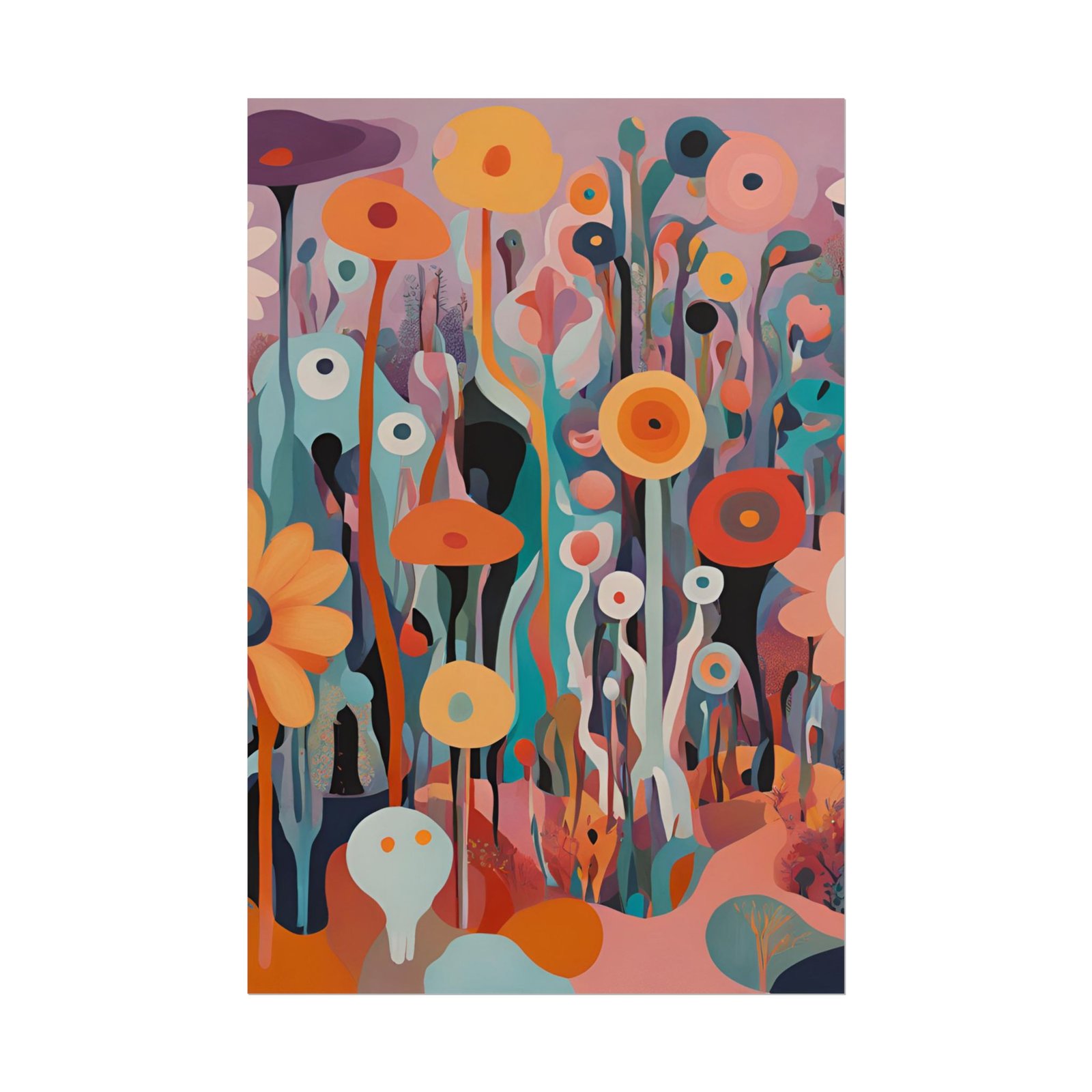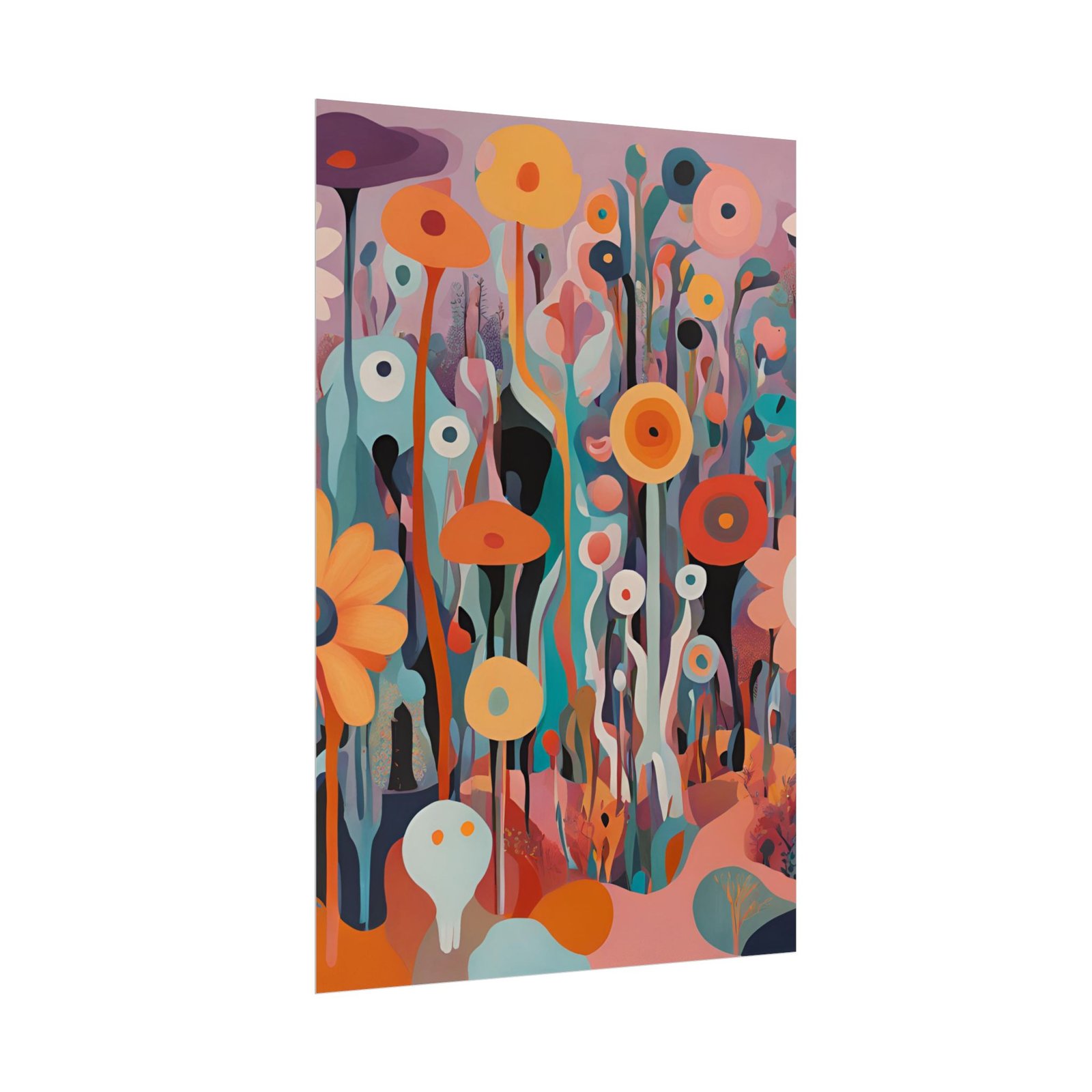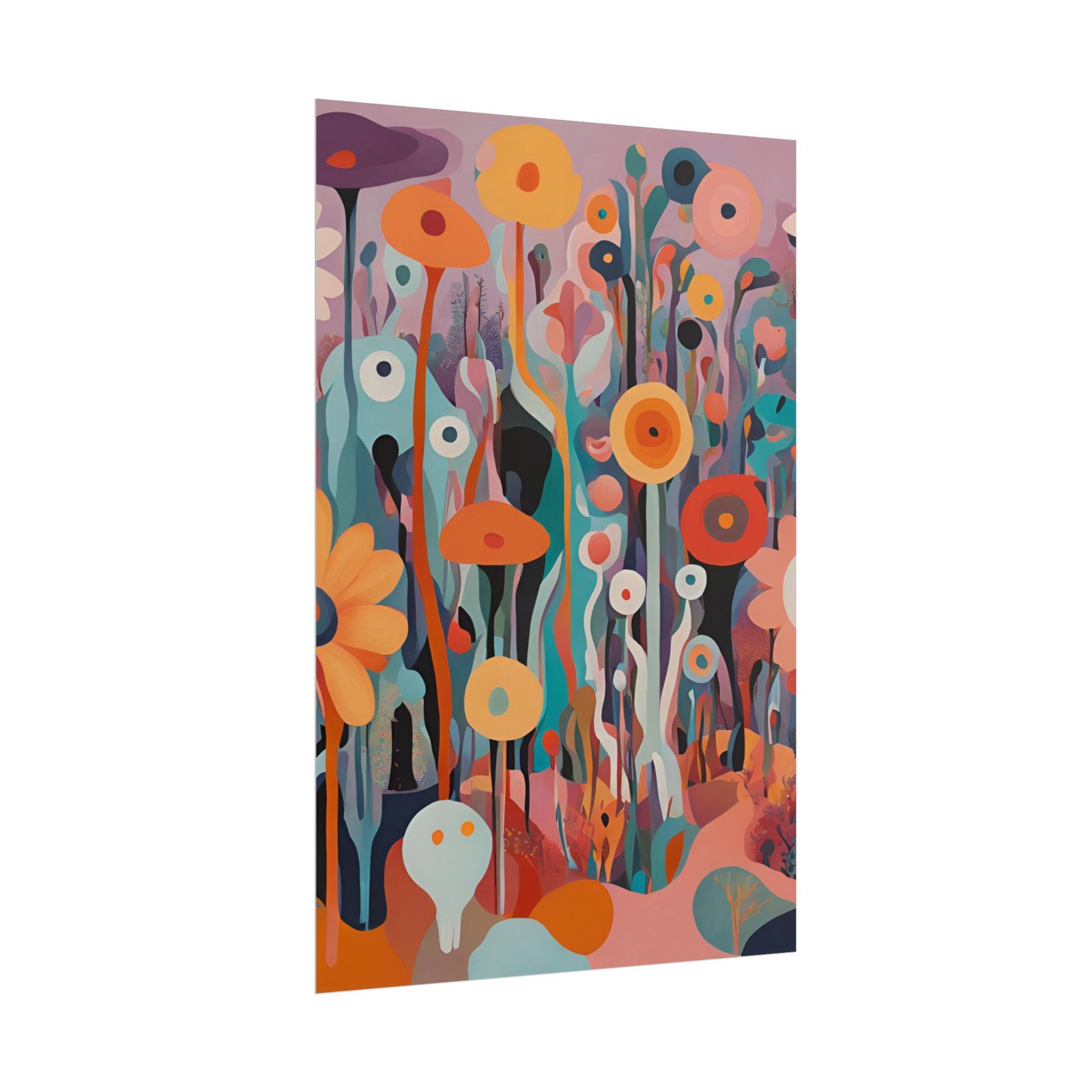 Rolled art posters that bring a dreamy, modern floral world into any room. Printed with vivid giclée inks on your choice of archival fine art, matte, or semi-glossy paper, these prints hold intense color and crisp detail so the layered shapes and warm, saturated palette stay true over time. They arrive rolled for safe shipping and unfurl into tall, vertical compositions that feel like walking through an abstract garden — playful, contemplative, and alive with color.