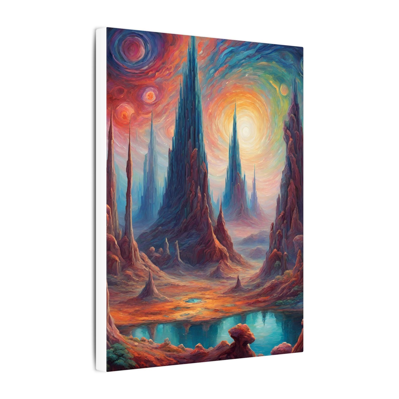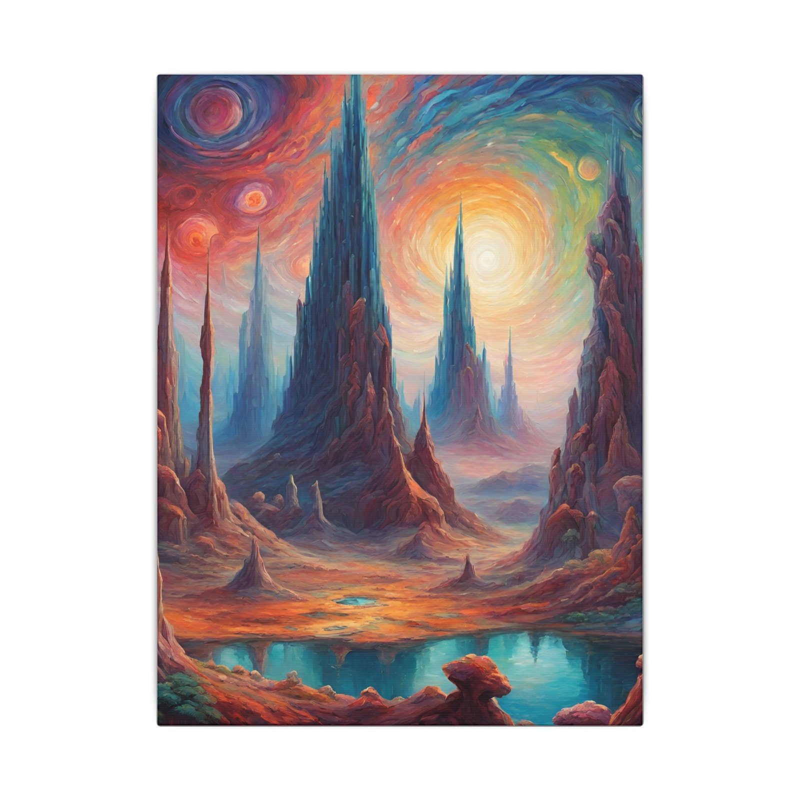 Stretching across a matte canvas, this vibrant landscape pulls the eye into a dreamy, otherworldly valley of towering spires and glowing skies. Thick, painterly swirls of teal, coral, and gold create depth and movement, while a luminous sun and distant moons add a sense of quiet wonder. Hung above a reading nook or anchored on a gallery wall, the canvas brings a meditative, adventurous mood to a room — like a window into an imagined planet where light and color tell a story. The 0.75″ stretched profile gives a clean edge that feels modern and ready to display, while the high-quality, eco-conscious materials ensure the image stays vivid for years.