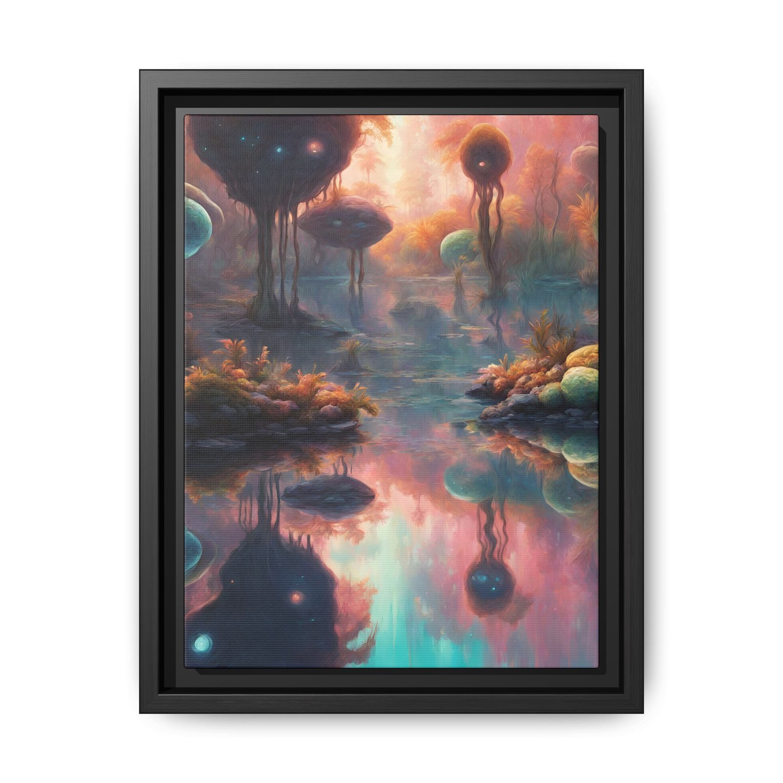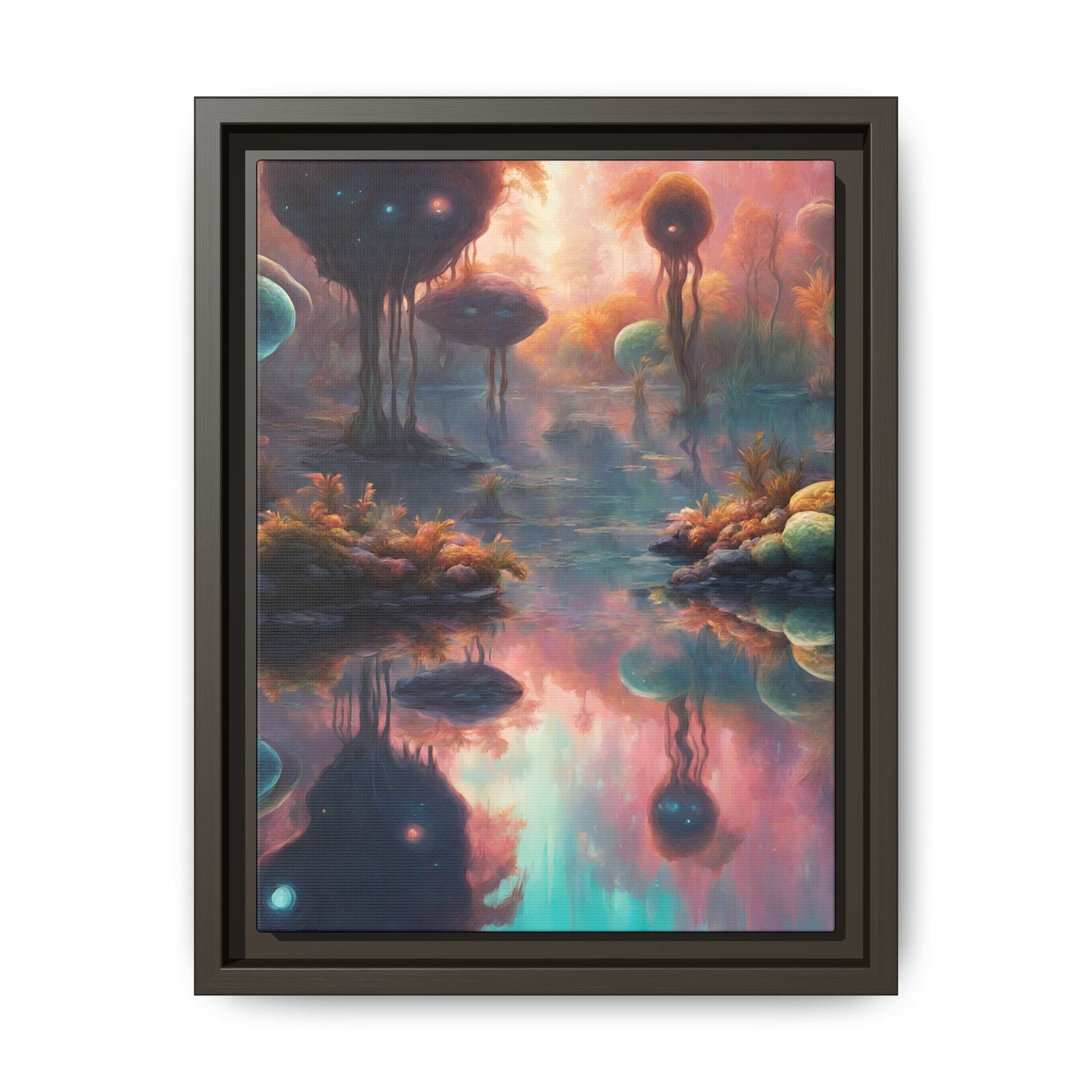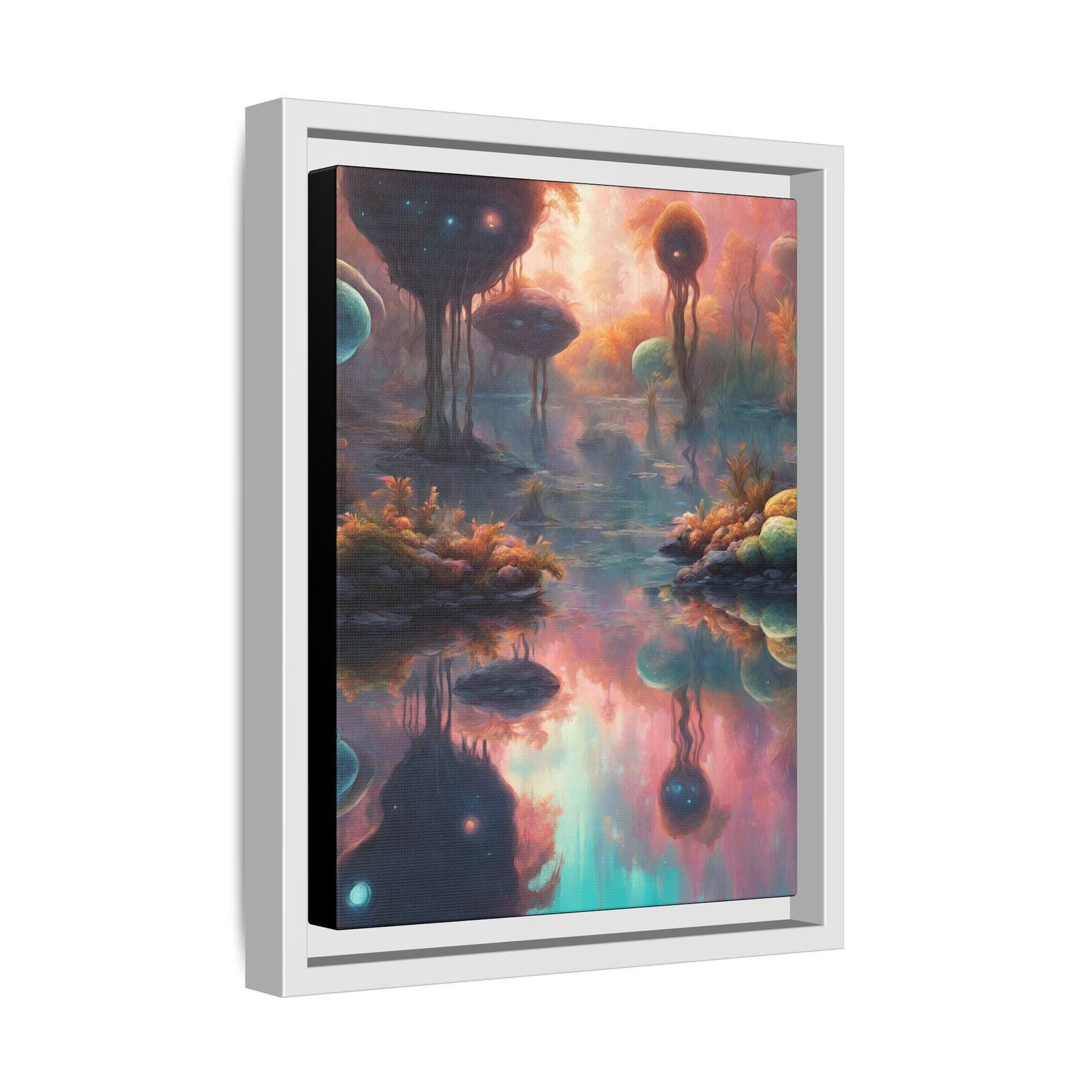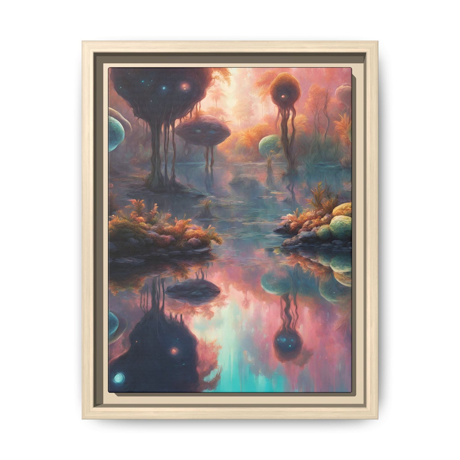 Soft light pools across an otherworldly shoreline, colors melting into mirrored reflections. This matte canvas, set in a slim pine frame, brings that dreamscape into your room with painterly depth and jewel-like hues. Hang it where you pause — over a reading nook, above a low console, or at the end of a hallway — and let the scene invite quiet curiosity and slow, thoughtful moments. The muted matte finish keeps glare low and the framed edge gives a finished, gallery feel without being showy. It’s artwork that settles into a space and rewards long looks.