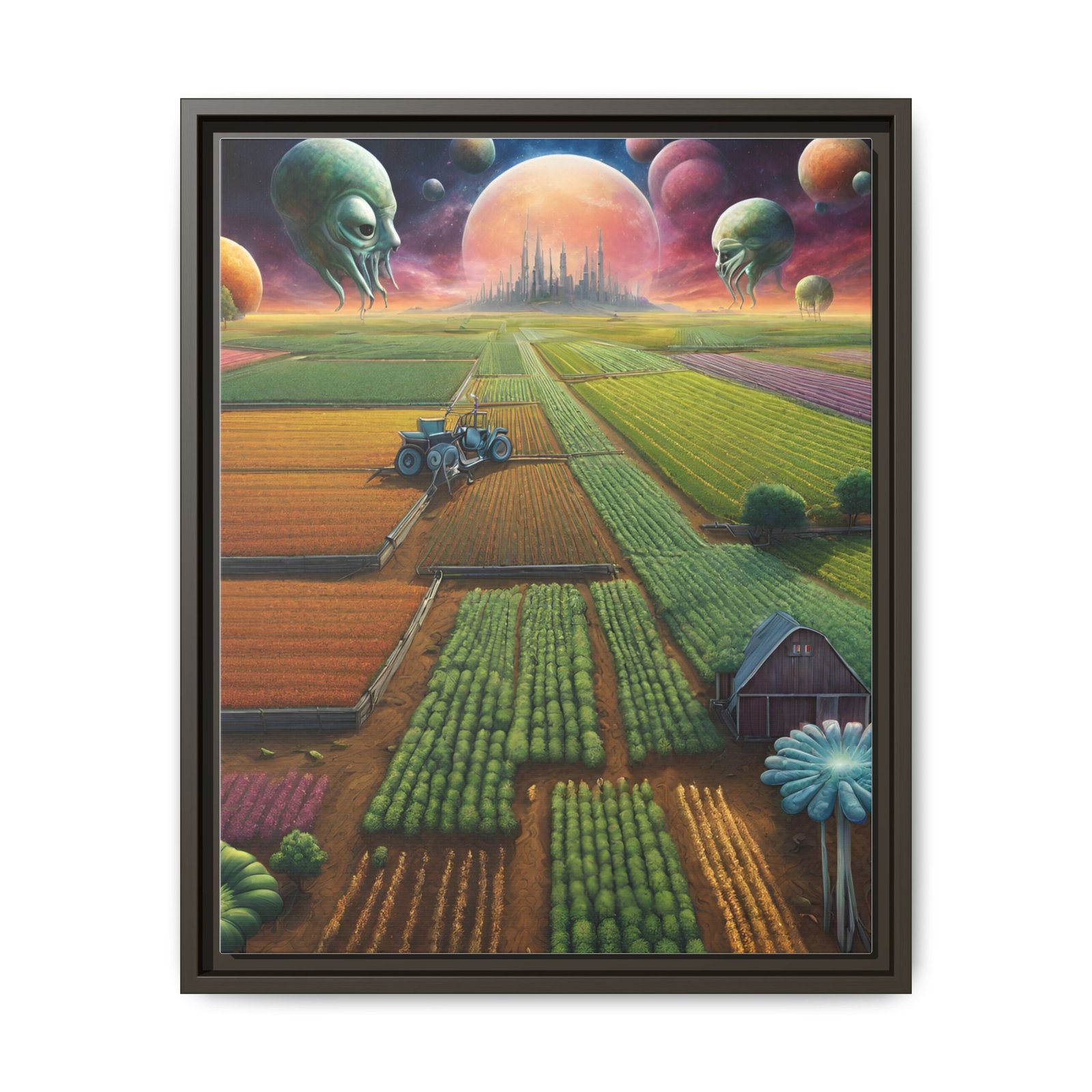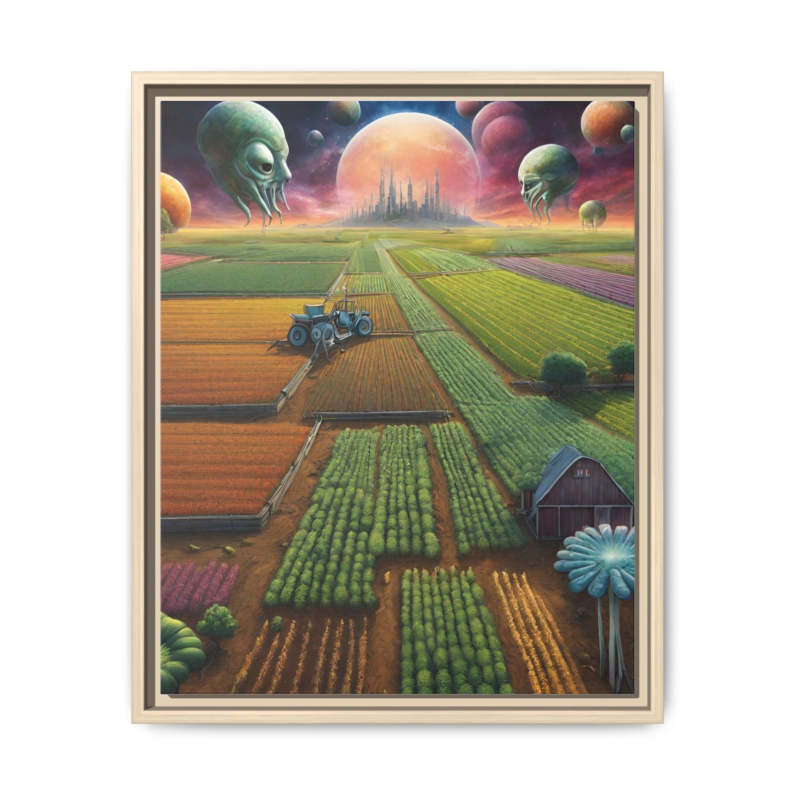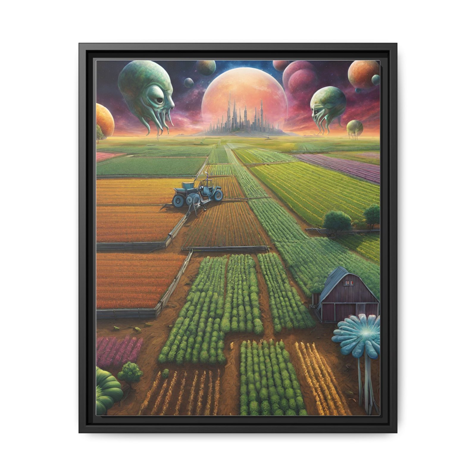 This framed matte canvas brings an otherworldly pastoral to your wall — sprawling, sunlit fields under a sky of glowing planets and watchful, gentle alien heads. The fine matte finish softens glare and deepens the painting’s rich, saturated colors while the slim pine frame gives it a clean, contemporary silhouette. , it reads like a window into a quiet, uncanny future farmstead — a piece that invites long looks and late-night daydreaming. Built with durable cotton-poly canvas, archival latex inks, and FSC-sourced pine, it’s made to keep those colors vivid and the edges crisp for years. Comes ready to hang with sawtooth hardware; multiple frame colors let you tailor it to your space.