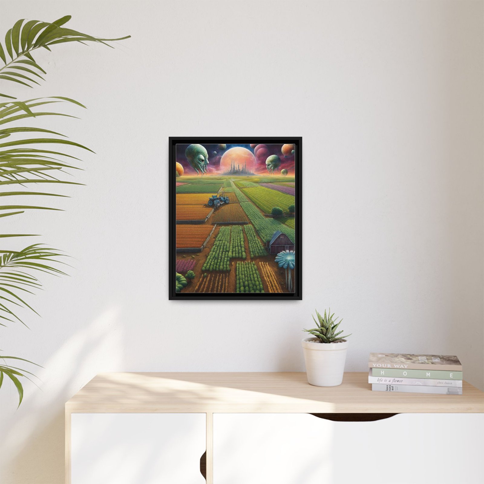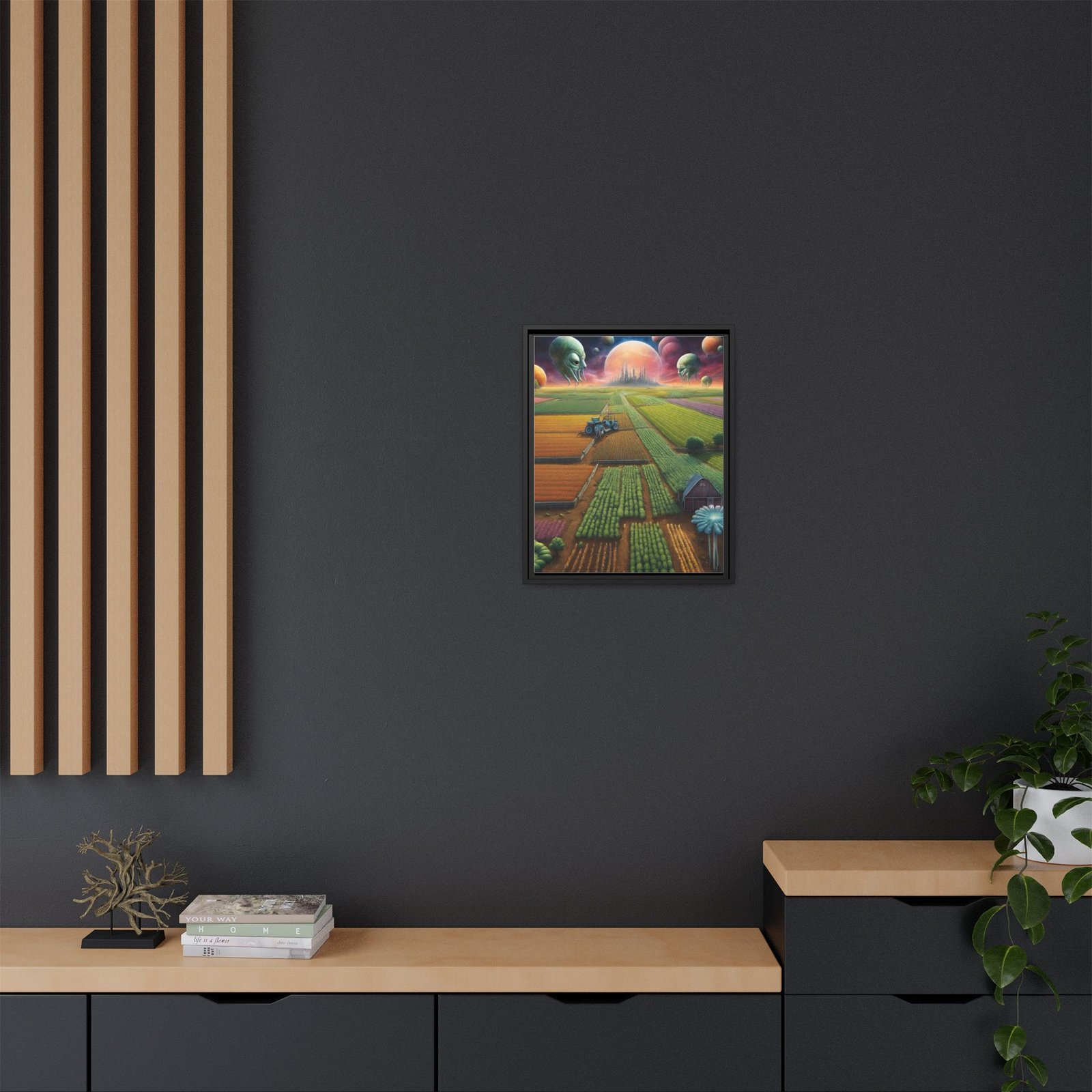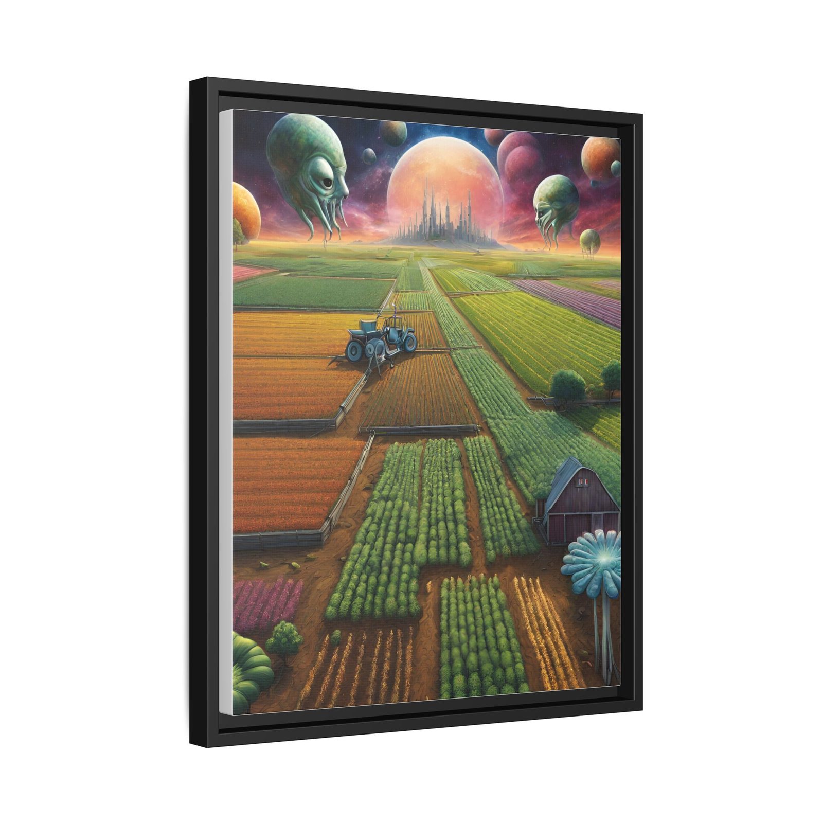 This framed matte canvas brings an otherworldly pastoral to your wall — sprawling, sunlit fields under a sky of glowing planets and watchful, gentle alien heads. The fine matte finish softens glare and deepens the painting’s rich, saturated colors while the slim pine frame gives it a clean, contemporary silhouette. , it reads like a window into a quiet, uncanny future farmstead — a piece that invites long looks and late-night daydreaming. Built with durable cotton-poly canvas, archival latex inks, and FSC-sourced pine, it’s made to keep those colors vivid and the edges crisp for years. Comes ready to hang with sawtooth hardware; multiple frame colors let you tailor it to your space.