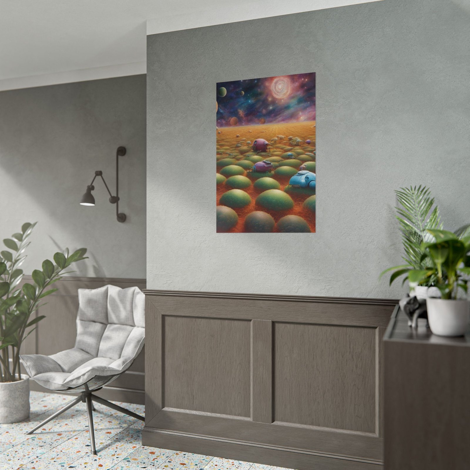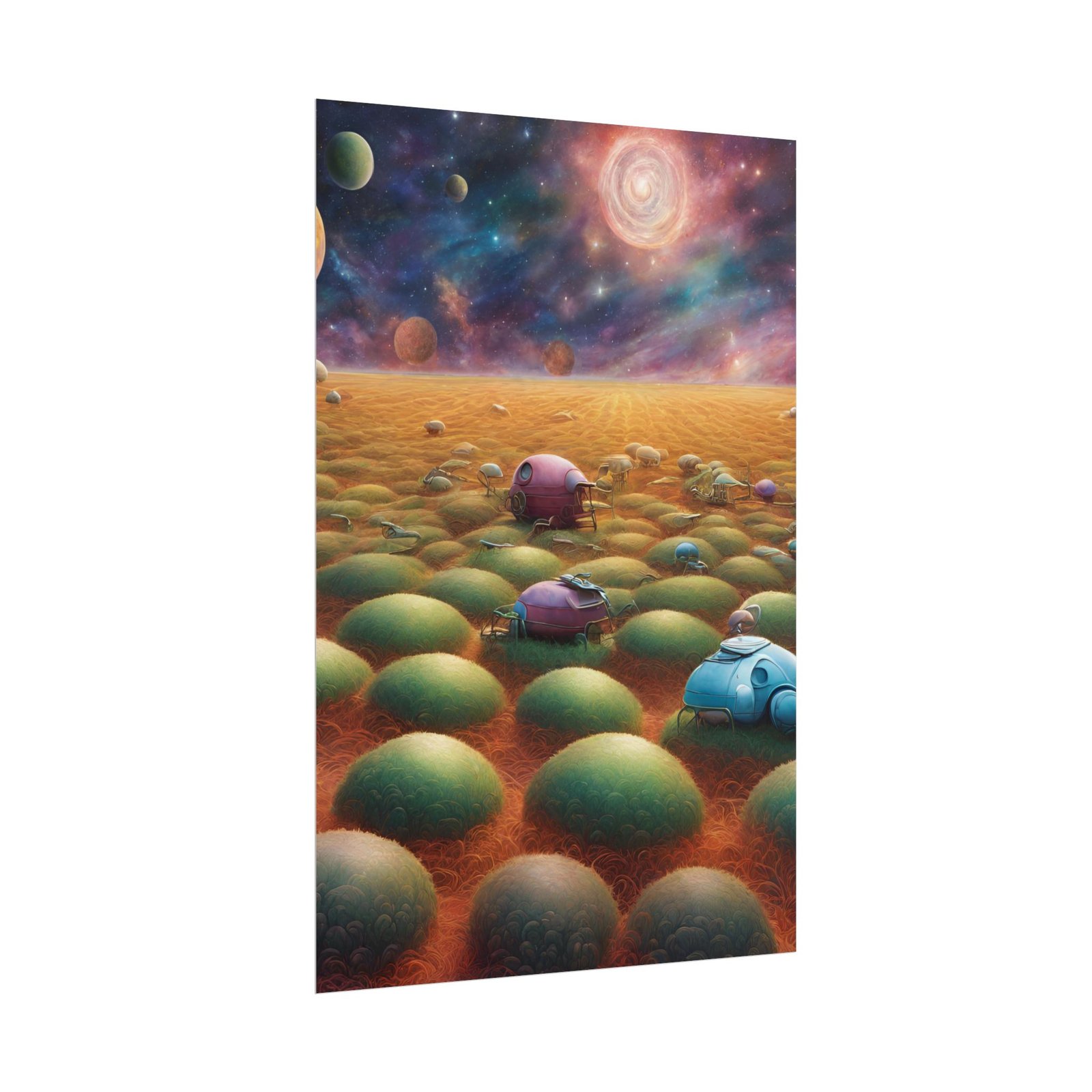 A rolled art poster that brings a whimsical, otherworldly landscape into any room. Vivid giclée color captures the glowing nebula sky and rounded, moss-like mounds with astonishing depth. Choose fine art paper for a textured, archival feel, or go matte/semi-glossy for cleaner photographic detail. Hung in a studio, bedroom, or office, this print invites quiet curiosity — the kind that lingers after you turn off the lights and let the mind wander through alien fields and tiny, curious vehicles. It reads like a page from a dream journal: nostalgic, strange, and quietly hopeful.