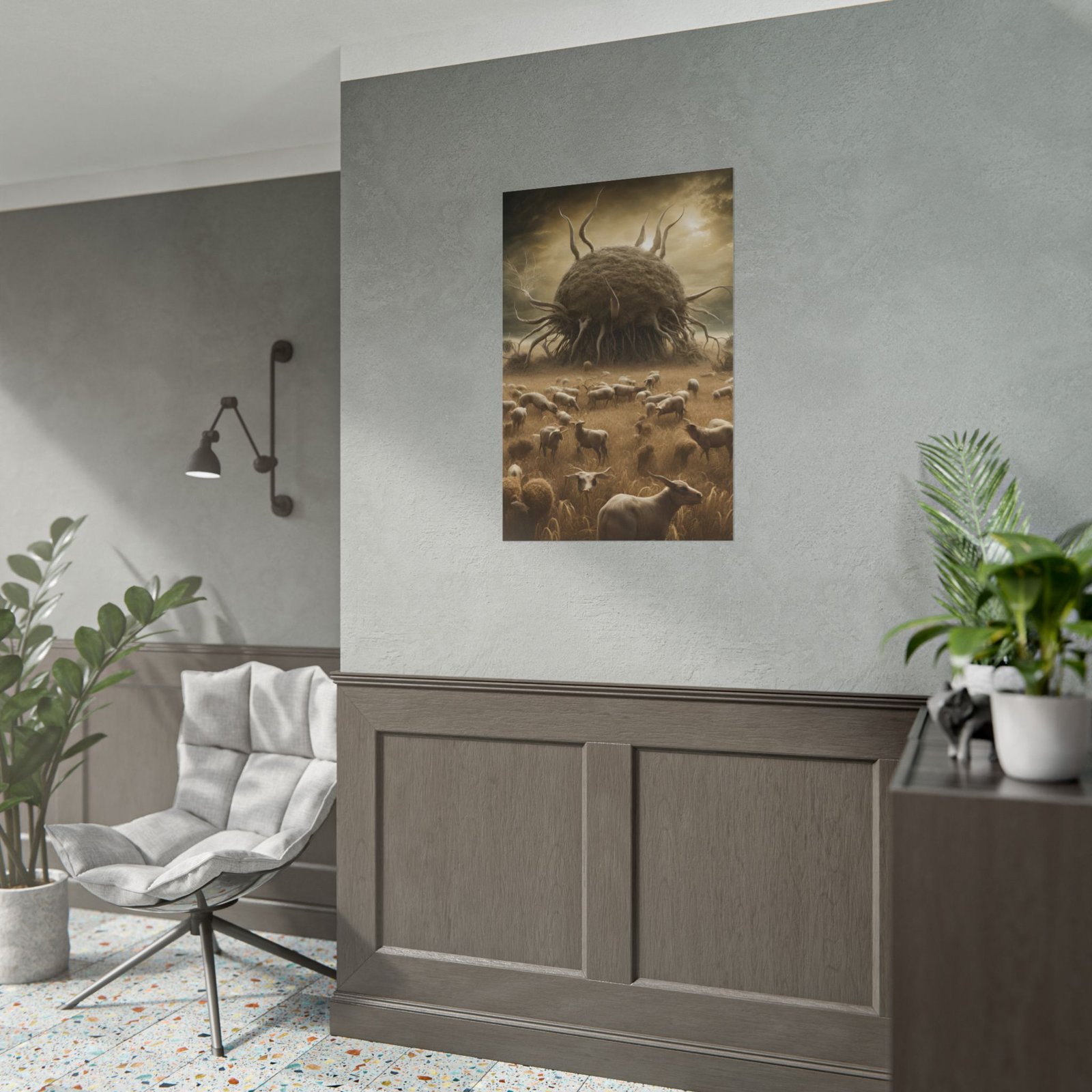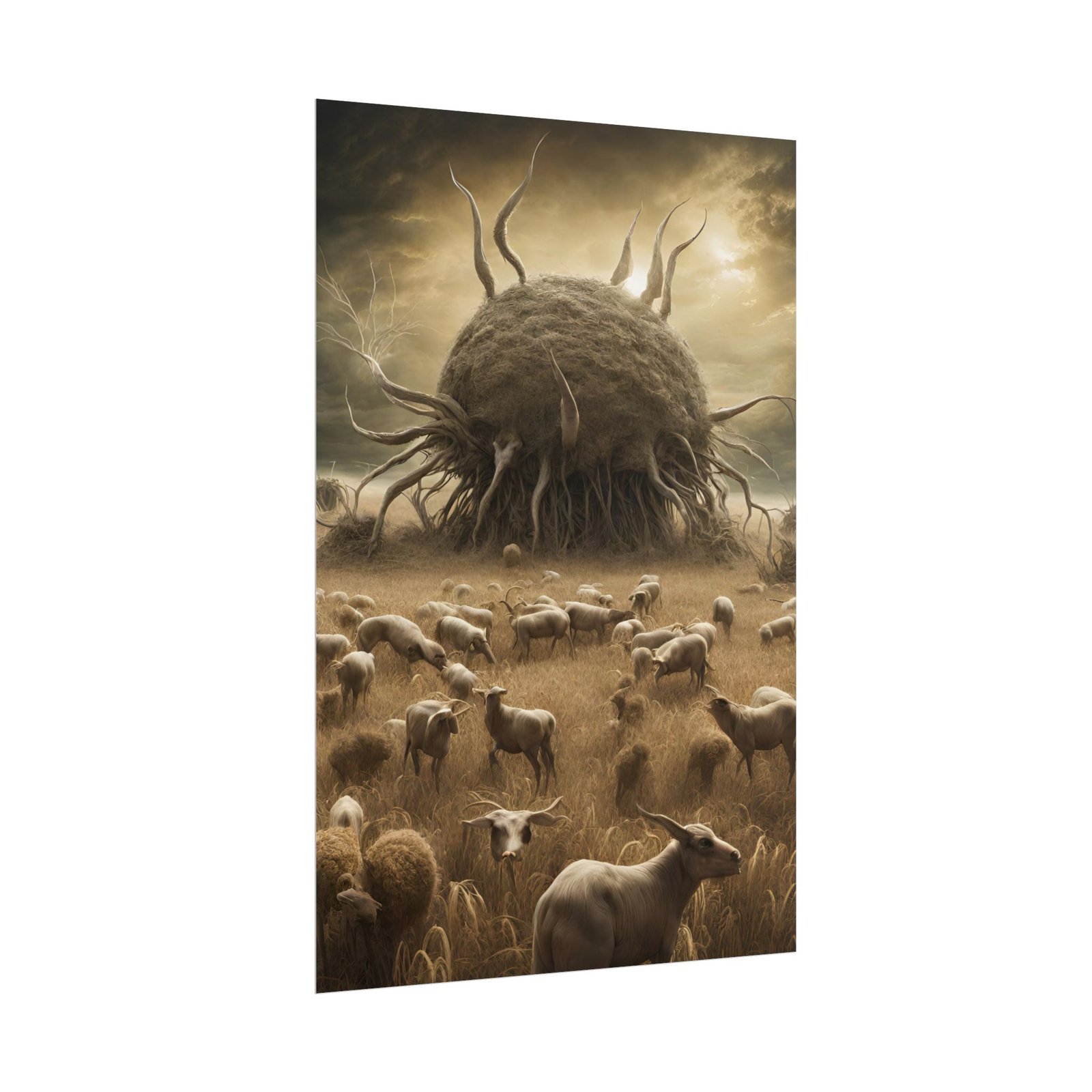 This rolled poster brings a haunting, cinematic scene to your walls — a vast field of sheep under an ominous, otherworldly growth rising in the distance. Printed with archival inks, the artwork keeps deep sepia tones and subtle highlights true, so the eerie mood and fine painterly texture remain vivid over time. Choose fine art paper for a soft, textured, gallery feel; matte for a low-sheen, art-forward look; or semi-glossy for brighter whites and sharper color fidelity. Available in multiple sizes and orientations so you can mount it in a narrow hallway or center it as a striking focal piece in a living room or studio.