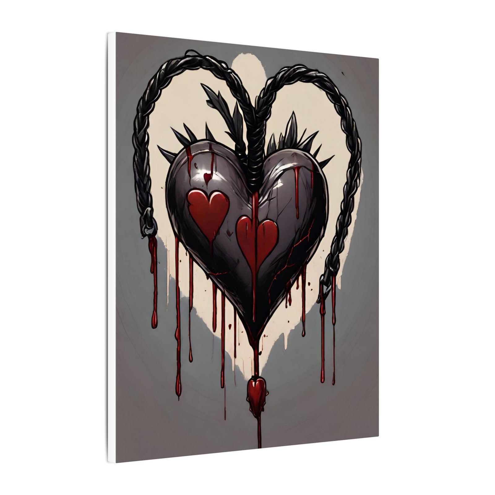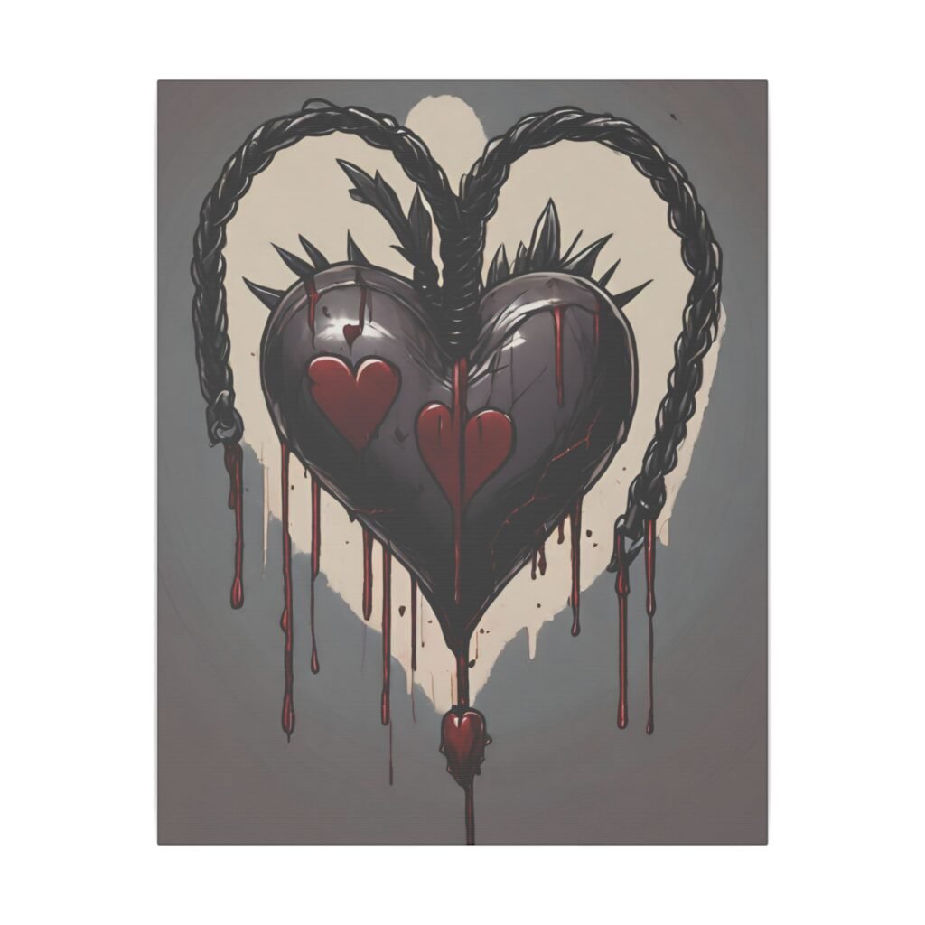 This stretched matte canvas brings a dark, emotive energy into any room. A black, braided heart drips deep red, its twin red heart accents and thornlike spikes cutting a striking silhouette against a muted gray-beige backdrop. The heavy, painterly drips and glossy highlights feel visceral and handcrafted, while the museum-style matte finish keeps reflections low and colors rich. Hang it above a bedside table, in a music room, or in a moody gallery wall to anchor a space with raw, romantic intensity.