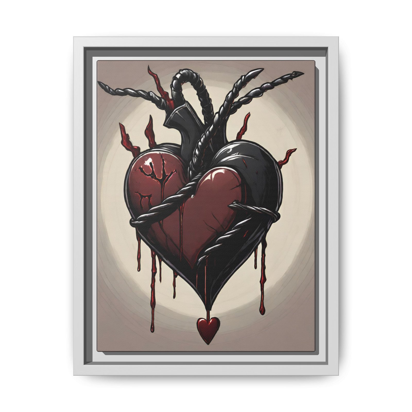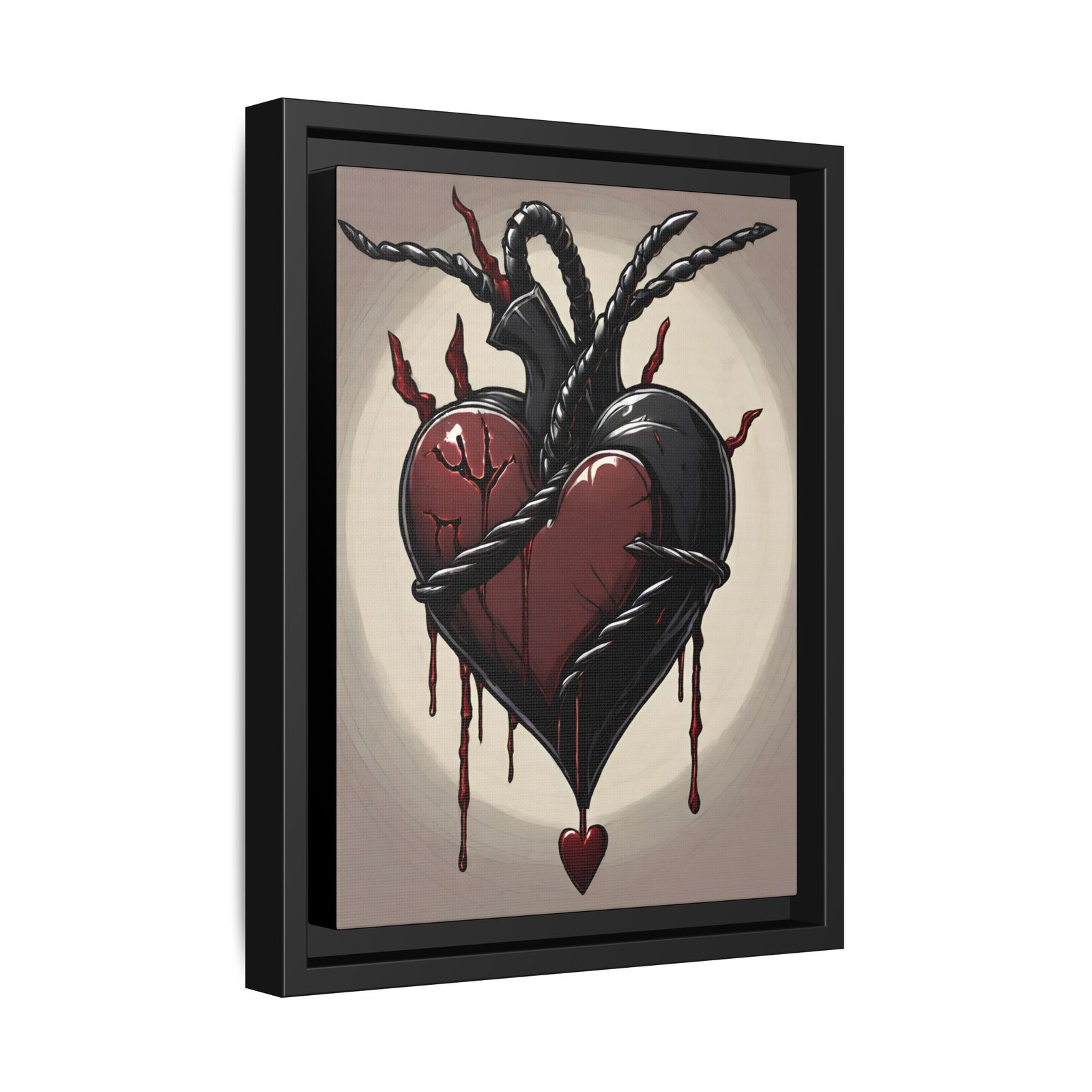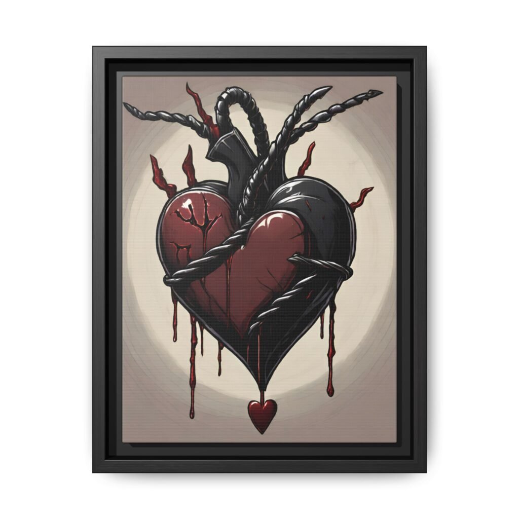 Framed Dark Heart Canvas Print — Gothic Dripping Heart Wall Art. A bold, framed matte canvas print that brings dark-romantic energy to any room. The artwork features a cracked, bleeding heart wrapped in twisted black ropes and tendrils—moody, tactile, and full of movement. The black pine frame adds depth and a gallery-ready presence while the matte finish keeps glare low and colors richly saturated. Hang it in a bedroom, studio, or living space where intense, emotional art is part of the atmosphere.