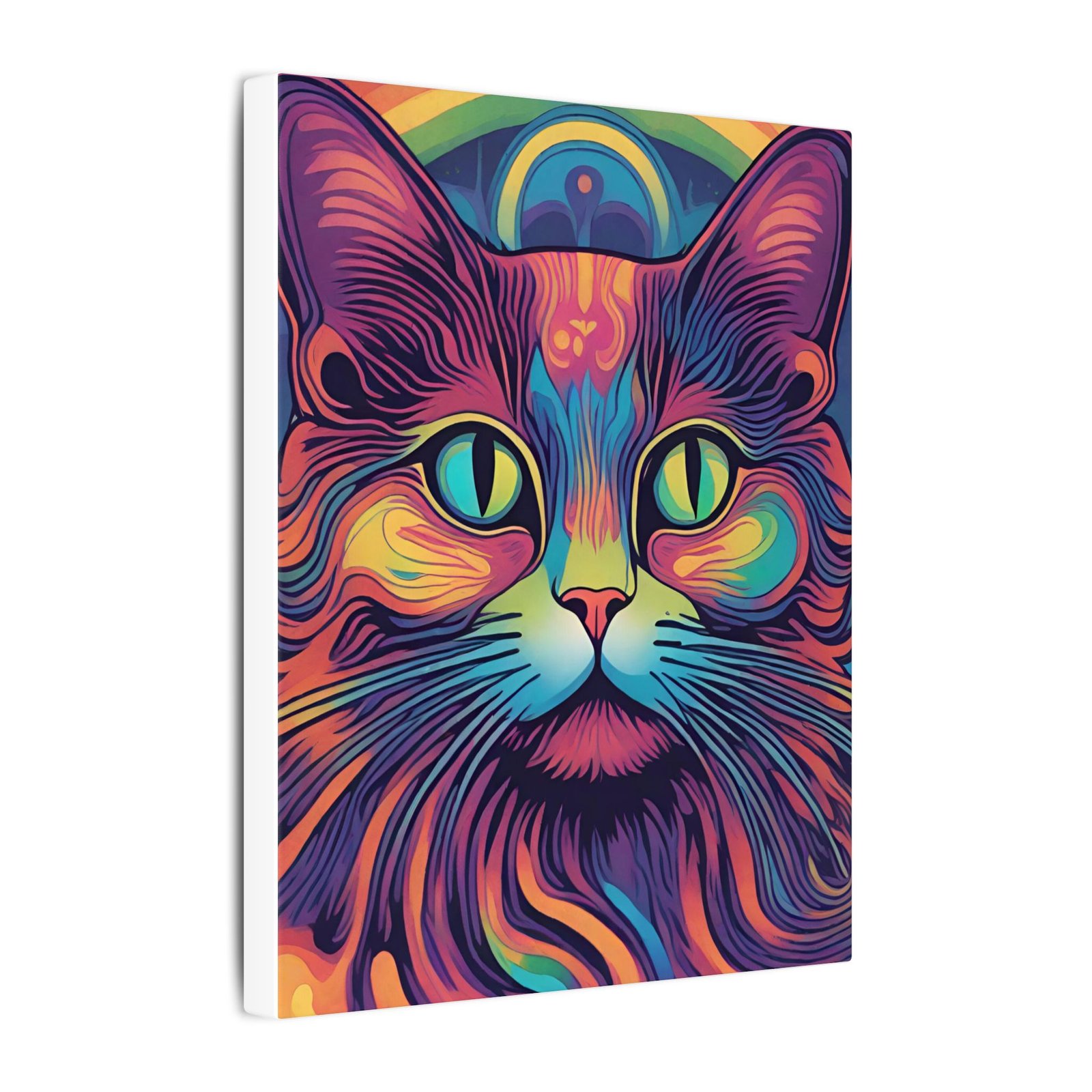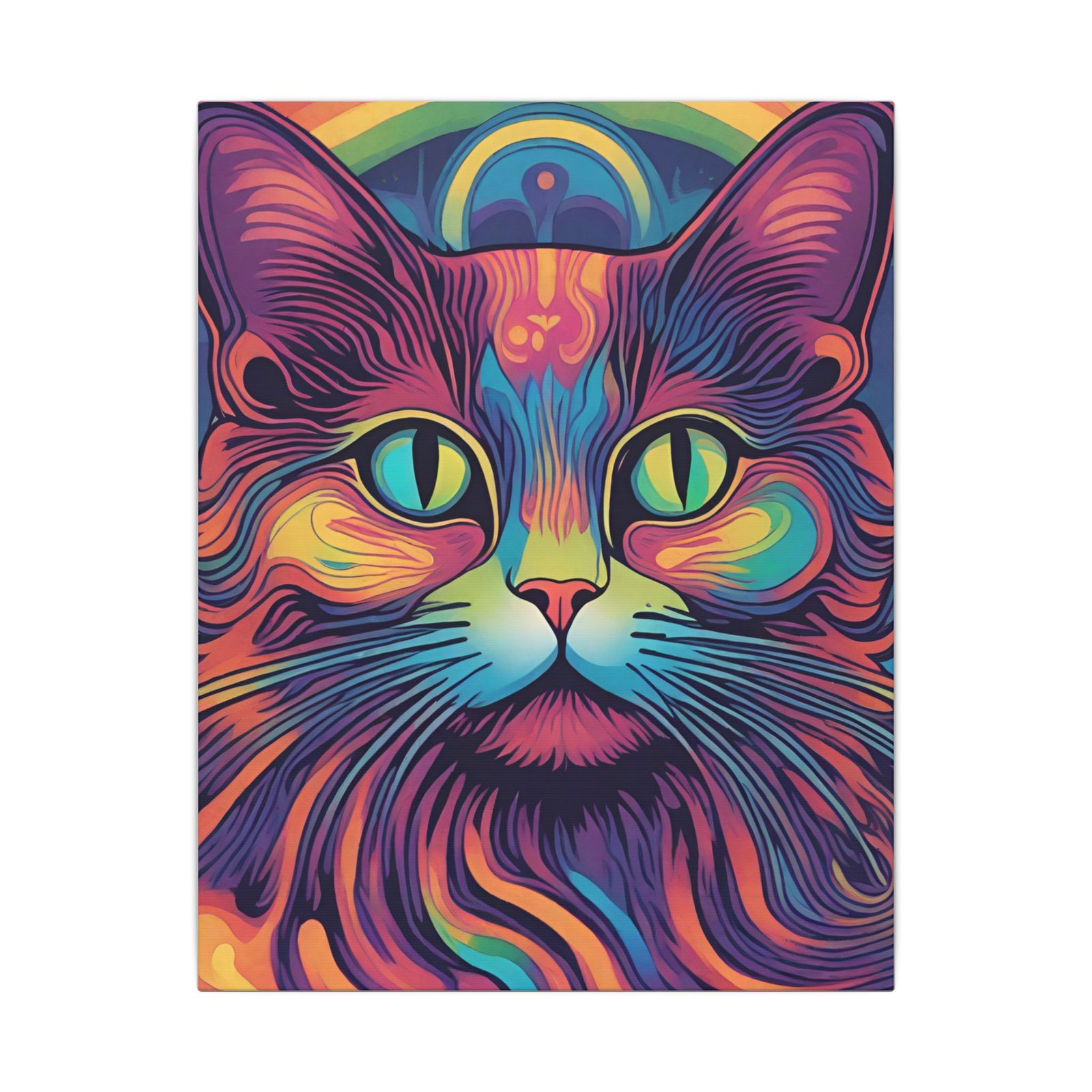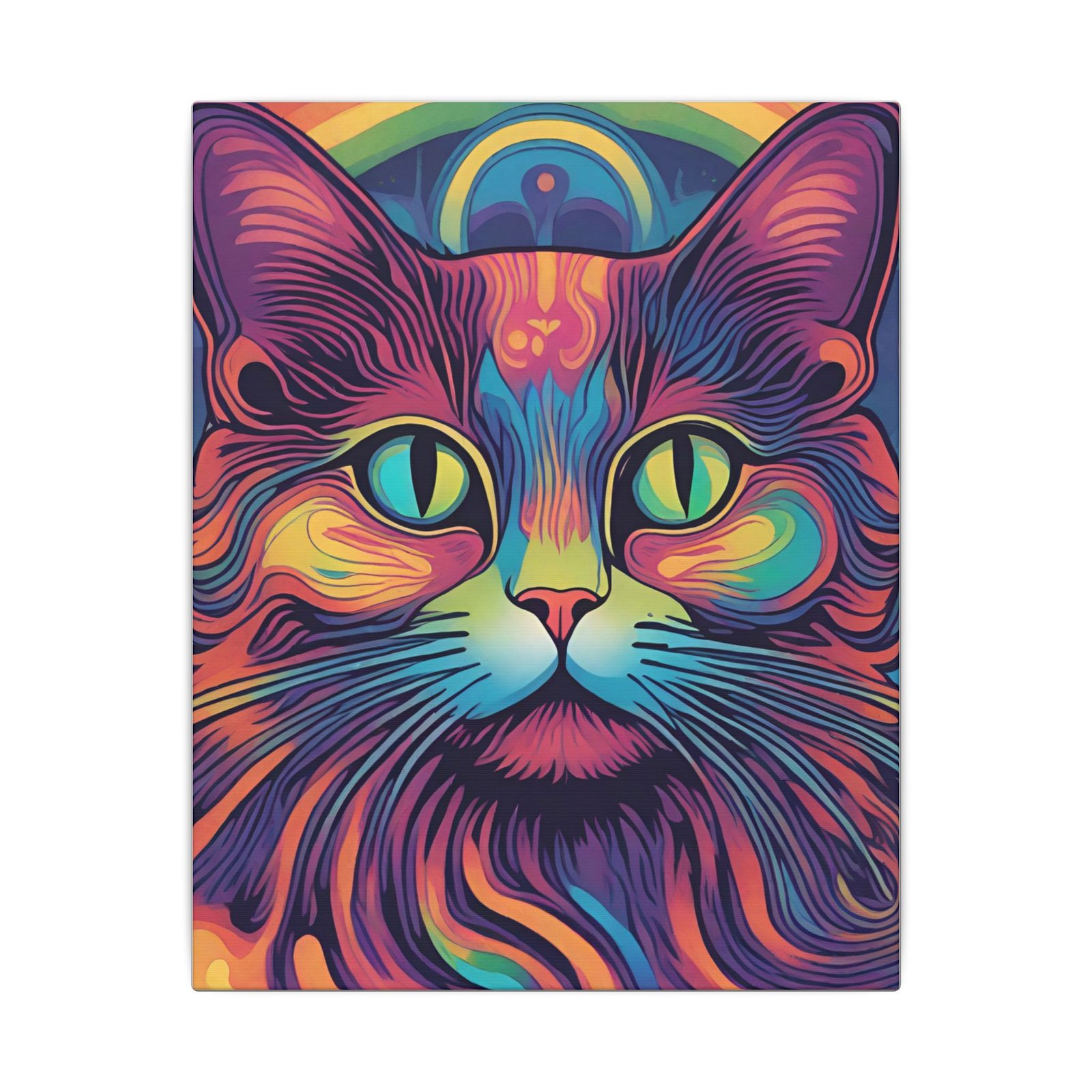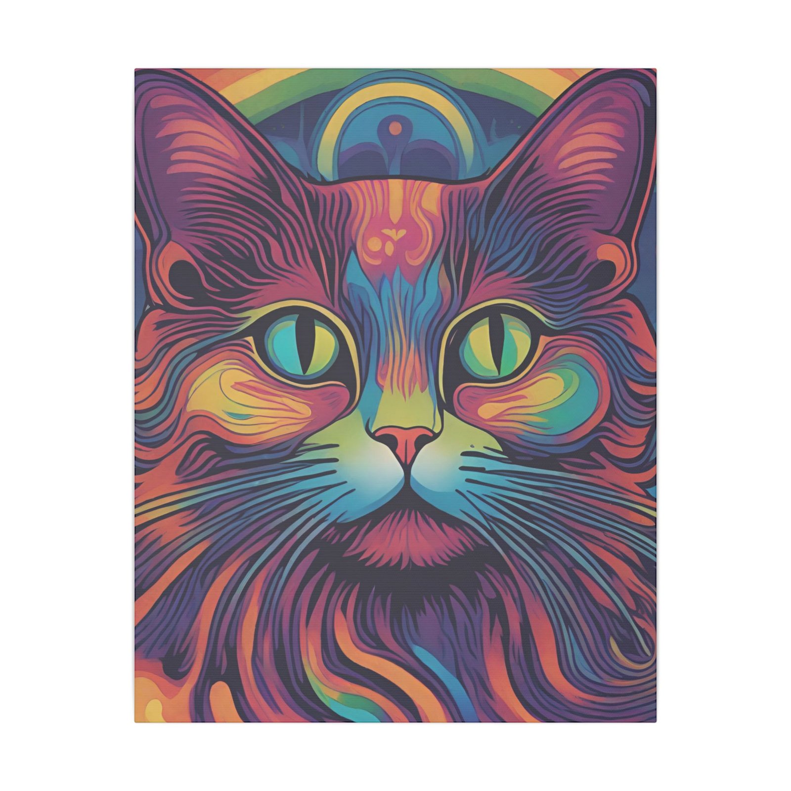 Embrace the psychedelic vibes with this unique Psychedelic Cat Matte Canvas. Perfect for cat lovers and those who enjoy colorful and whimsical artwork. This canvas print will add a pop of personality to any living space, making it a great conversation starter. Ideal for gifting during birthdays, holidays, or housewarmings.
