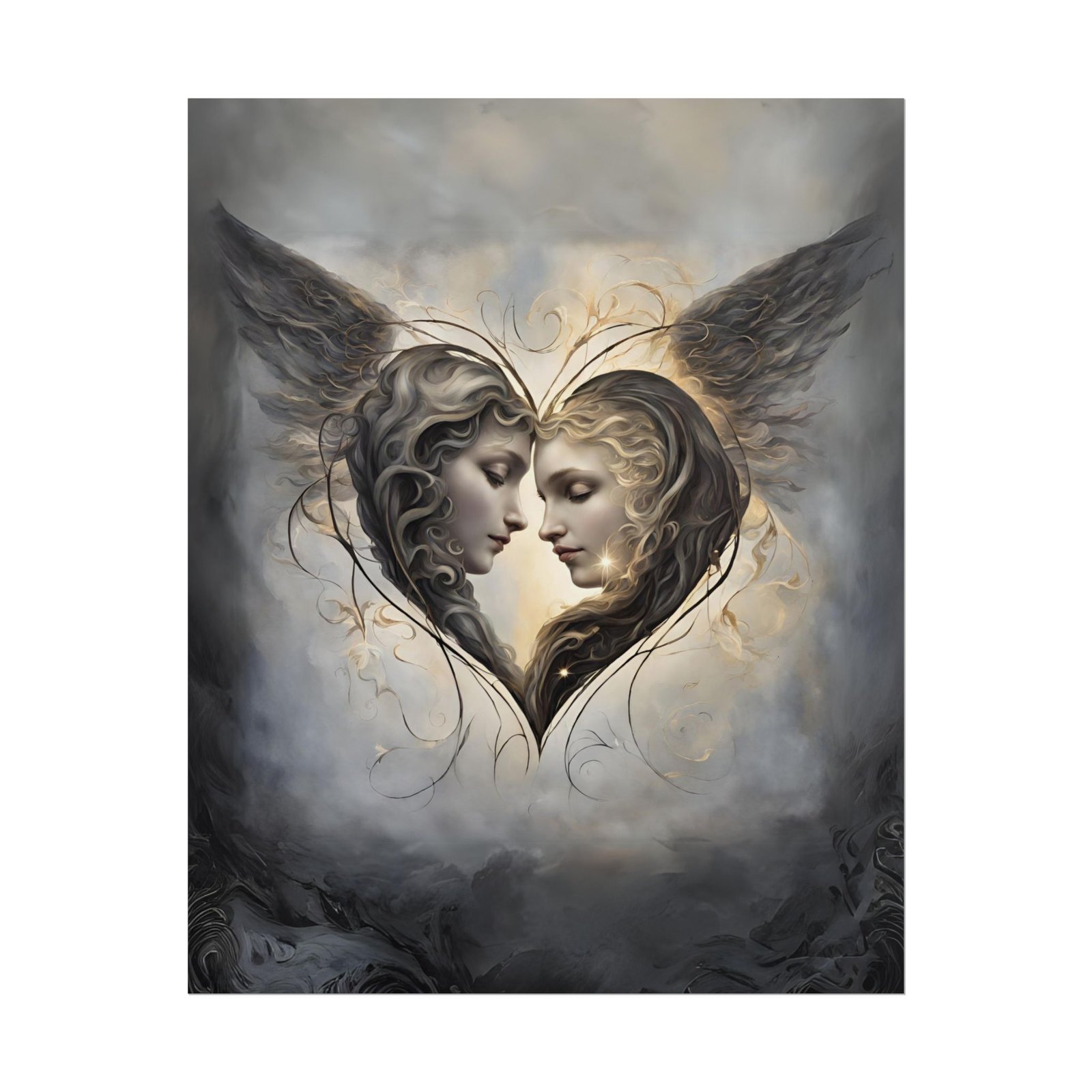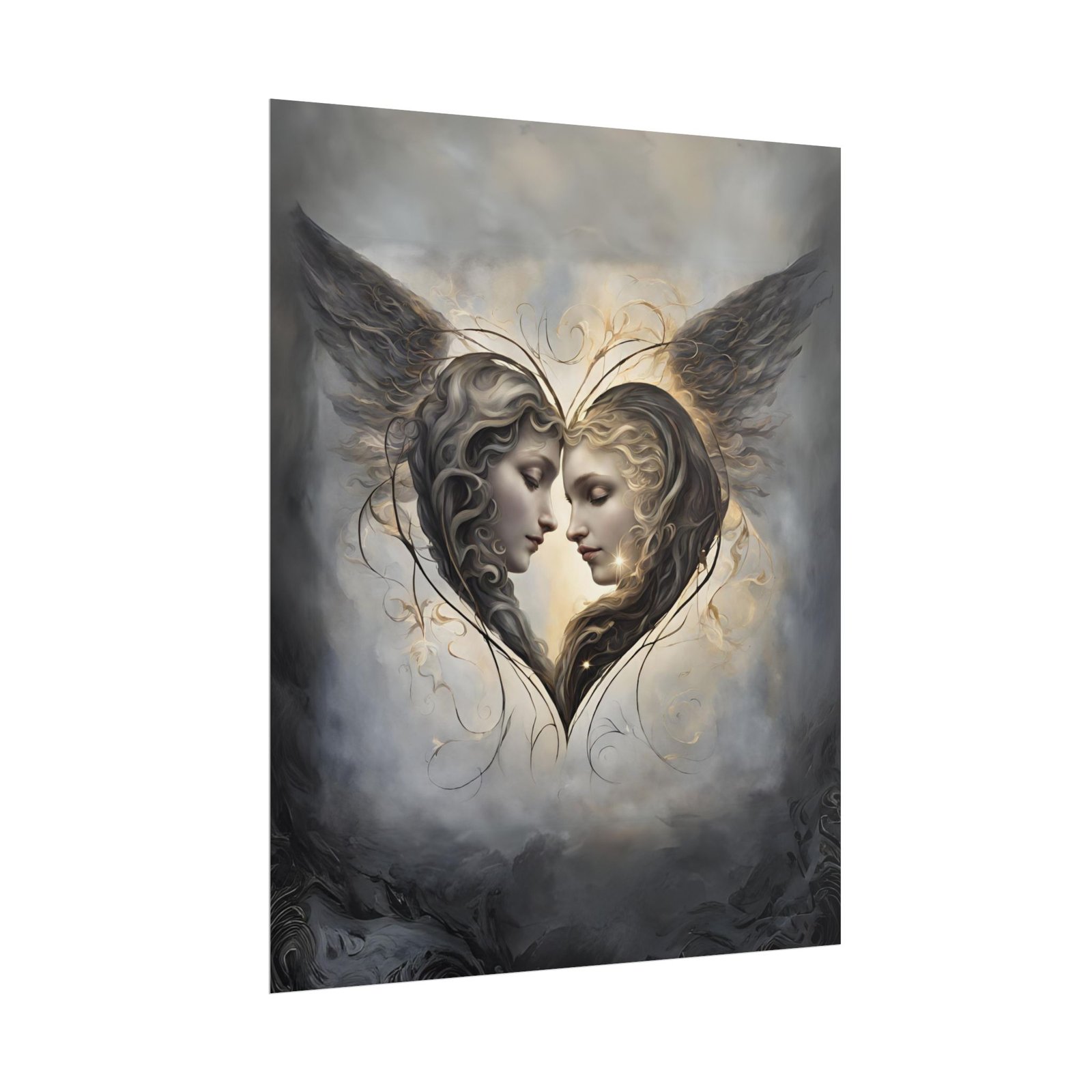 A beautiful Poster featuring two Angels inside a heart with wings, giving a peaceful and heavenly vibe. Perfect for those who appreciate angelic imagery and religious symbolism. Ideal for decorating homes during Christmas, Easter, or for religious occasions.