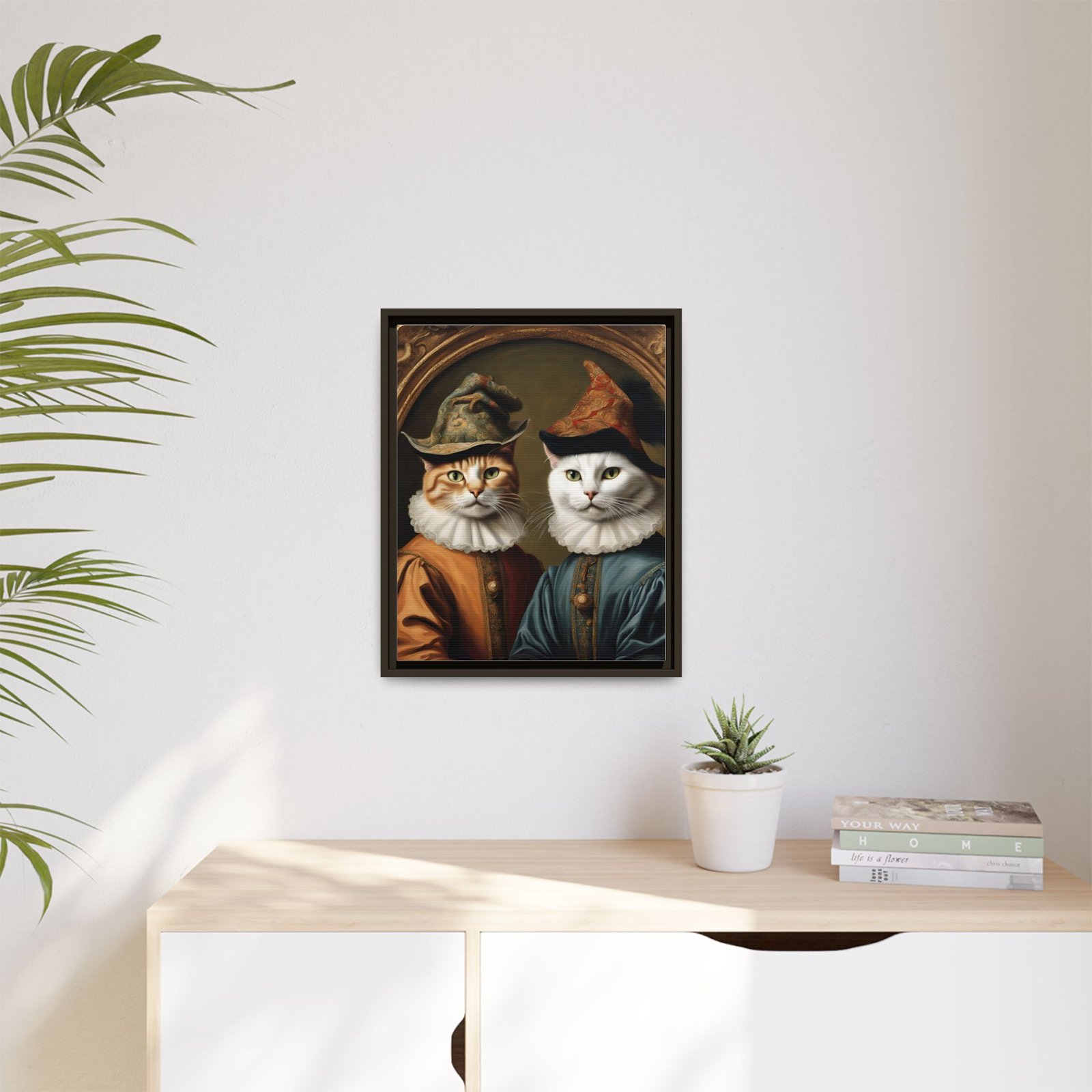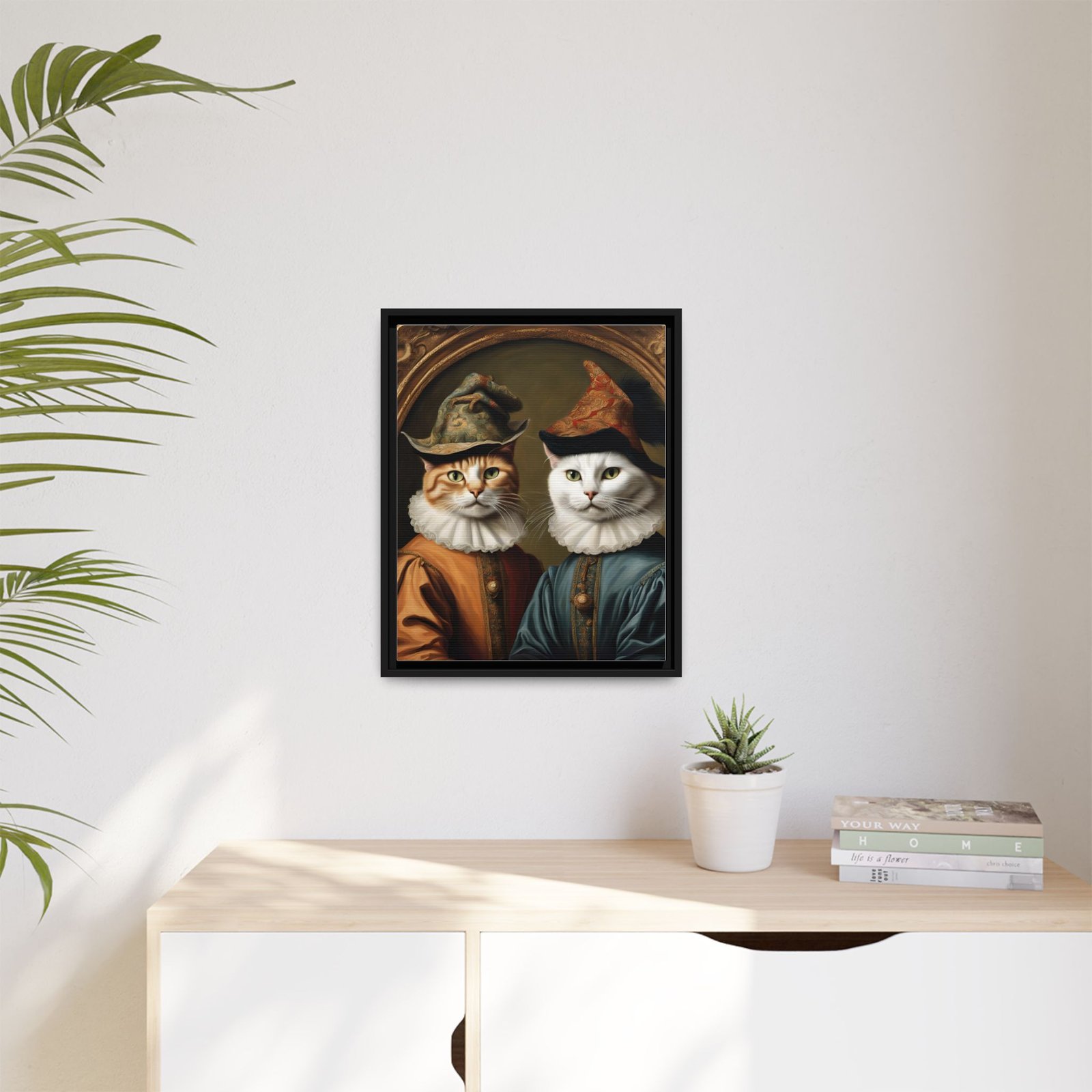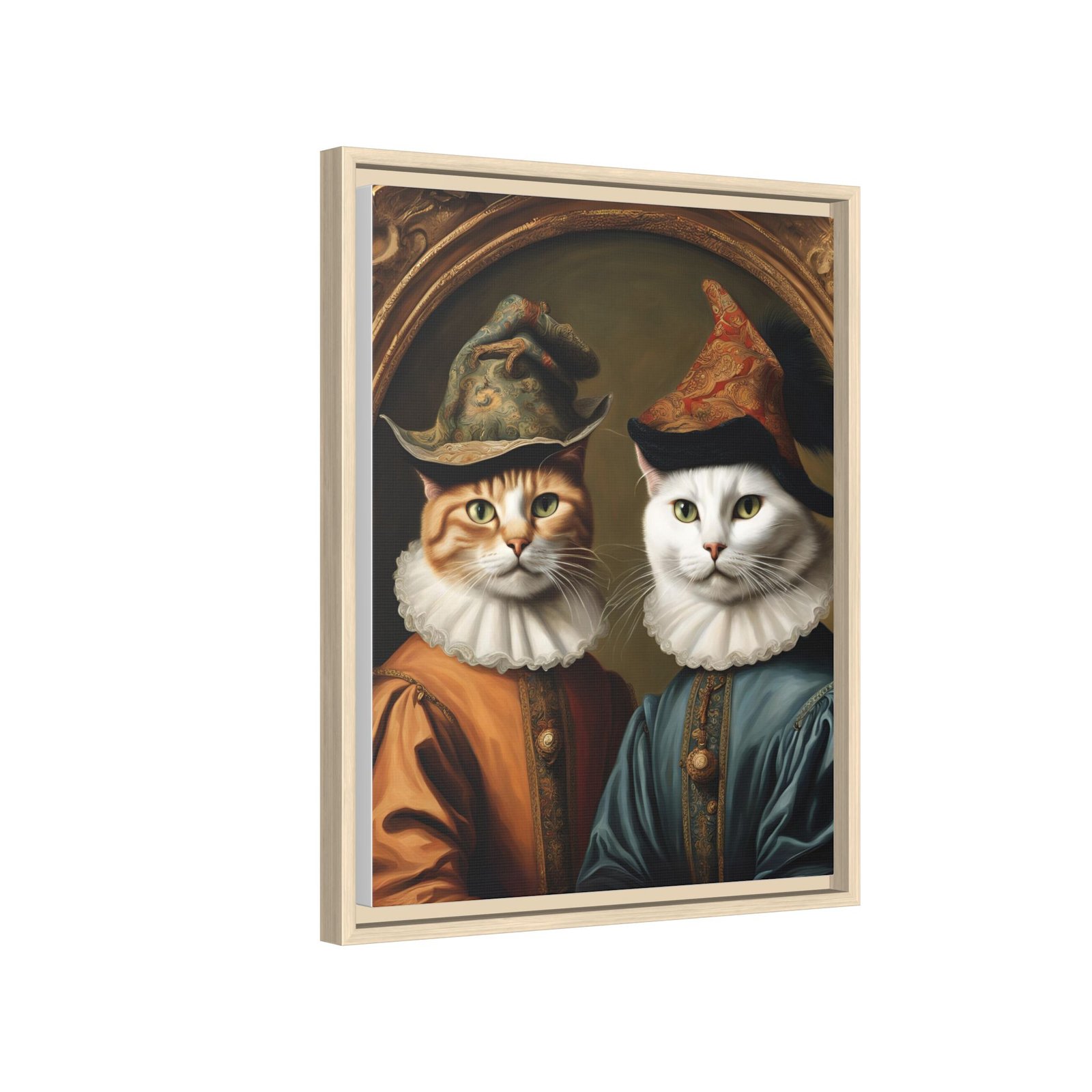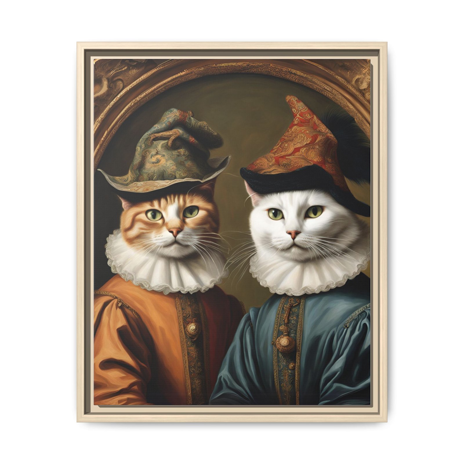 Two regal felines, reimagined as Renaissance courtiers, come to life on a matte, framed canvas that blends old-world charm with playful personality. Rich, painterly tones and crisp detail are preserved by JONDO’s specialty coating and UL-certified Greenguard Gold latex inks, giving the artwork warmth and depth without harsh shine. The slim pine frame adds a subtle, handcrafted edge that makes this piece feel like it belongs in a cozy study or gallery wall. Hang it to anchor a reading nook, living room vignette, or entryway — it brings a wink of humor and a sense of history to everyday spaces.