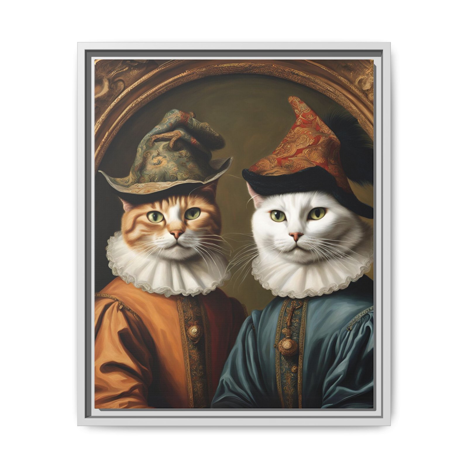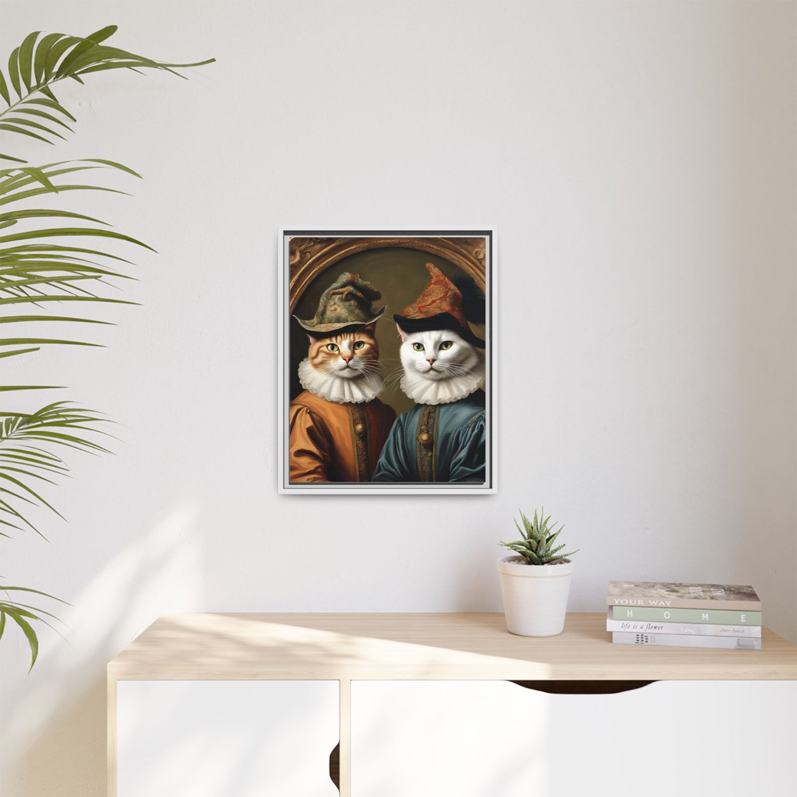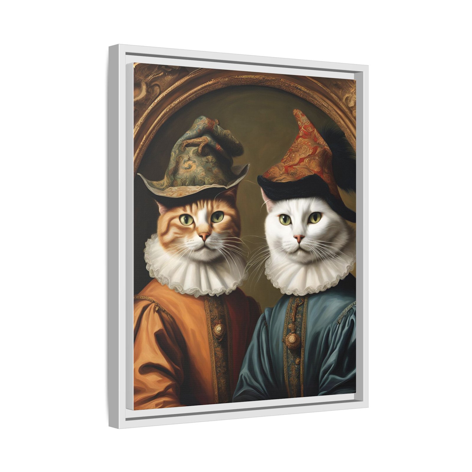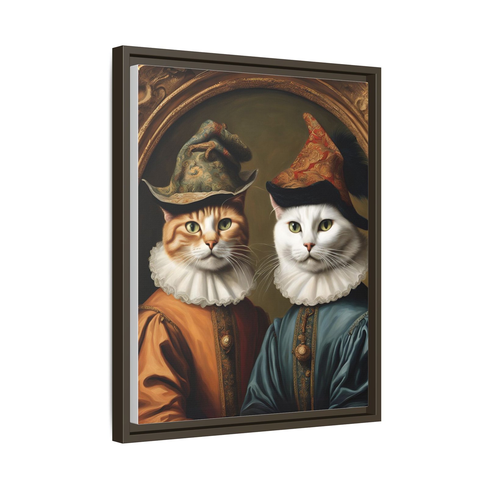 Two regal felines, reimagined as Renaissance courtiers, come to life on a matte, framed canvas that blends old-world charm with playful personality. Rich, painterly tones and crisp detail are preserved by JONDO’s specialty coating and UL-certified Greenguard Gold latex inks, giving the artwork warmth and depth without harsh shine. The slim pine frame adds a subtle, handcrafted edge that makes this piece feel like it belongs in a cozy study or gallery wall. Hang it to anchor a reading nook, living room vignette, or entryway — it brings a wink of humor and a sense of history to everyday spaces.