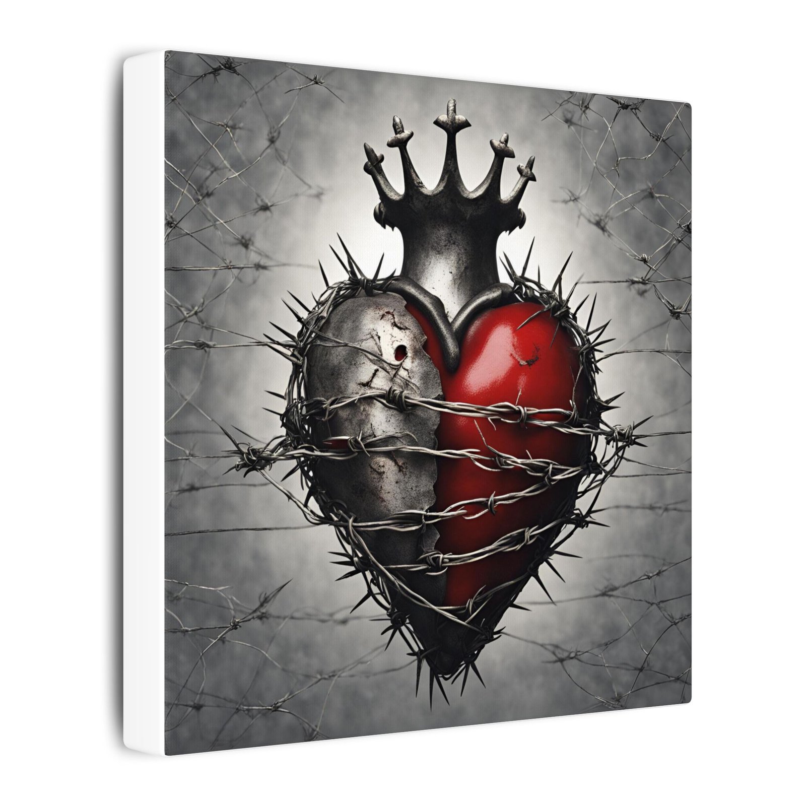 This stretched matte canvas brings a bold, dramatic focal point to any space. A stylized sacred-heart motif—half battered steel, half glossy red—sits wrapped in barbed wire beneath a worn crown. The muted grayscale background with high-contrast reds reads like a modern icon: raw, devotional, and a little fierce. Printed with Greenguard Gold certified inks on a heavy cotton-poly canvas and stretched over sustainably sourced radiata pine, it looks gallery-finished from every angle. The slim 0.75″ depth keeps the silhouette clean while the soft rubber corner dots protect surfaces and hold the piece steady on the wall. Hang it in a studio, entryway, or above a bedside shelf to add moody, emotional presence.