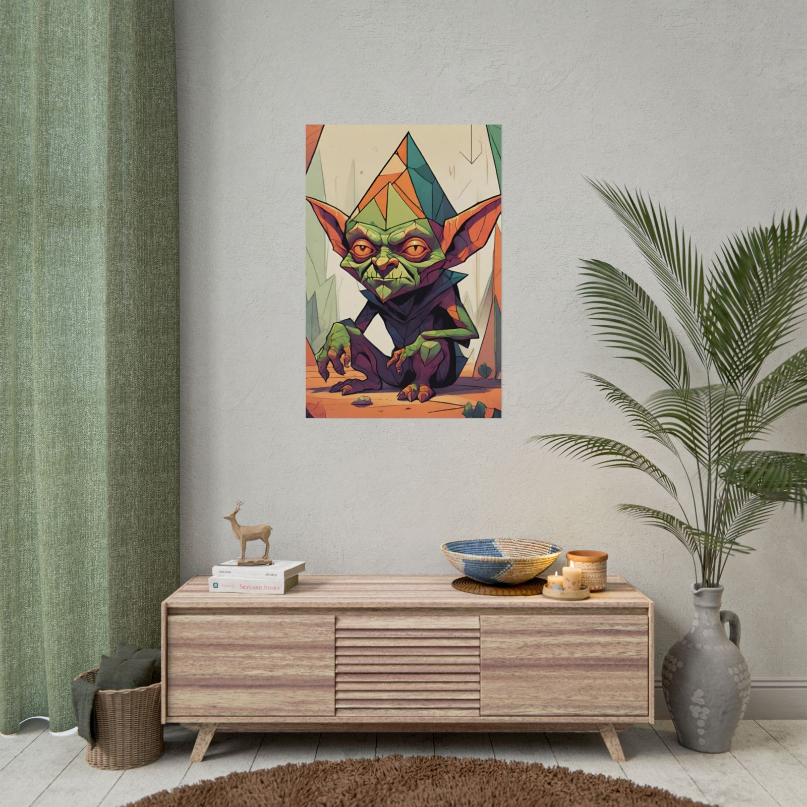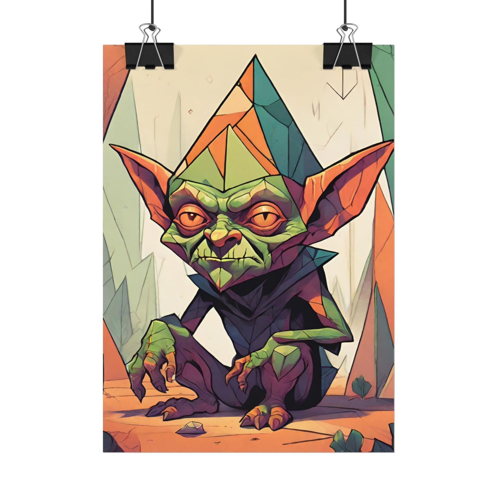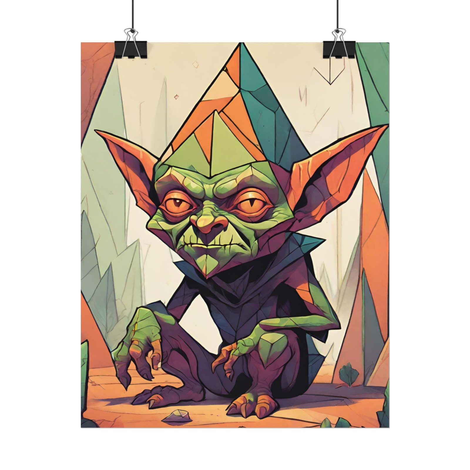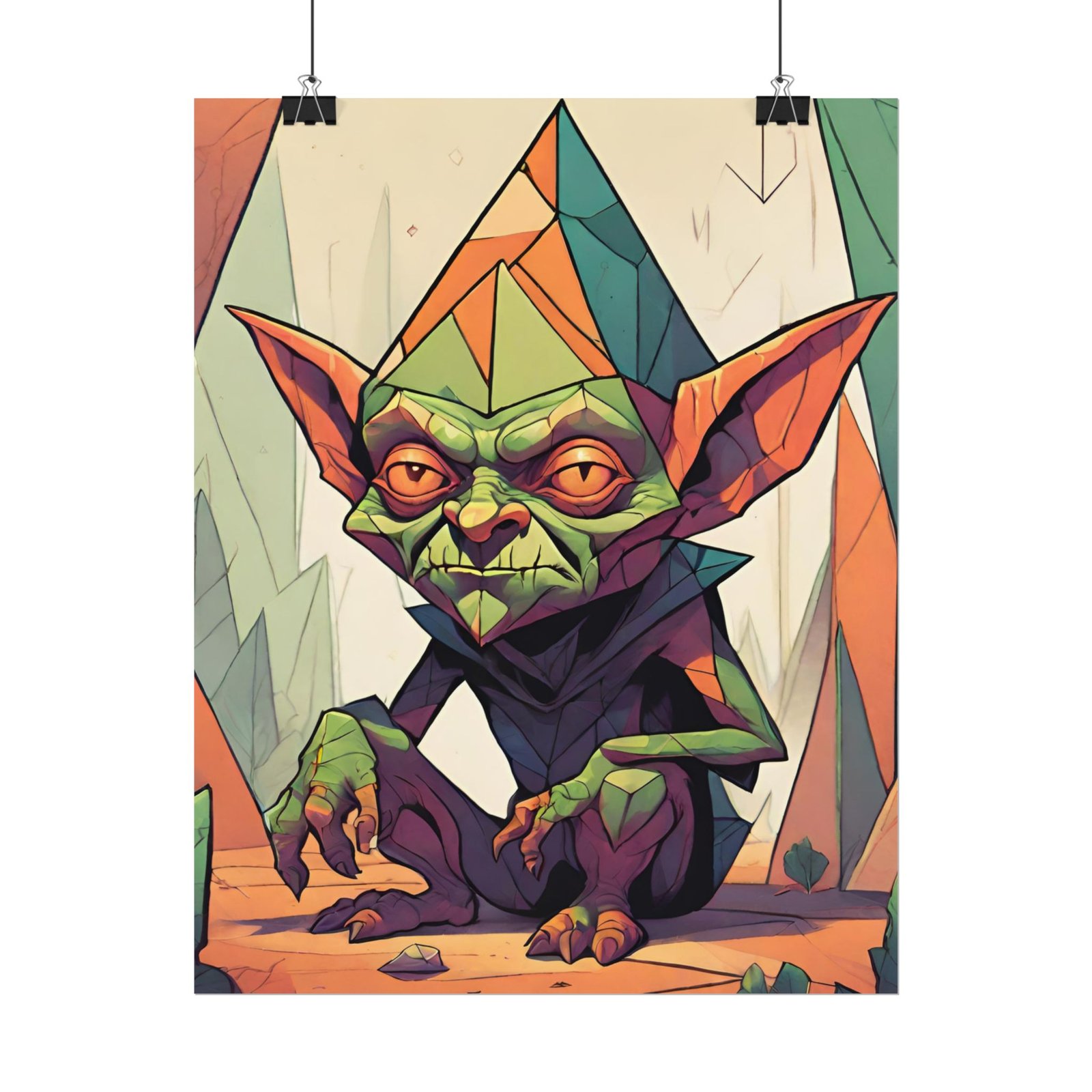 This geometrical Gremlin poster brings a unique and edgy vibe to any room. Perfect for fans of urban or architectural design, this poster can be a conversation starter or a statement piece in your home decor. Ideal for Halloween or Gothic-themed parties, this poster is a must-have for those who love dark aesthetics.