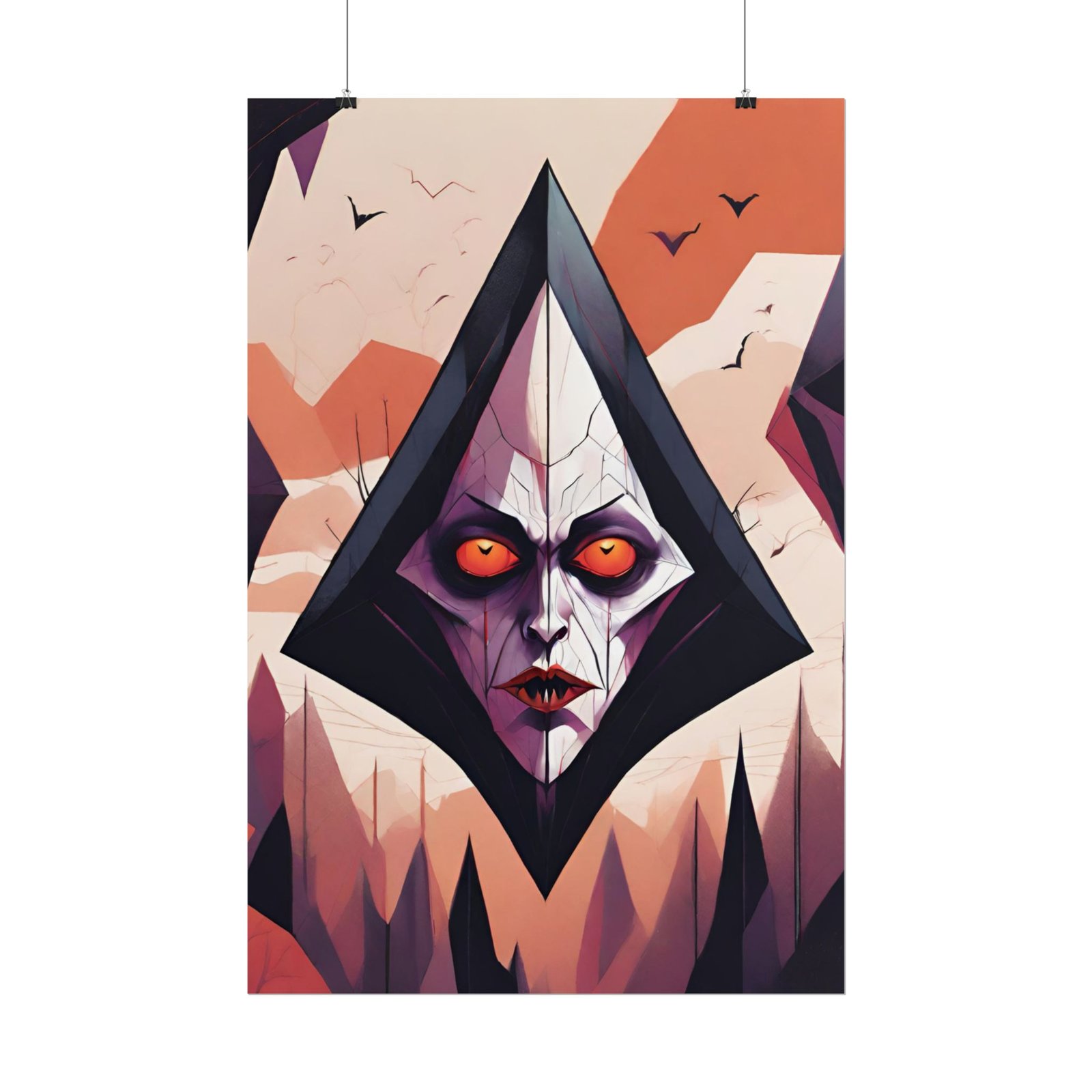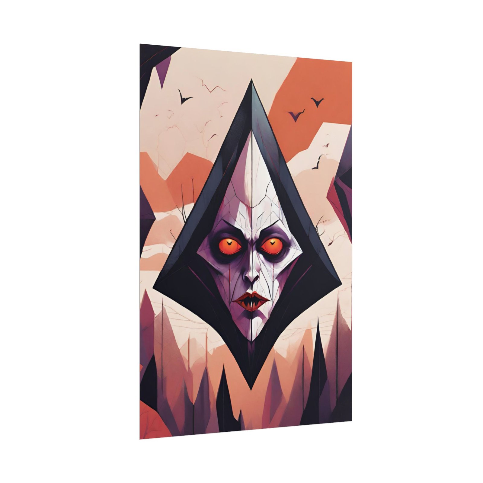 This geometrical Dracula poster brings a unique and edgy vibe to any room. Perfect for fans of urban or architectural design, this poster can be a conversation starter or a statement piece in your home decor. Ideal for Halloween or Gothic-themed parties, this poster is a must-have for those who love dark aesthetics.