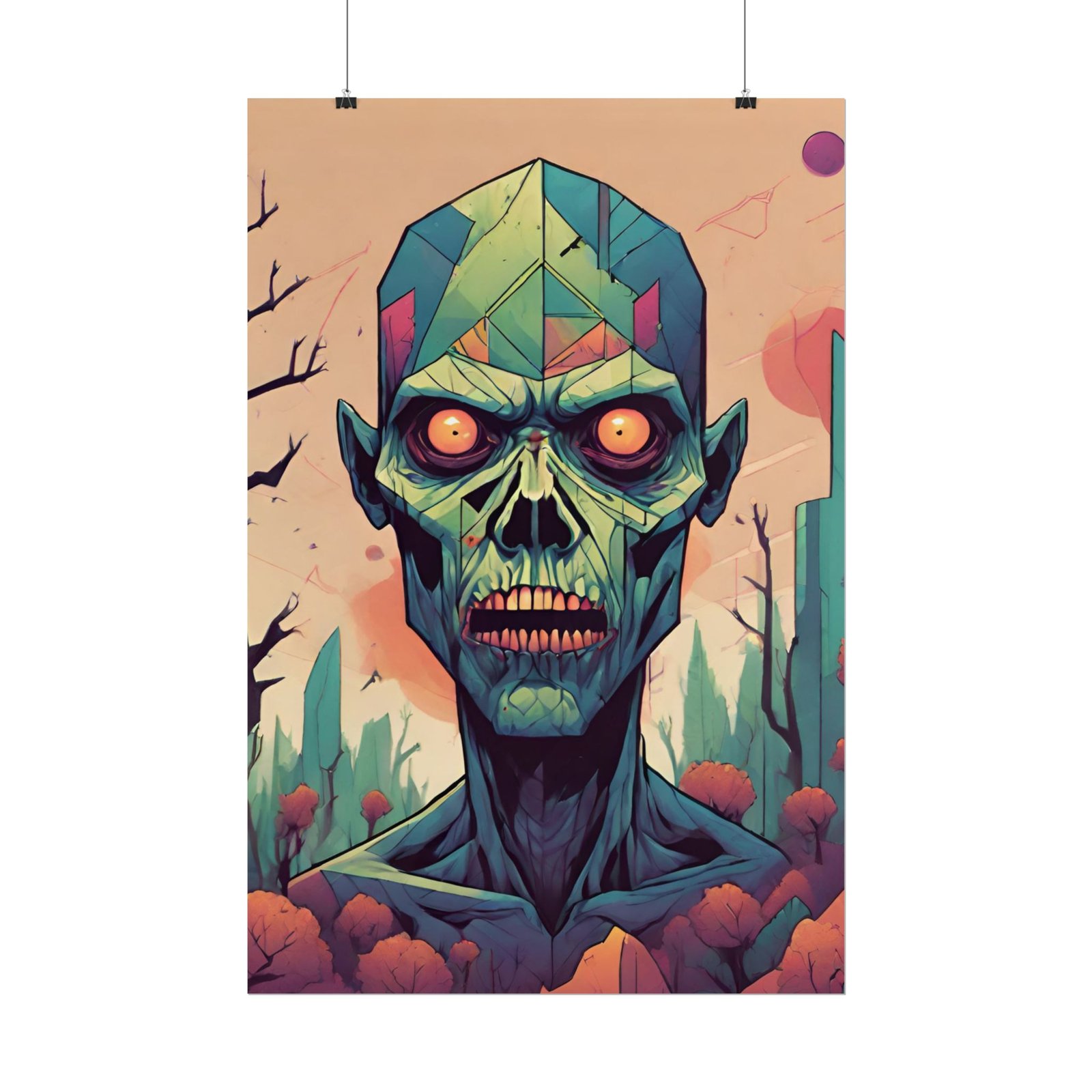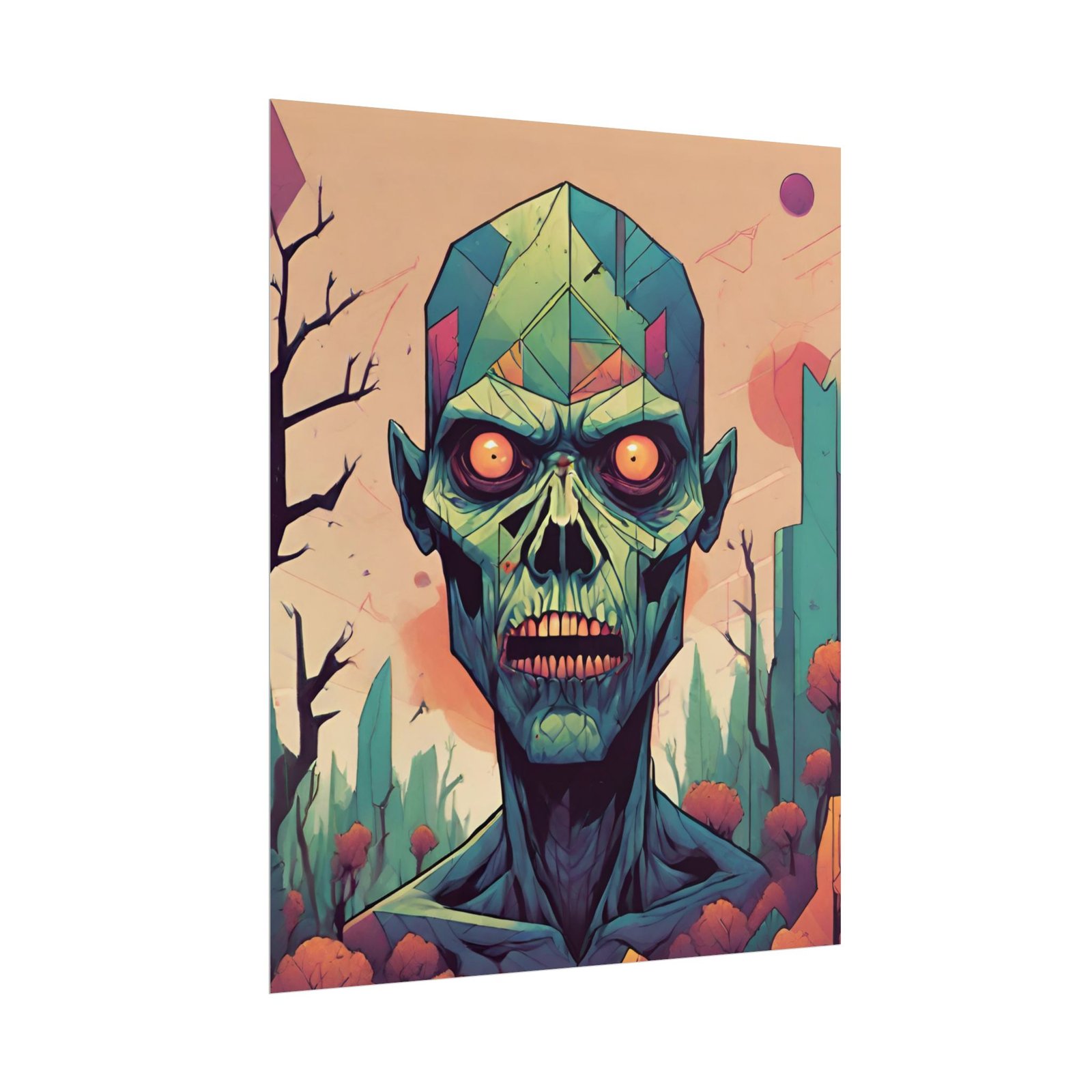 This geometrical Zombie poster brings a unique and edgy vibe to any room. Perfect for fans of urban or architectural design, this poster can be a conversation starter or a statement piece in your home decor. Ideal for Halloween or Gothic-themed parties, this poster is a must-have for those who love dark aesthetics.