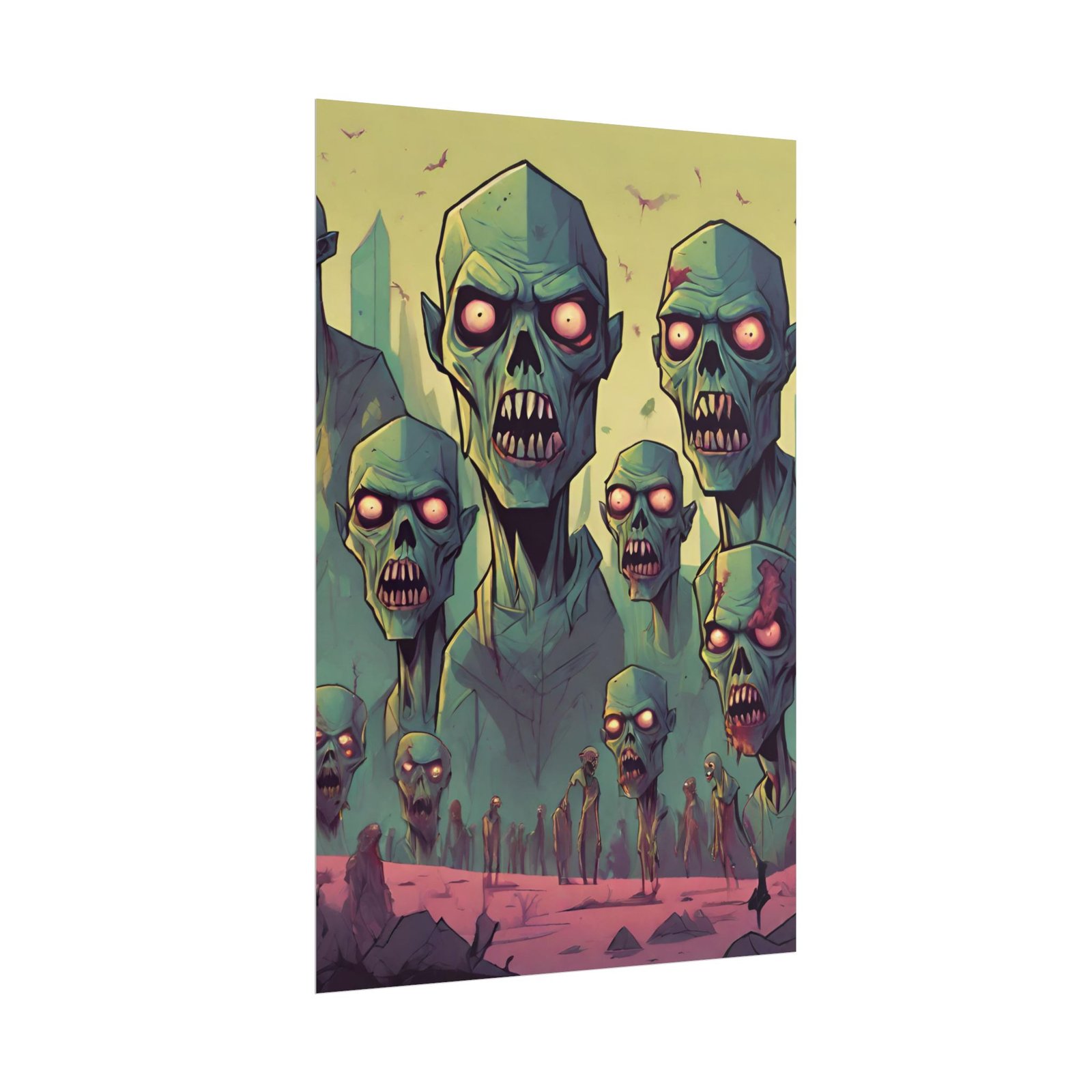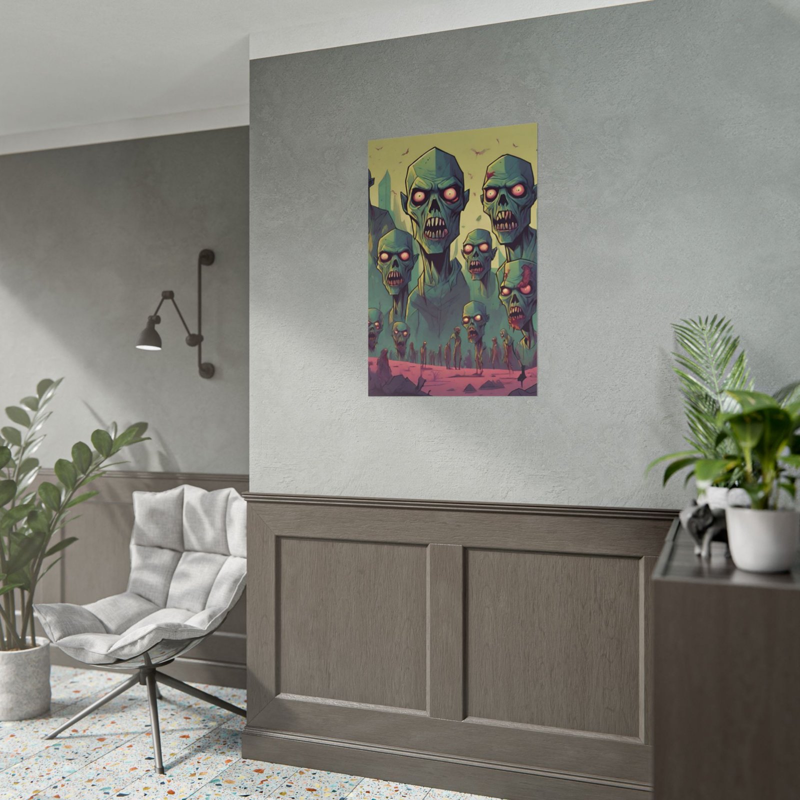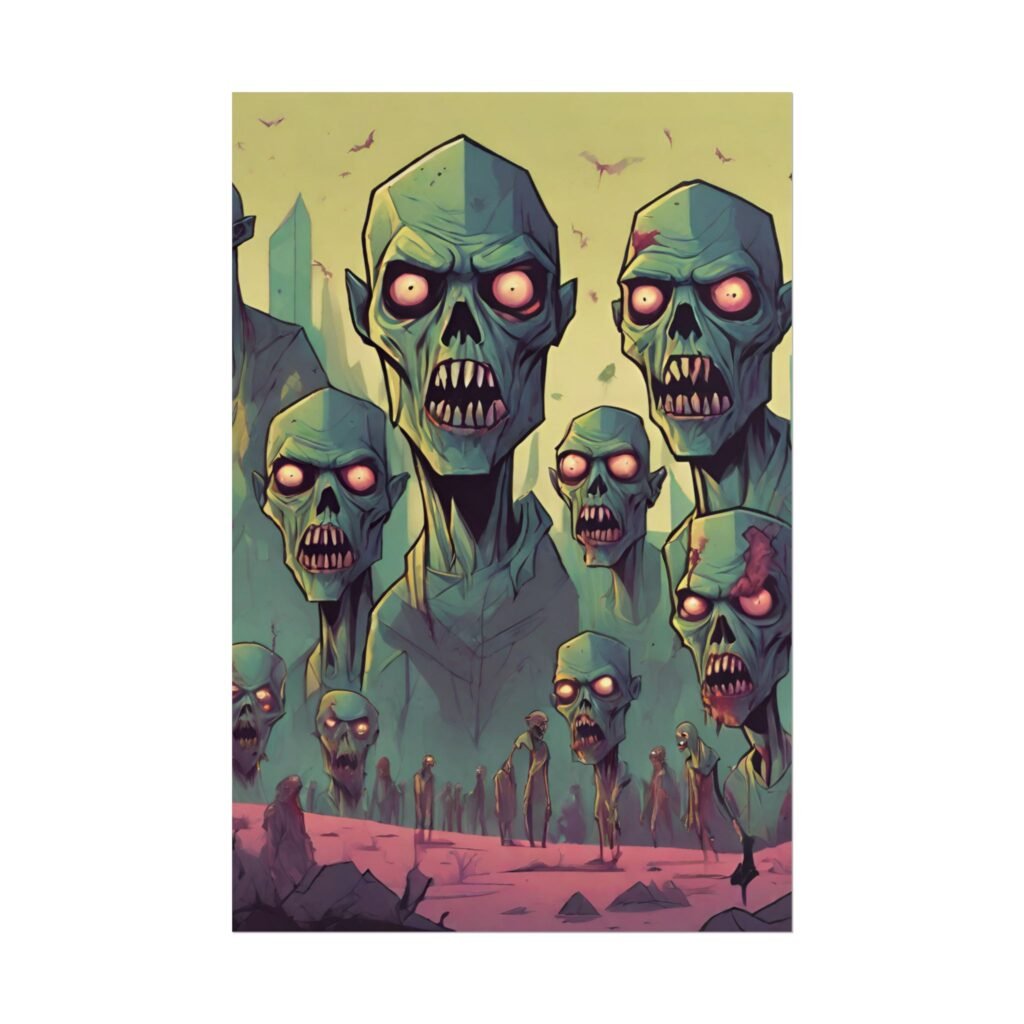 This geometrical Zombie poster brings a unique and edgy vibe to any room. Perfect for fans of urban or architectural design, this poster can be a conversation starter or a statement piece in your home decor. Ideal for Halloween or Gothic-themed parties, this poster is a must-have for those who love dark aesthetics.