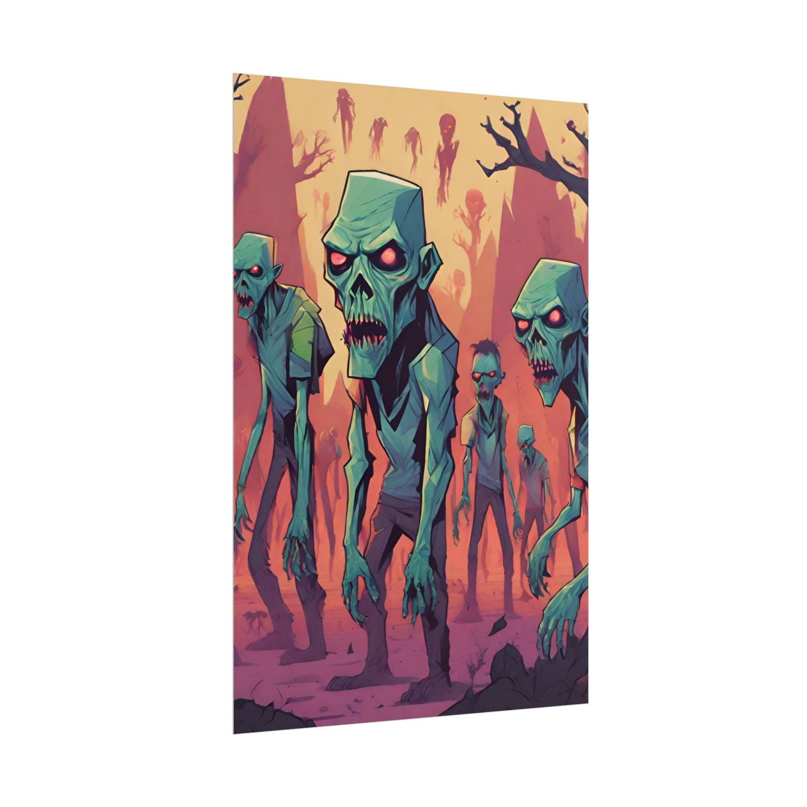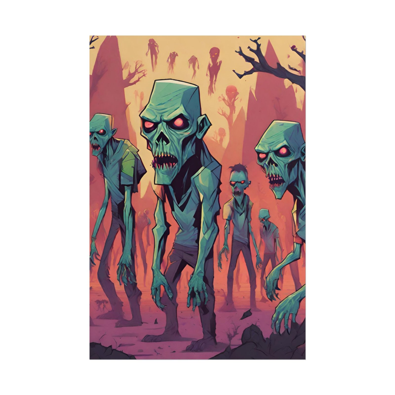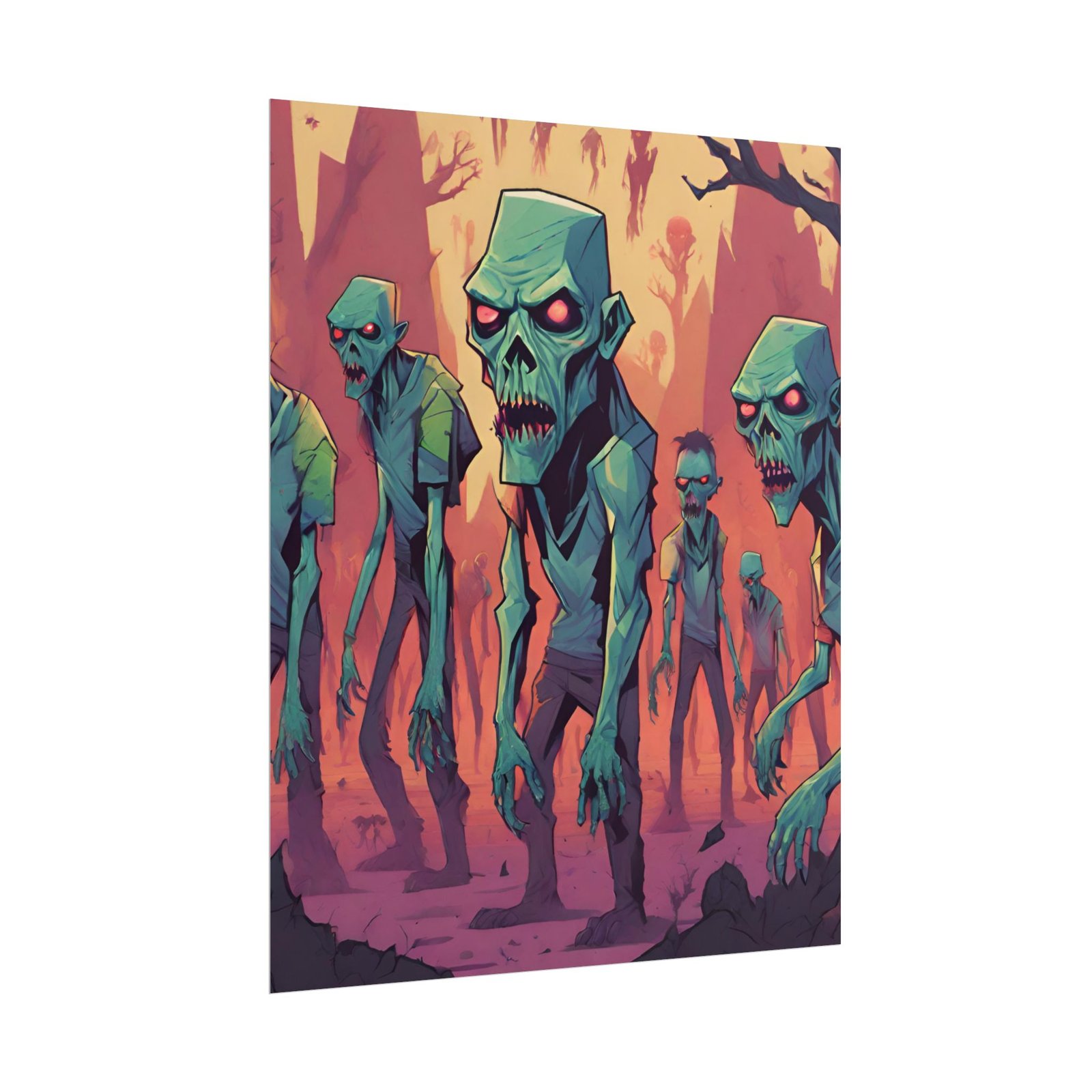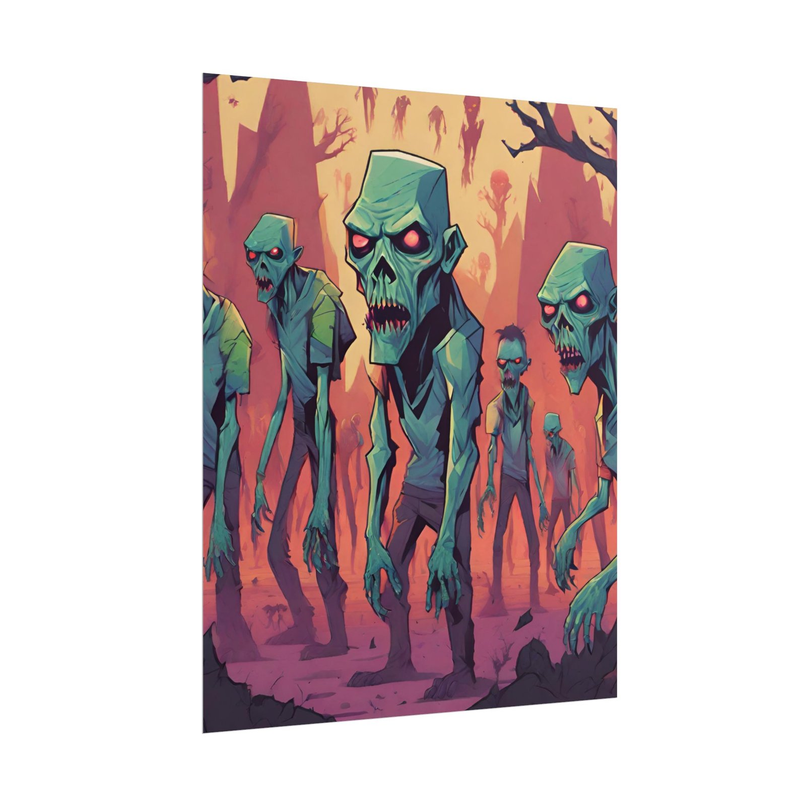 This geometrical Zombie poster brings a unique and edgy vibe to any room. Perfect for fans of urban or architectural design, this poster can be a conversation starter or a statement piece in your home decor. Ideal for Halloween or Gothic-themed parties, this poster is a must-have for those who love dark aesthetics.