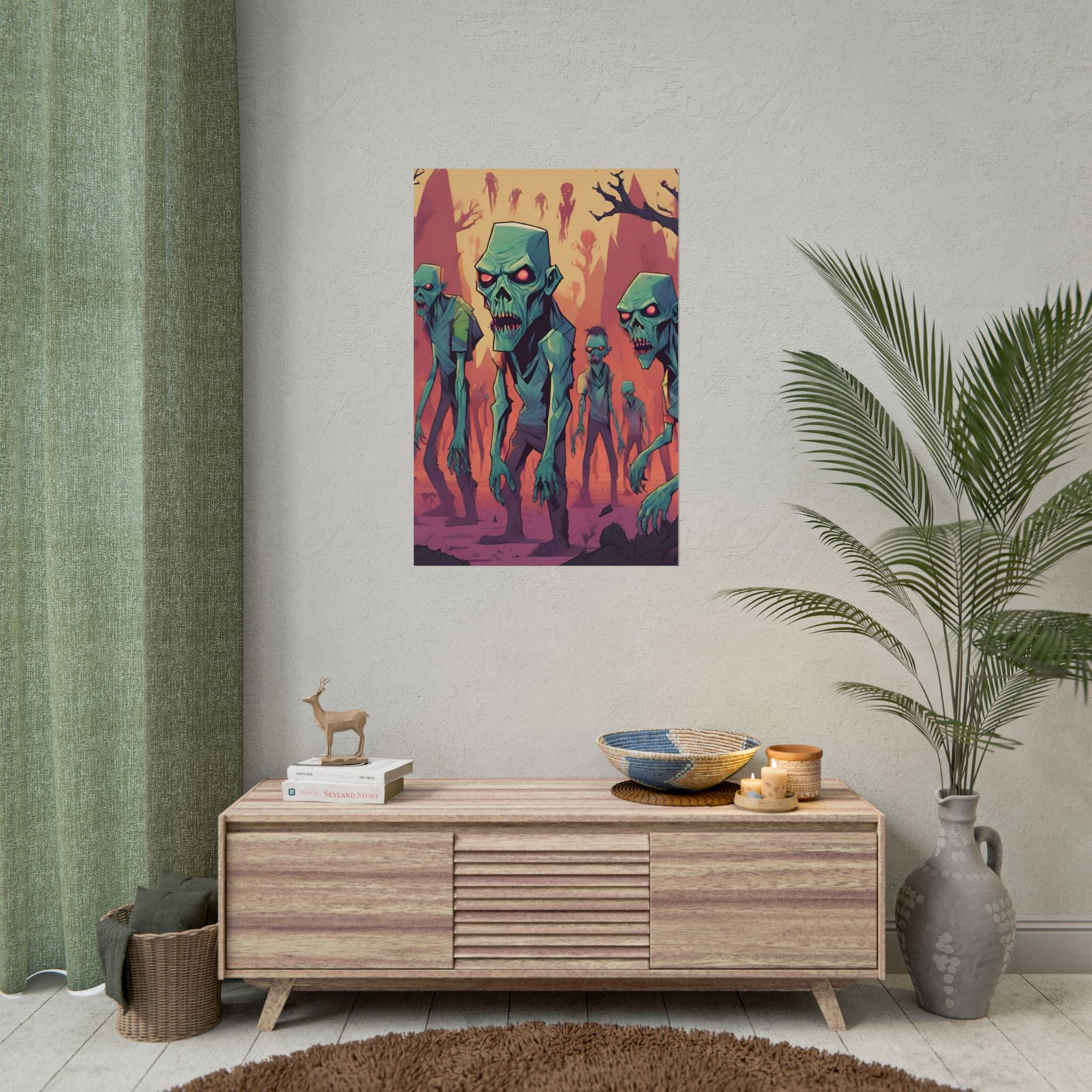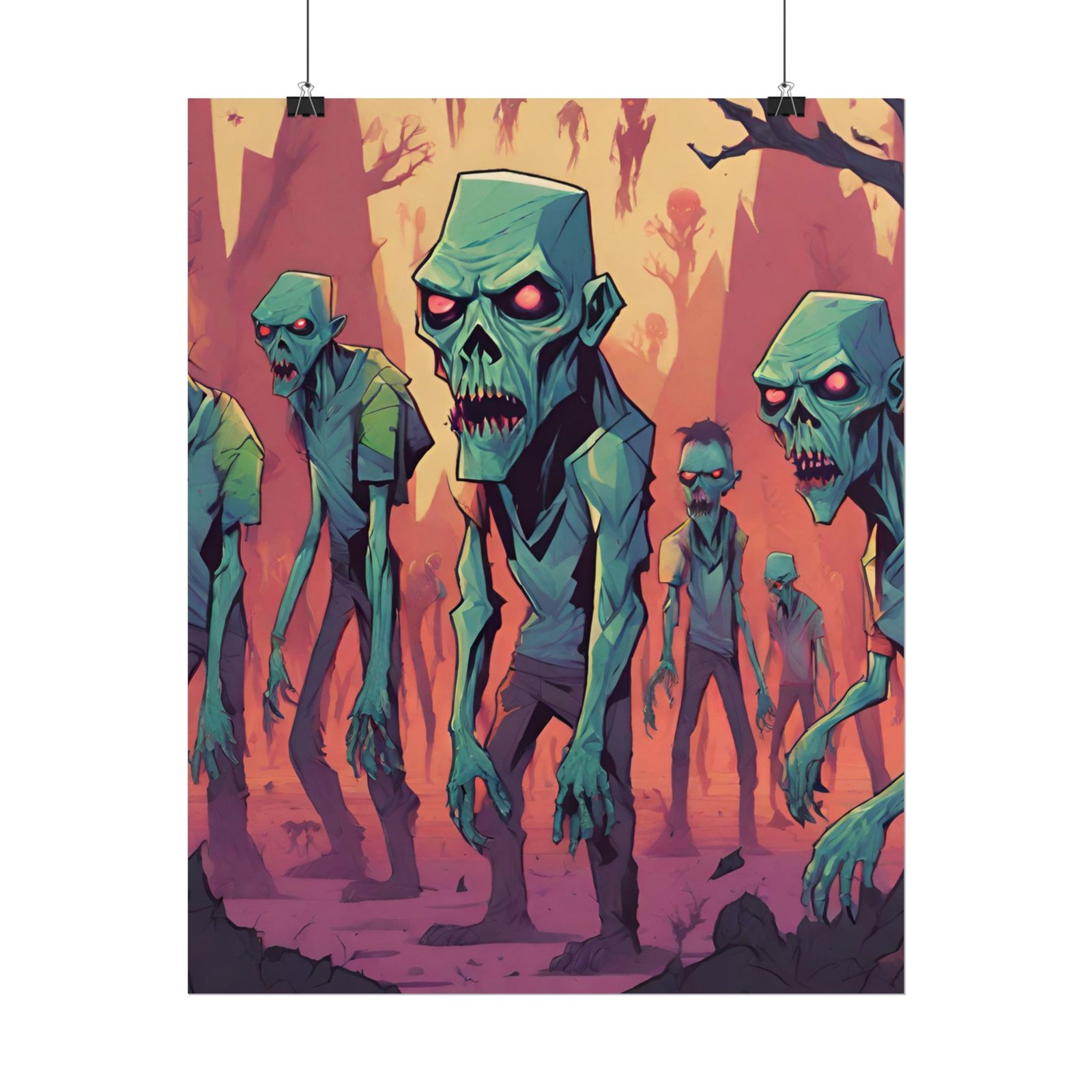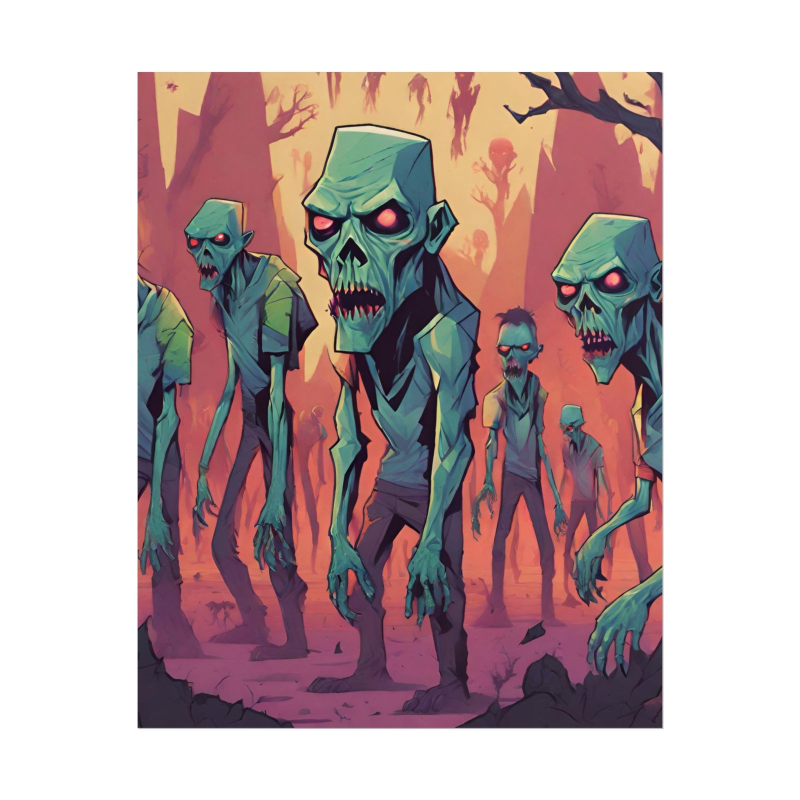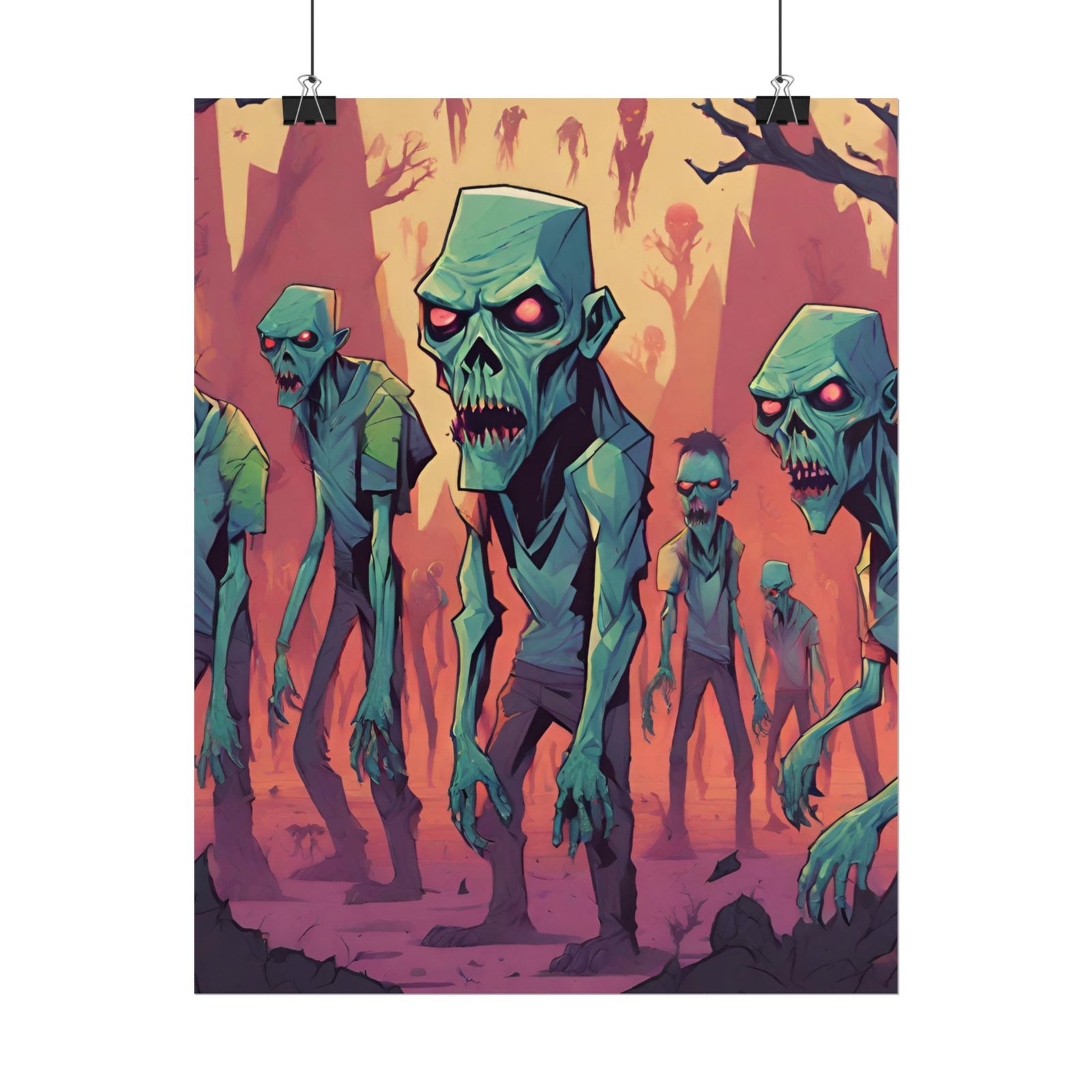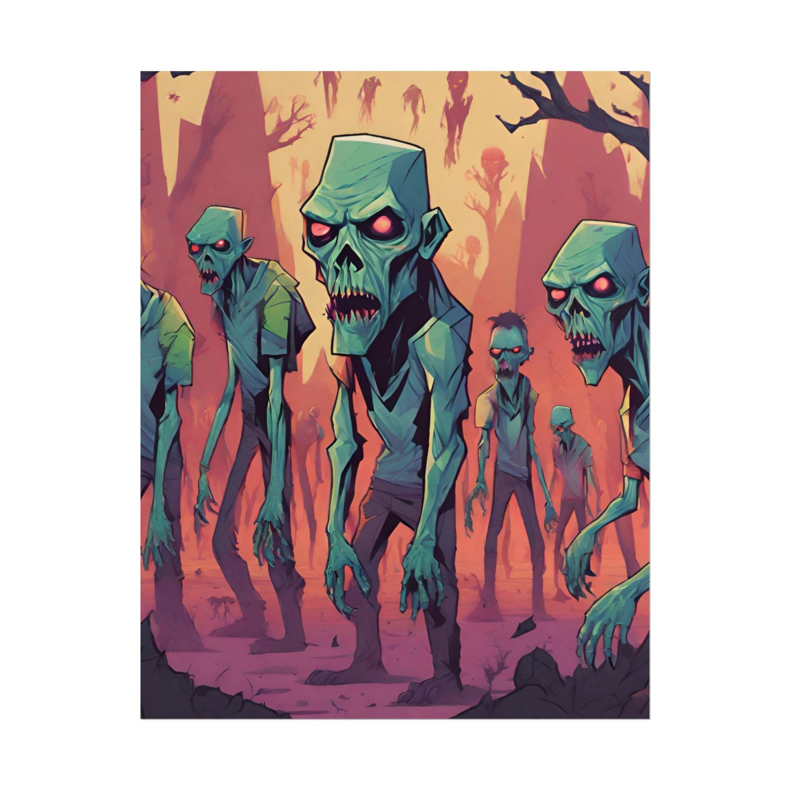 This geometrical Zombie poster brings a unique and edgy vibe to any room. Perfect for fans of urban or architectural design, this poster can be a conversation starter or a statement piece in your home decor. Ideal for Halloween or Gothic-themed parties, this poster is a must-have for those who love dark aesthetics.