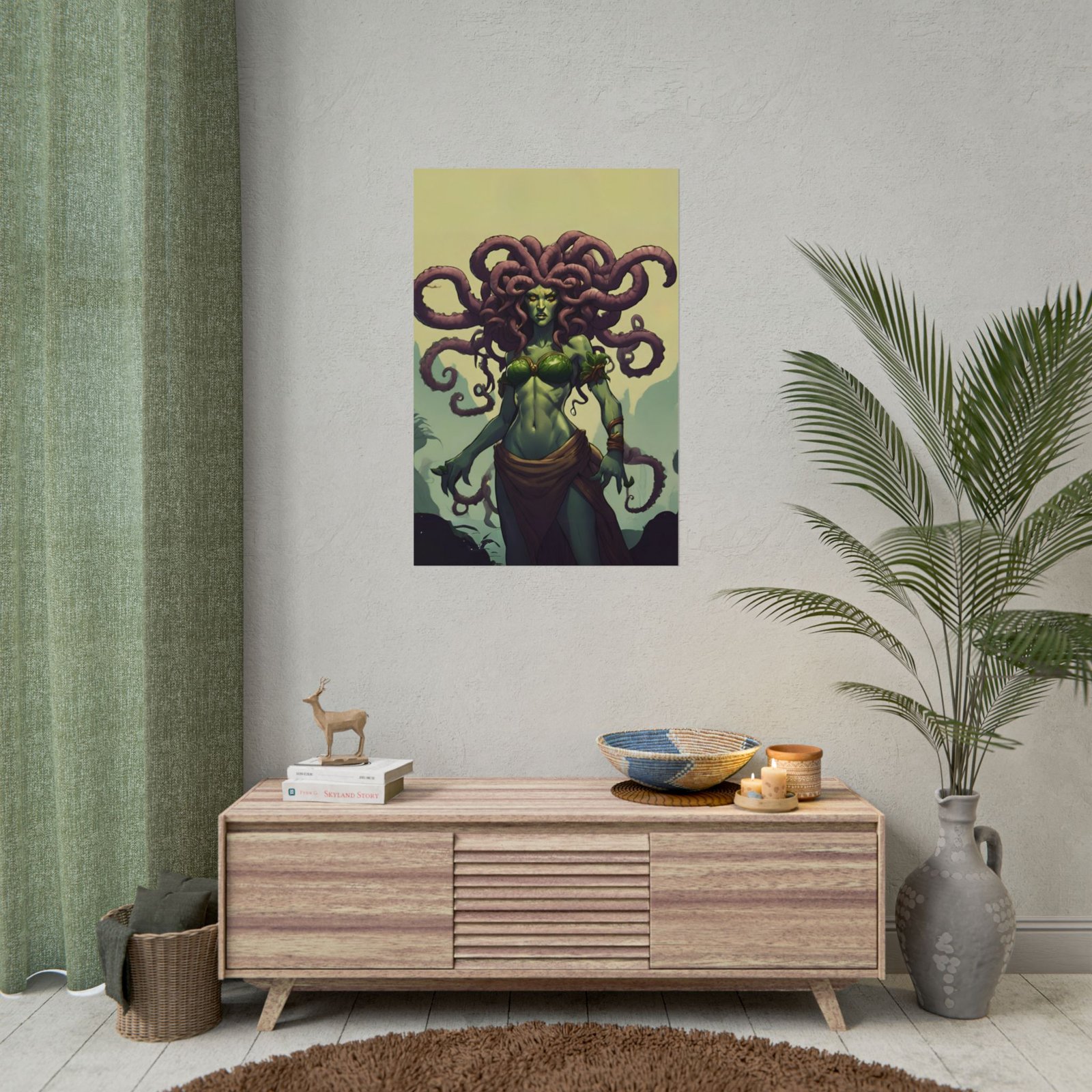Turn your space into a spine-chilling sanctuary with our Medusa Halloween Poster! This captivating artwork brings the legendary gorgon to life, merging ancient myth with eerie modernity. With venomous snakes coiled in her hair and a piercing gaze that could turn you to stone, Medusa radiates power and mystery, making her the perfect icon for your Halloween decor.