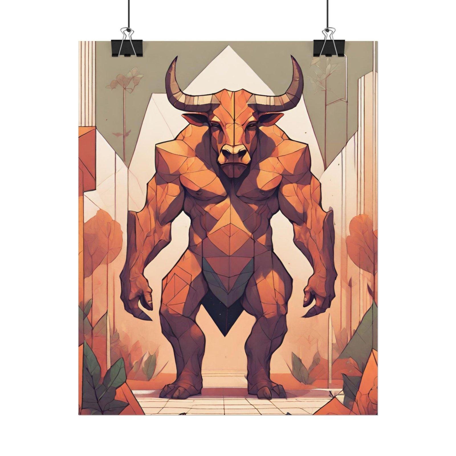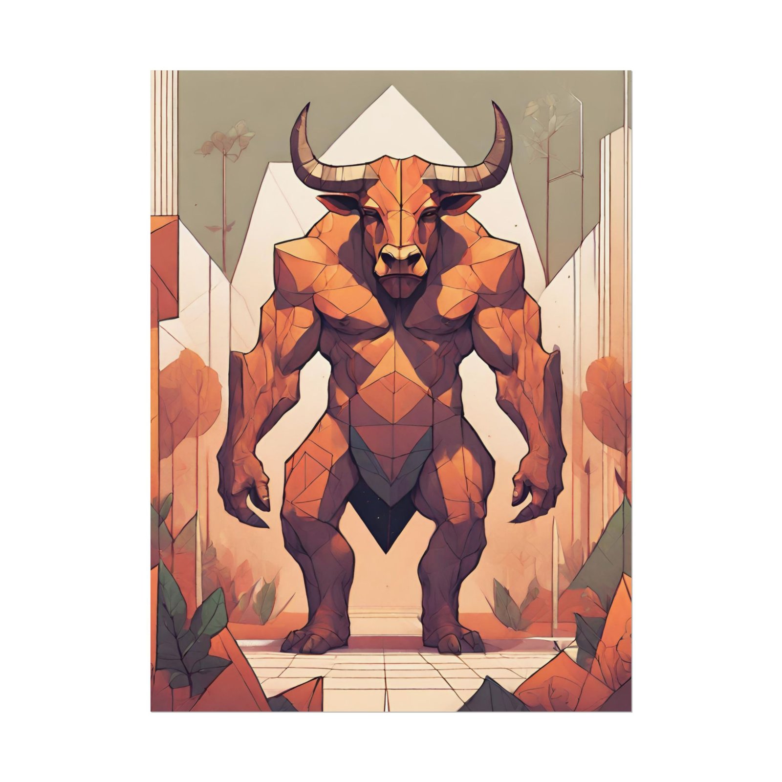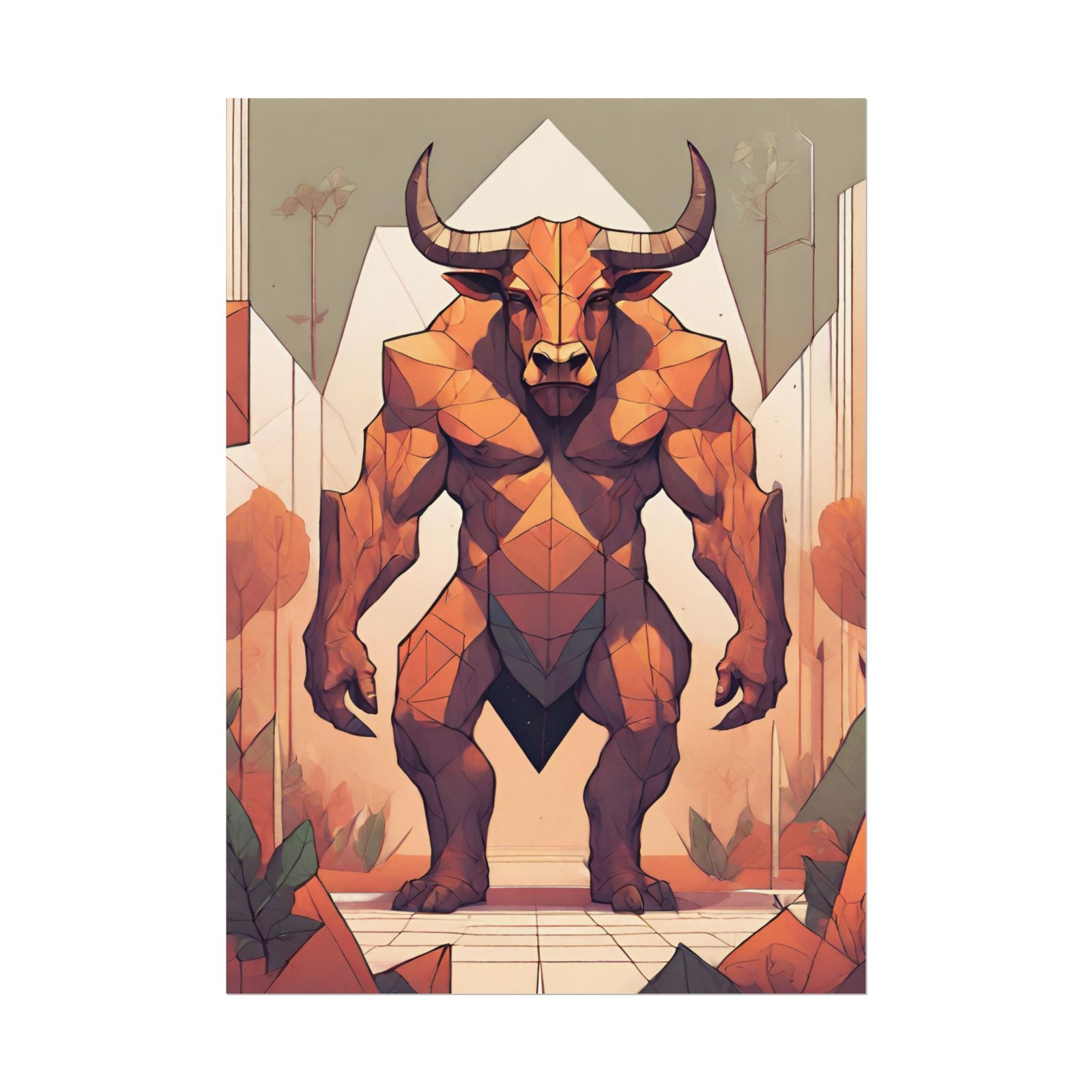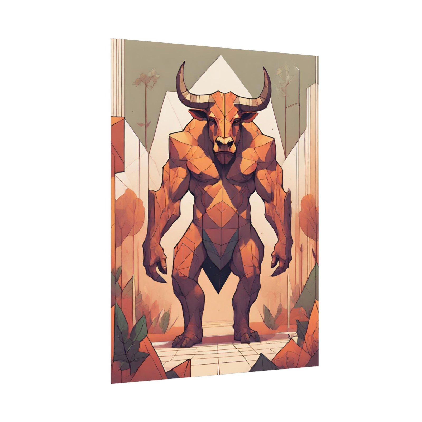 This geometrical Minotar poster brings a unique and edgy vibe to any room. Perfect for fans of urban or architectural design, this poster can be a conversation starter or a statement piece in your home decor. Ideal for Halloween or Gothic-themed parties, this poster is a must-have for those who love dark aesthetics.