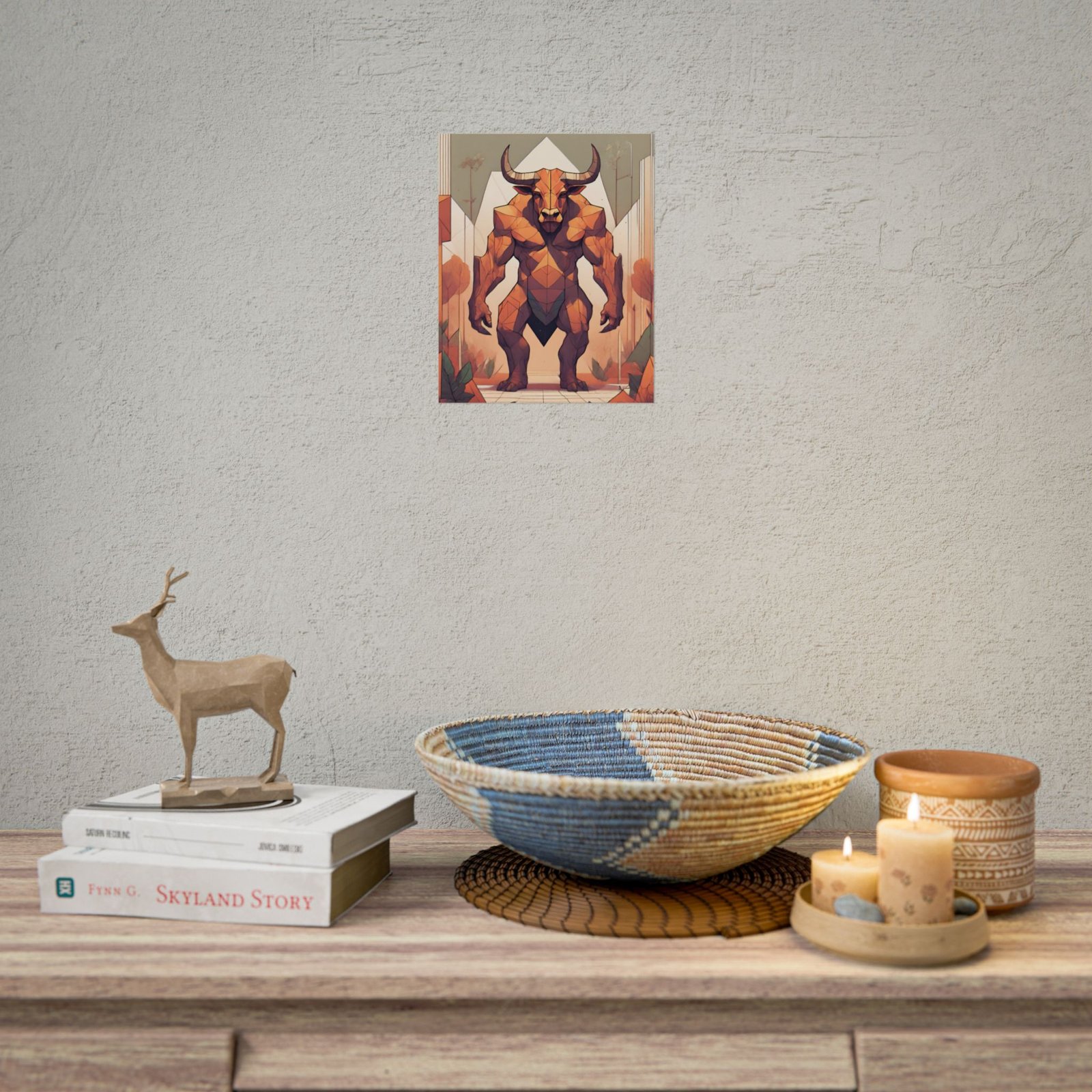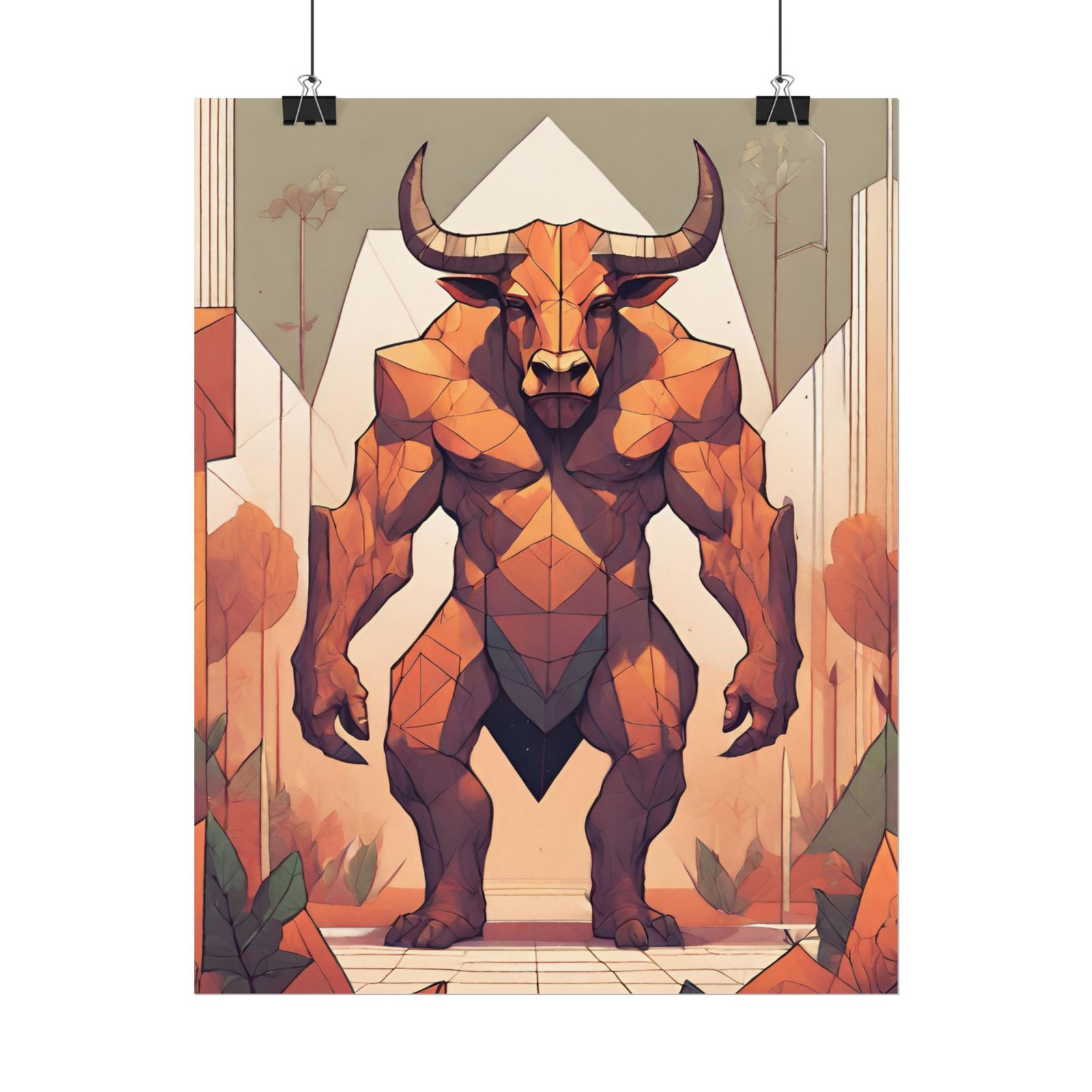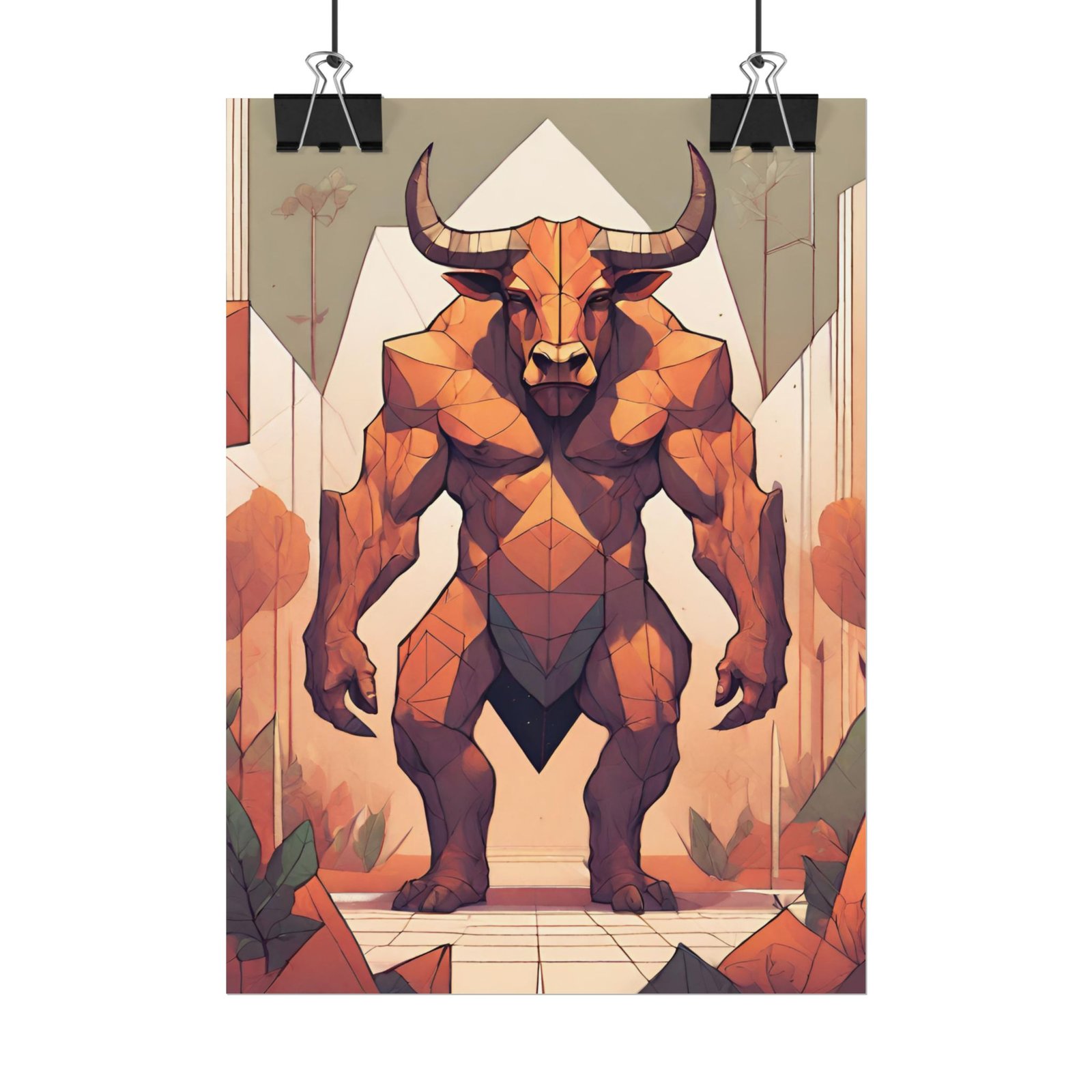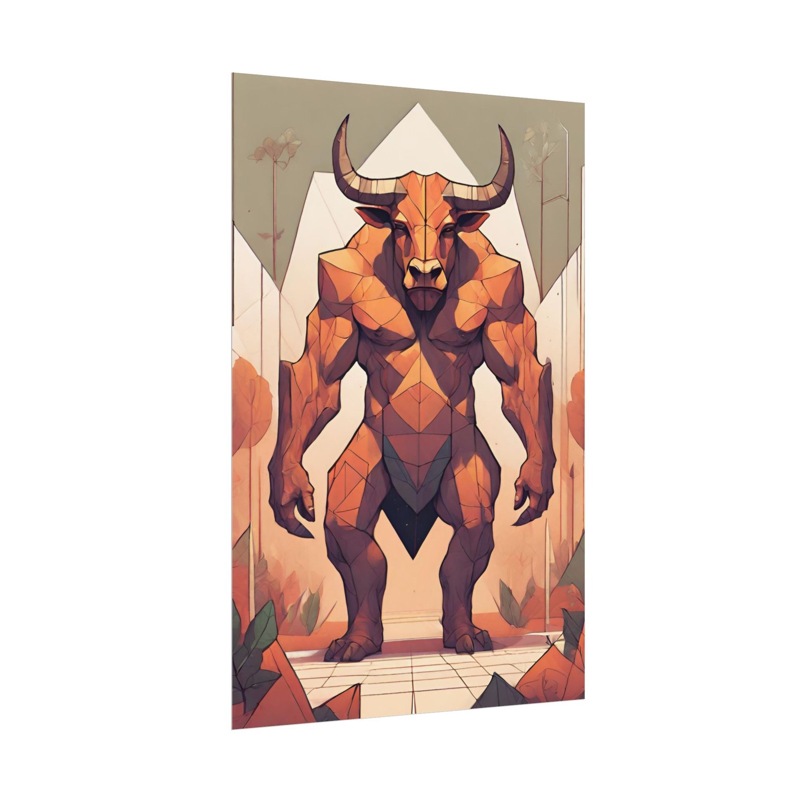 This geometrical Minotar poster brings a unique and edgy vibe to any room. Perfect for fans of urban or architectural design, this poster can be a conversation starter or a statement piece in your home decor. Ideal for Halloween or Gothic-themed parties, this poster is a must-have for those who love dark aesthetics.