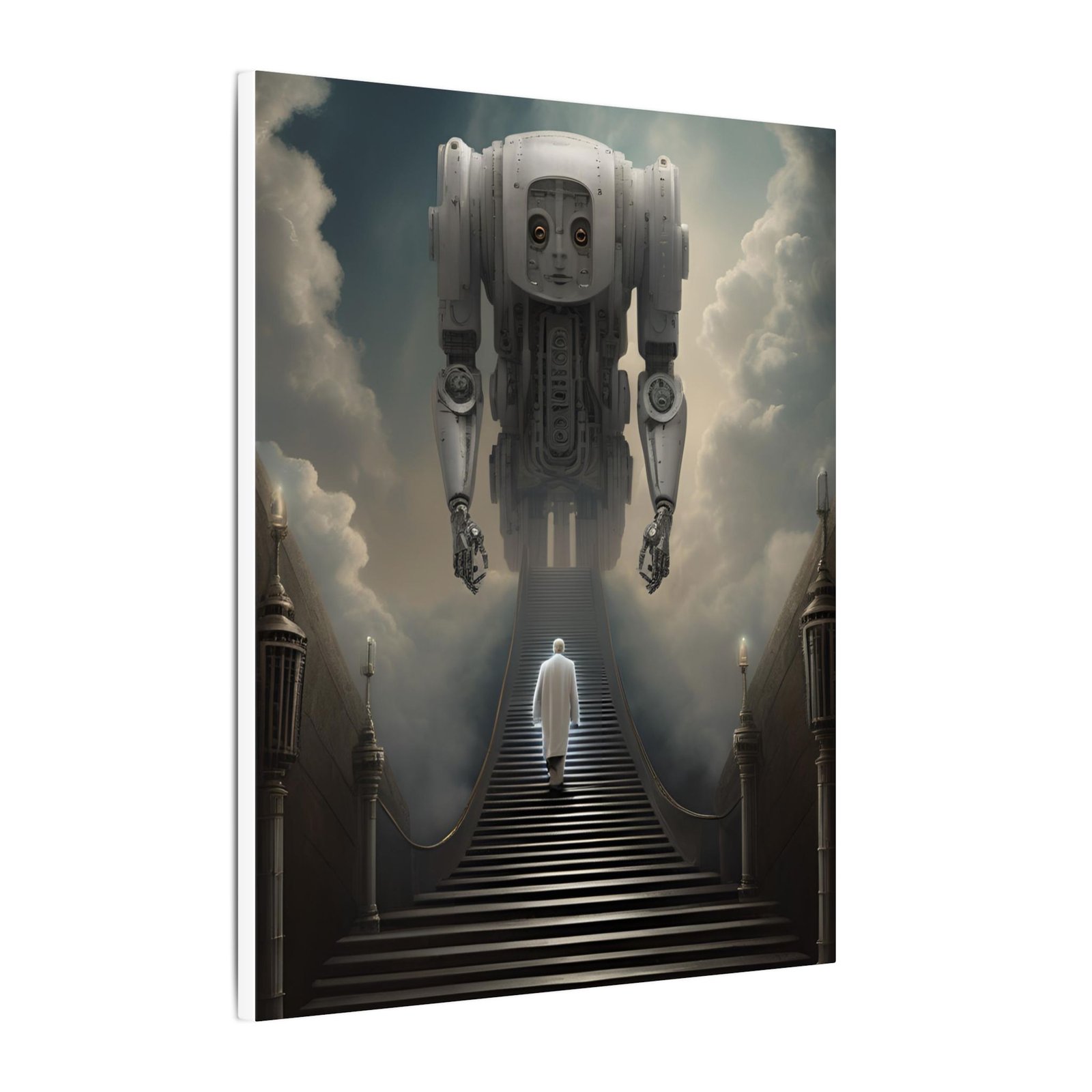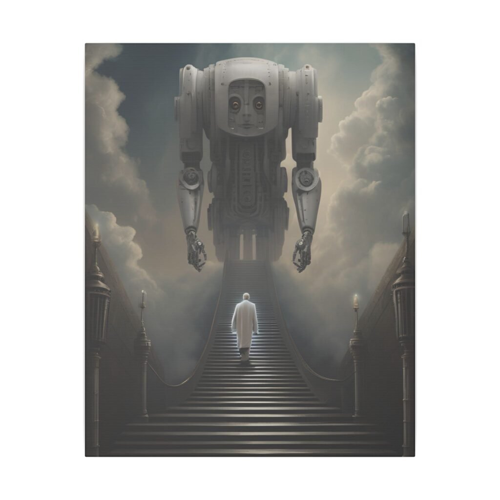 A matte stretched canvas that brings cinematic sci‑fi atmosphere to your walls. Deep, velvety tones and a subtle satin matting let the dramatic stairway, lone figure, and towering automaton read like a moment captured from a dreamlike film. The heavy-duty cotton/poly canvas holds detail and shadow, while the low-profile 0.75″ stretcher keeps the artwork close to the wall for a gallery-ready look. Designed to hang straight and stay put, it’s crafted with responsibly sourced pine and durable, eco-conscious inks for long-lasting color without harsh chemicals.