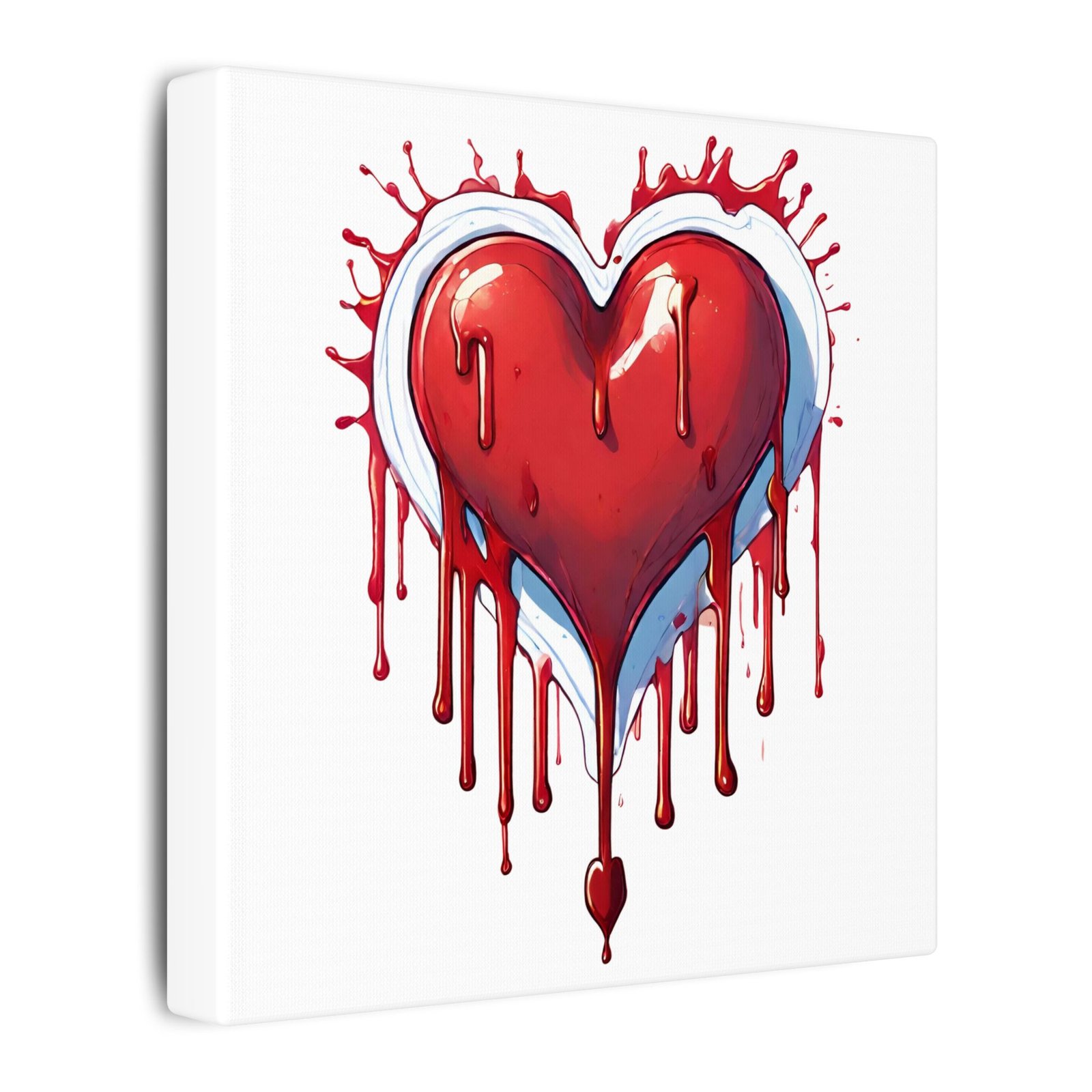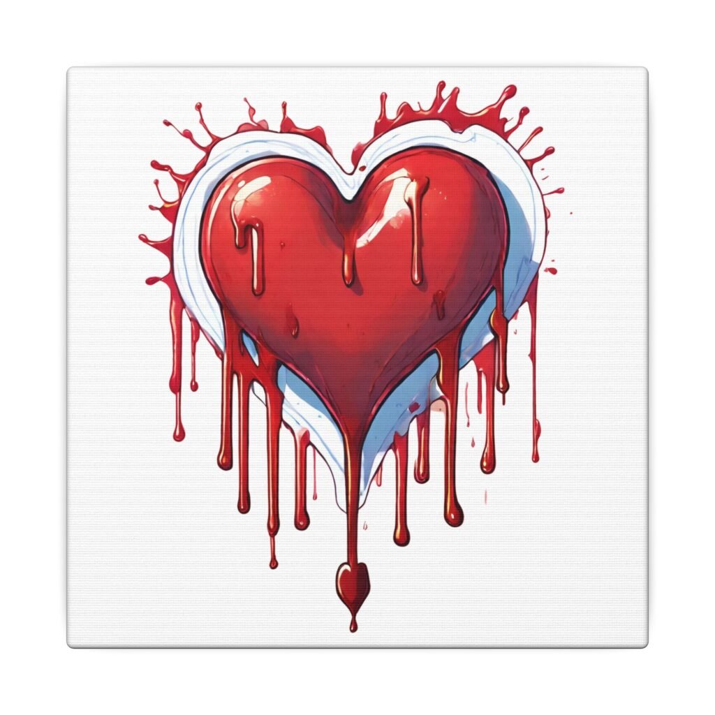 A stretched matte canvas that captures bold, visceral emotion with painterly detail. The artwork centers on a dripping red heart — glossy highlights, shadowed edges, and splattered paint give it a raw, hand-painted energy that reads both intimate and unapologetic. Mounted on a 0.75″ pine profile, the image wraps cleanly to the edges and hangs ready-made. The subdued matte finish reduces glare so the saturated reds and cool blue-white accents hold their depth from every angle. This piece fits a moody, contemporary space — it brings color, attitude, and a little edge to bedrooms, studios, or gallery walls.