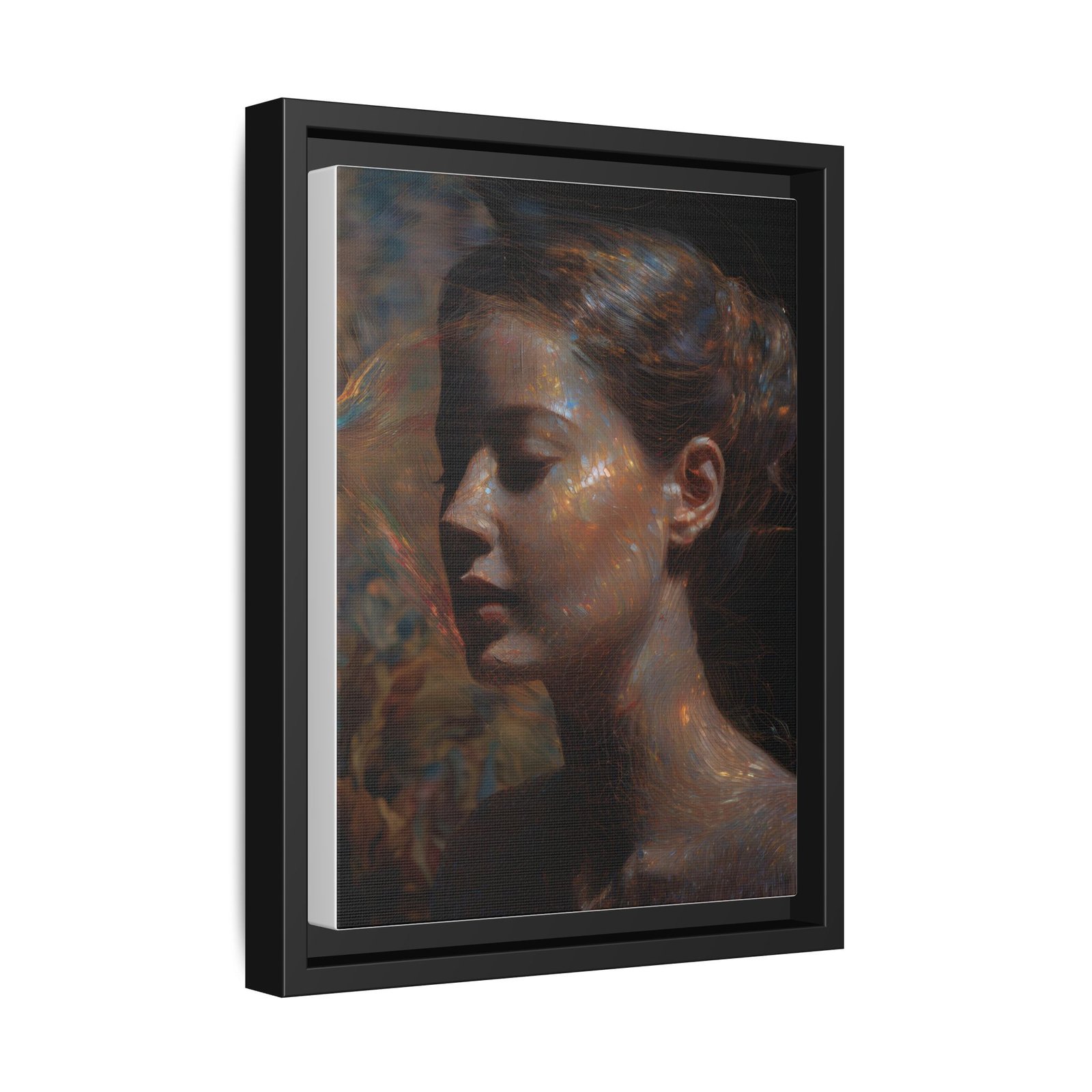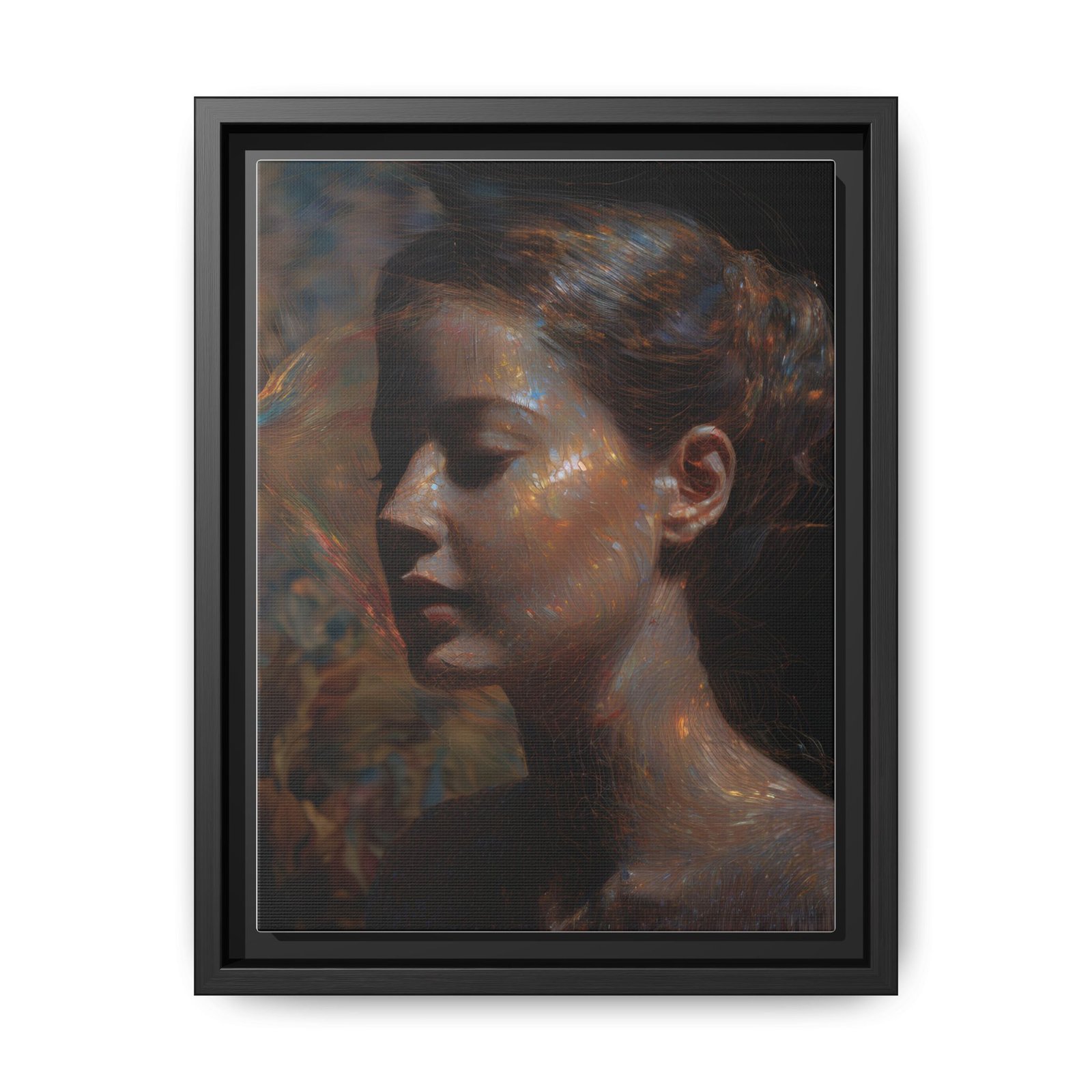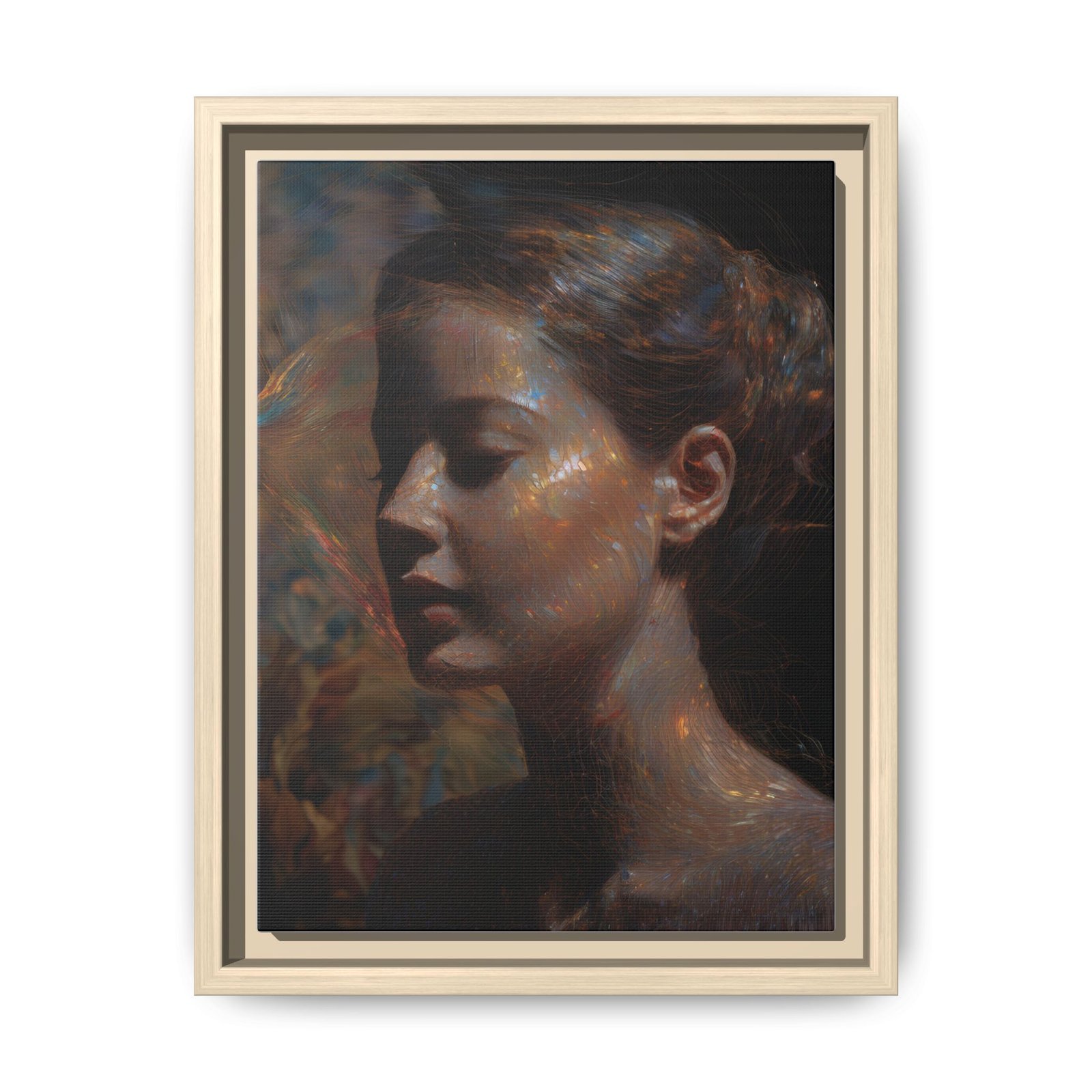 A matte, framed canvas print that brings quiet, painterly beauty into any room. The soft, multi-color portrait captures a moment of introspection — luminous highlights and deep, velvety shadows that feel like an oil painting rediscovered. The slim pine frame and matte finish lend a contemporary gallery look while keeping the image intimate and tactile. Hang it in a reading nook, over a mantel, or in a bedroom to introduce a calm, reflective mood that ages gracefully with your space.