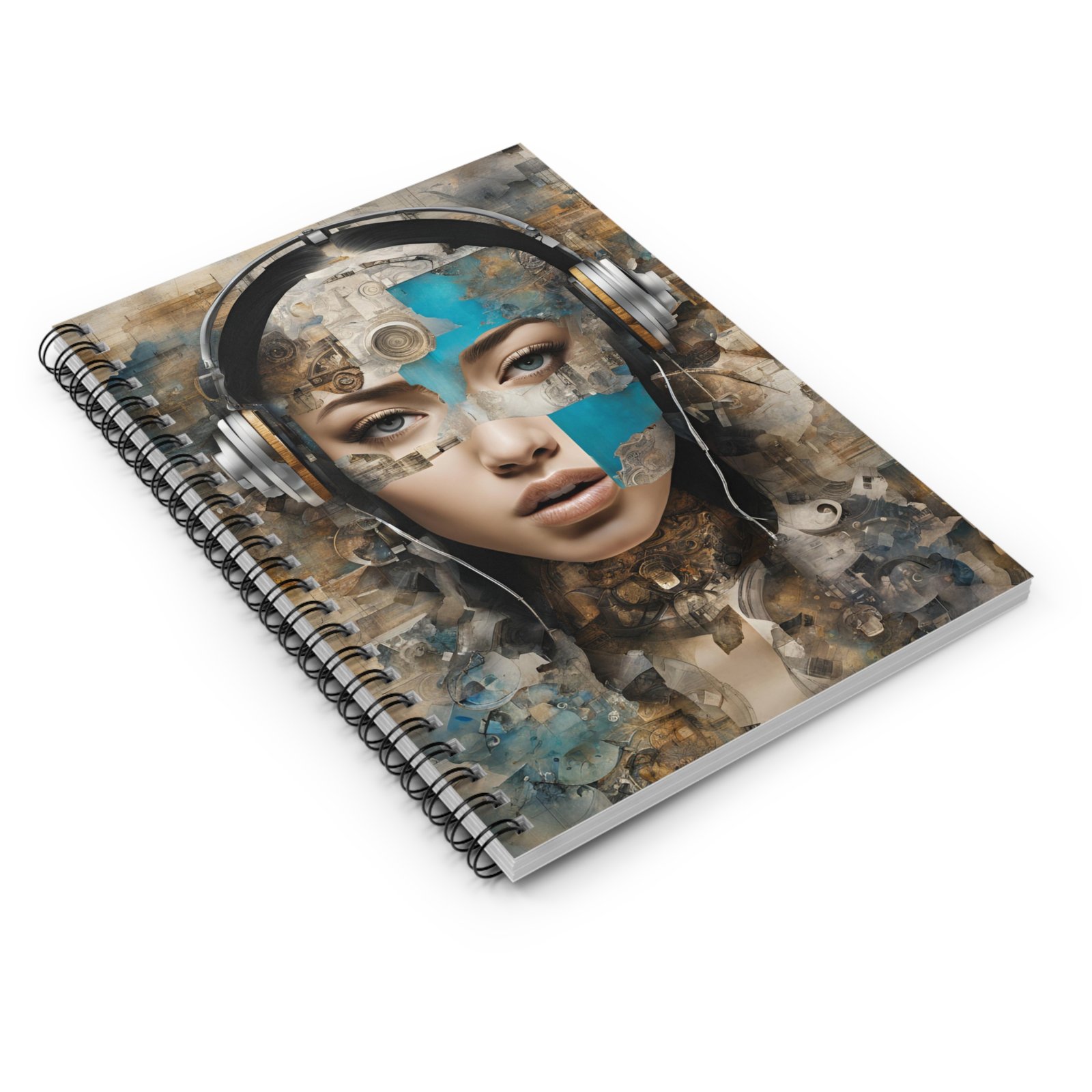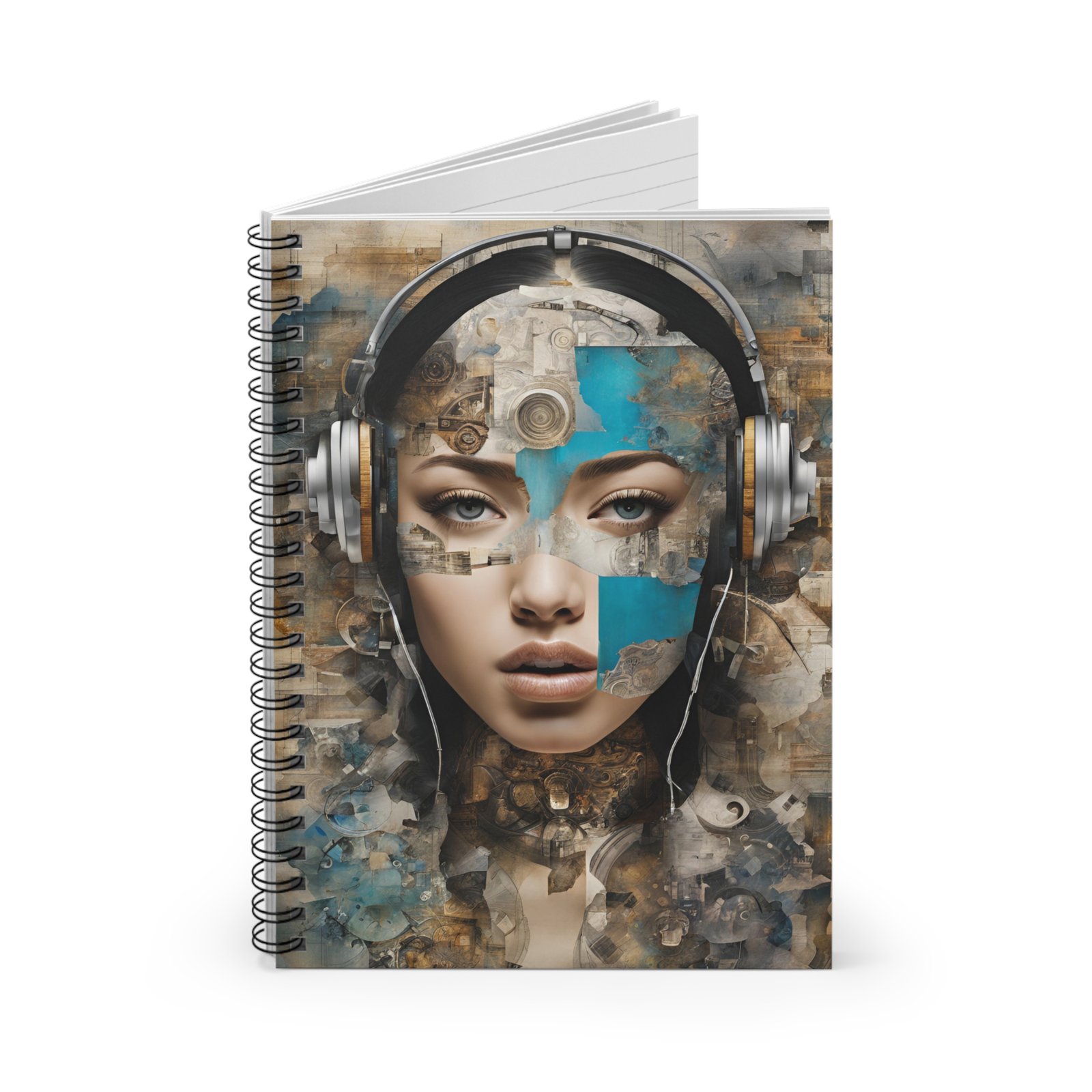 This ruled spiral notebook blends artistic edge with everyday utility. The cover features a striking mixed-media portrait of a woman wearing headphones — warm neutrals pierced by vivid turquoise brushstrokes — giving the notebook an expressive, slightly surreal vibe. Inside, smooth 90 gsm lined pages invite confident pen strokes for notes, journaling, song ideas or sketching in margins. A sturdy metal spiral lets the pages lie flat and makes it easy to tear out sheets when needed. The inside back cover hides a document pocket for receipts, tickets or loose papers, and the dark grey back cover keeps the look grounded and modern. Compact and tactile, this notebook fits into creative routines and on-the-go pockets without getting in the way.
