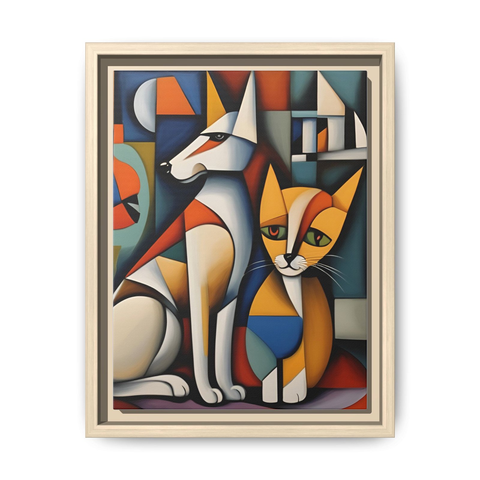 A framed matte canvas that brings bold, modern warmth to any wall. The stylized dog-and-cat composition uses geometric shapes and a rich palette to create a piece that reads like contemporary stained glass — crisp edges, deep contrast, and layered color fields. The subtle matte finish softens glare and draws attention to texture, while the slim pine frame adds a natural, grounded outline. Hang it in a living room, hallway, or creative workspace to introduce color, structure, and a touch of playful companionship.