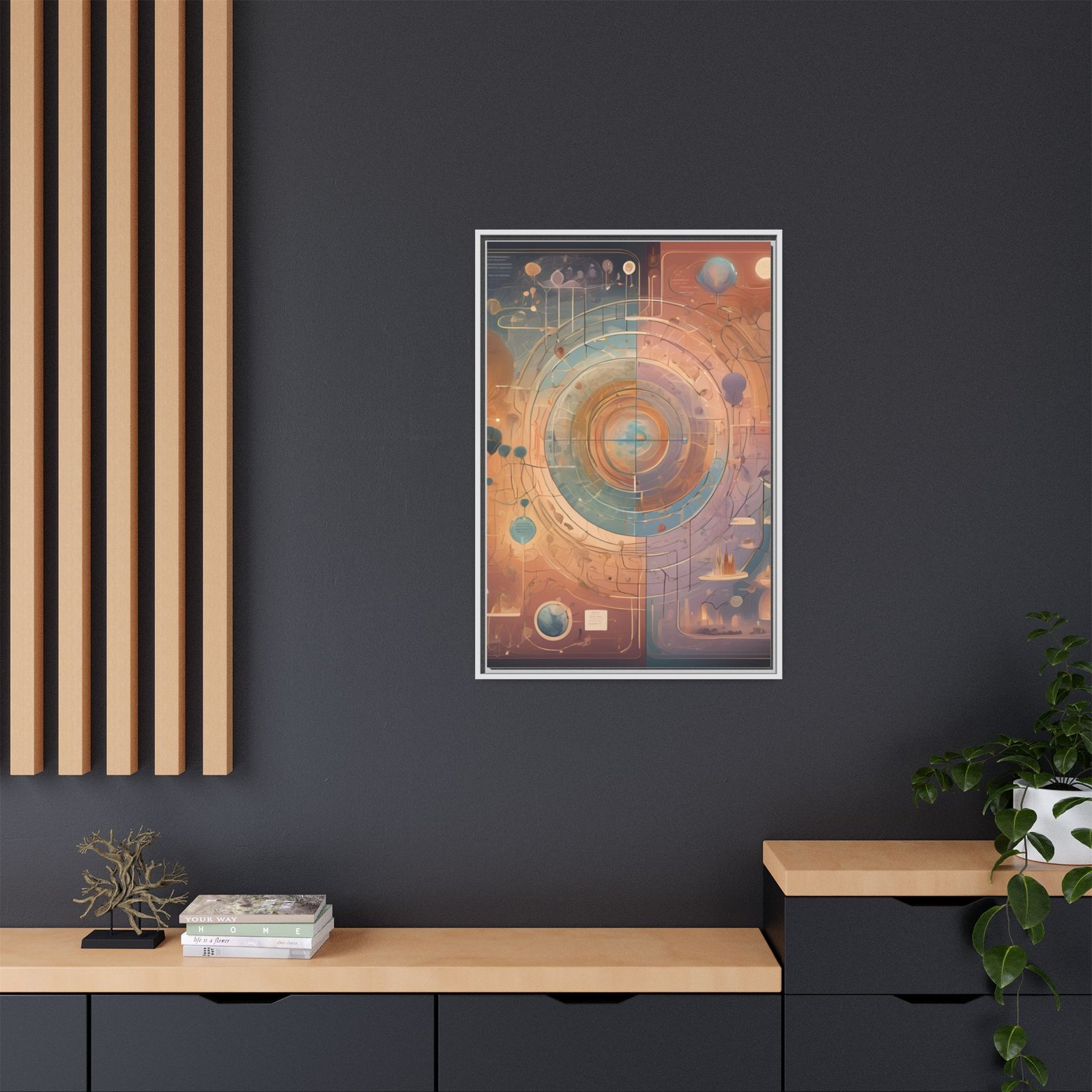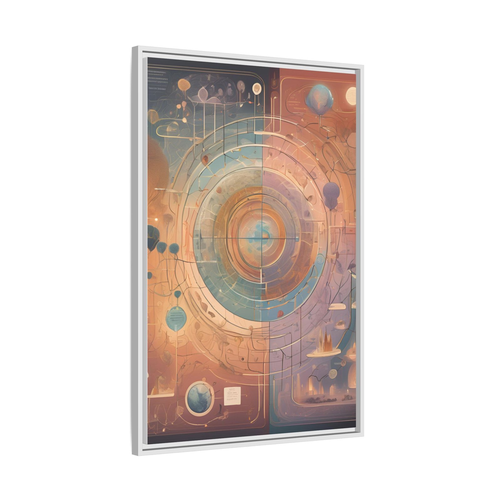 A framed matte canvas that brings warm, celestial energy into a living space. Soft terracotta, teal, and gold tones orbit around a circular focal point—like a memory map or a personal constellation. The narrow black pine frame lends structure while the matte coating reduces glare, letting the subtleties of brushlike textures and layered color gradations come forward. Hang it in a reading nook, studio, or above a console to anchor a room with contemplative, story-rich color. The piece feels like a quiet conversation between past and future: meditative, imaginative, and quietly adventurous.
