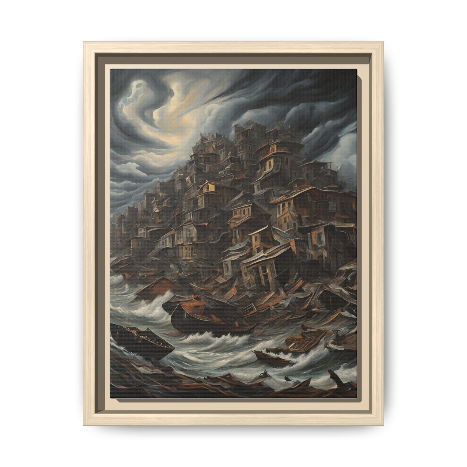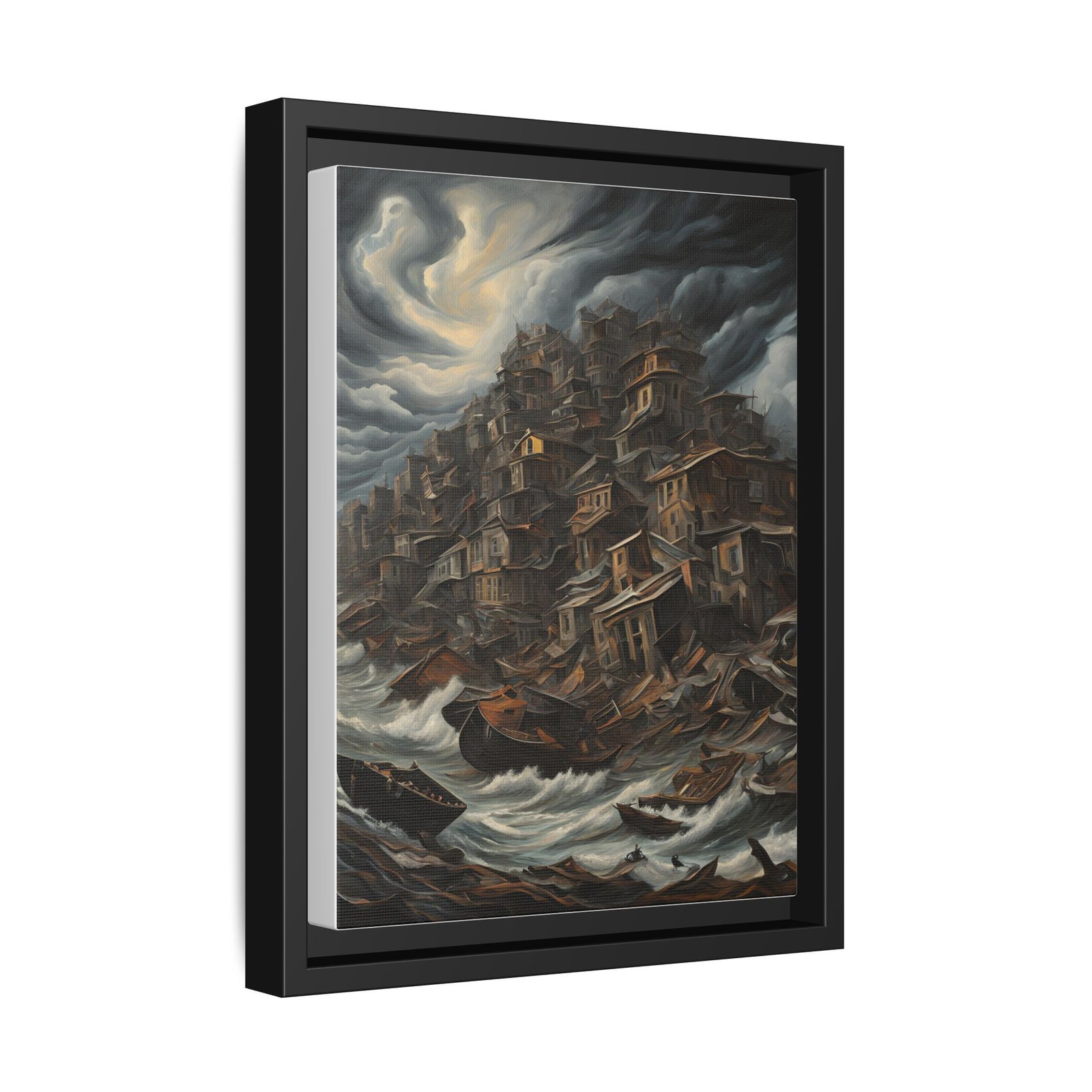 This framed matte canvas brings a storm-haunted cityscape into your home with painterly depth and tactile presence. Rich, layered brushwork and muted, brooding tones create a sense of weather and movement — wind-tossed clouds, foaming seas, and clustered rooftops that climb like terraces into the sky. The black pine frame and subtle white floater reveal emphasize contrast and give the scene room to breathe on the wall. It’s for someone who loves moody, narrative art that invites long looks and quiet conversations in a reading nook, hallway, or study.