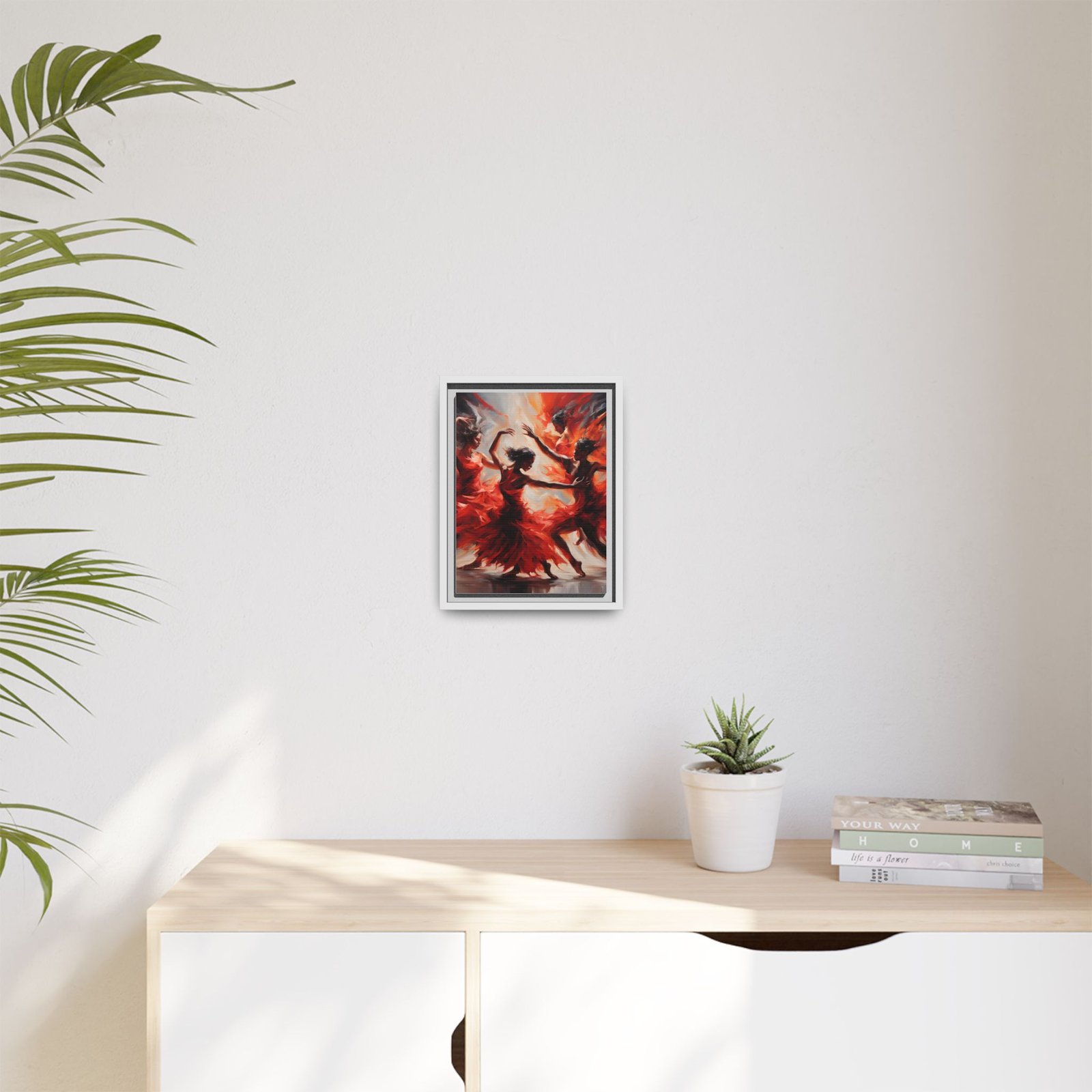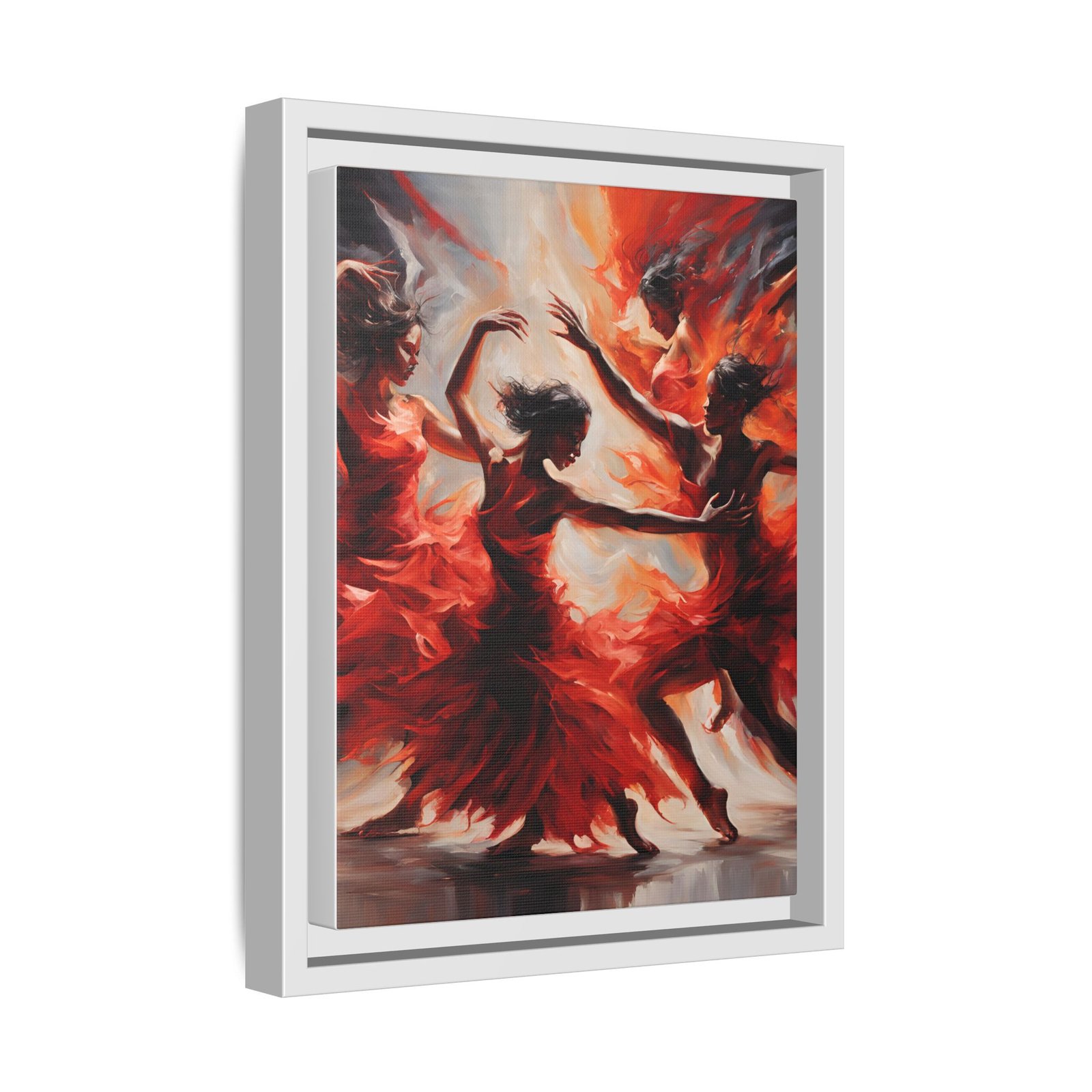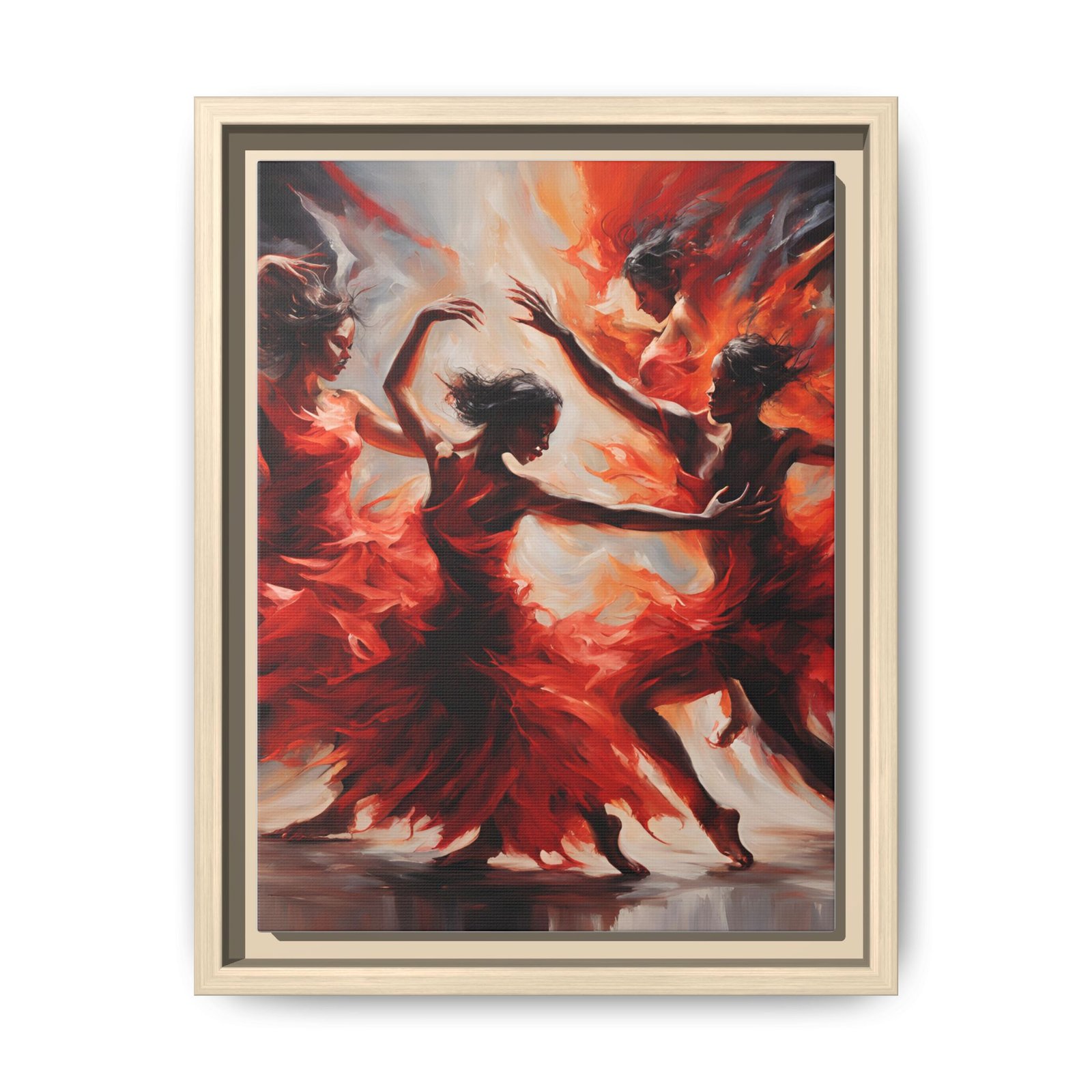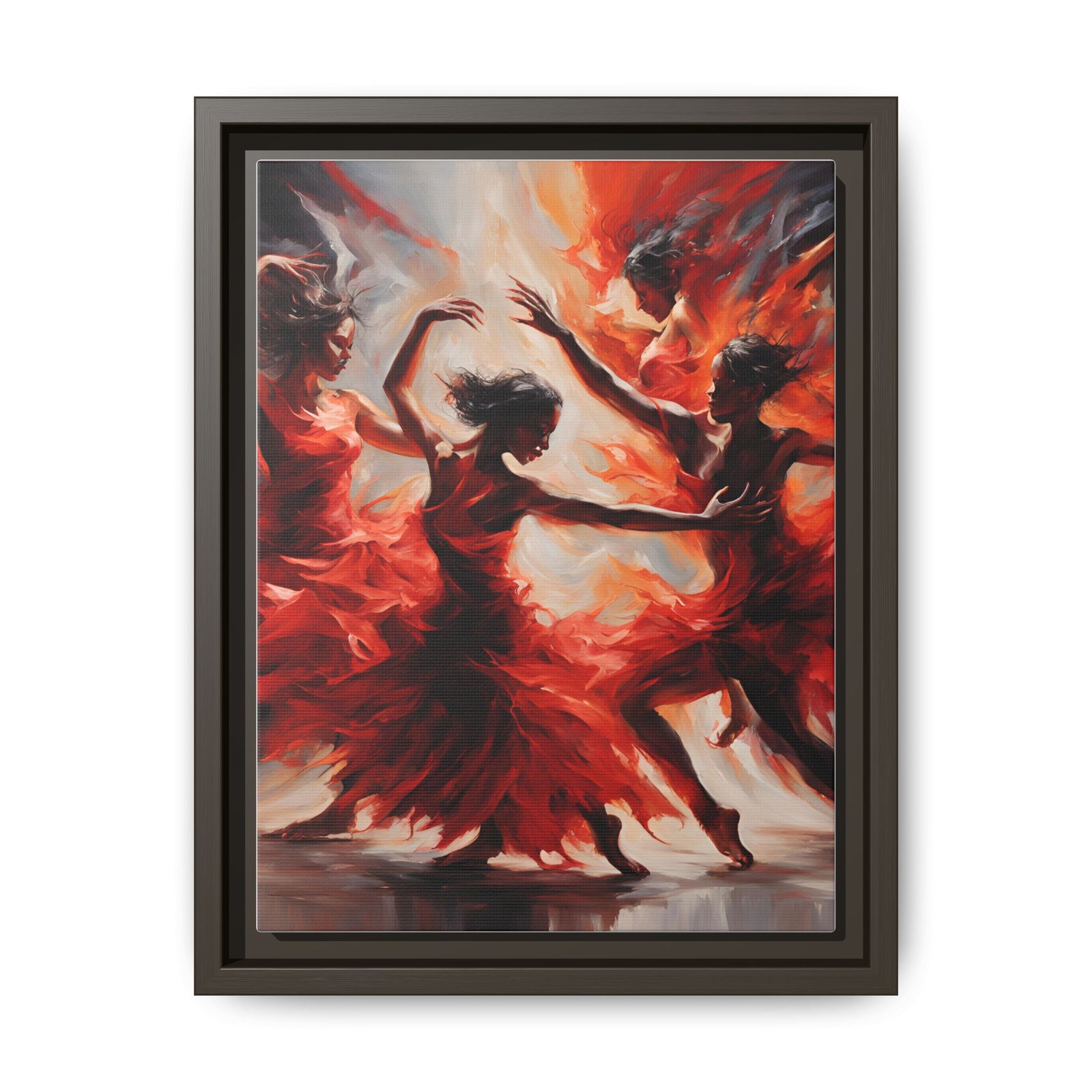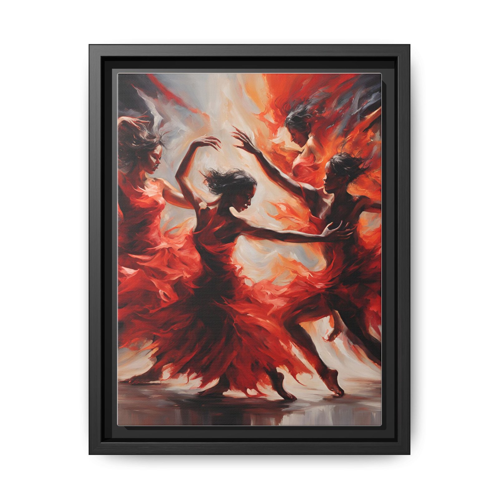 This framed matte canvas captures motion and heat — dancers rendered in sweeping scarlet brushstrokes that seem to spin right off the surface. The deep blacks of the narrow pine frame anchor the energy, turning a bold, expressive painting into a gallery-ready statement. Hang it where people gather: a living room wall that needs warmth, a hallway that benefits from drama, or an entry that introduces movement the moment guests arrive. It reads like a snapshot of music and flame — intimate, alive, and thoughtfully made with sustainable materials so the craftsmanship behind the image feels as responsible as it looks.