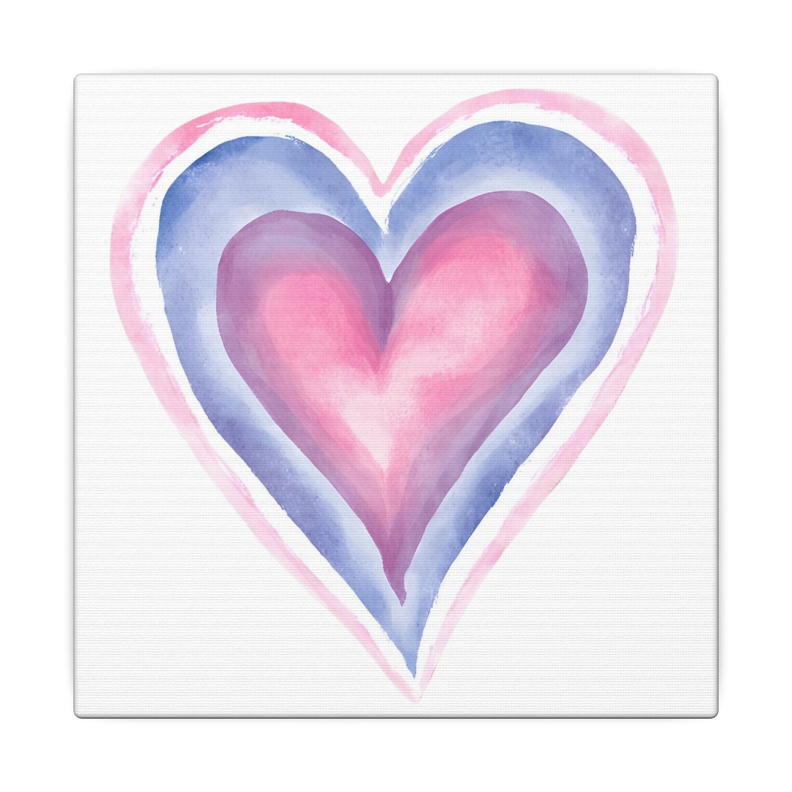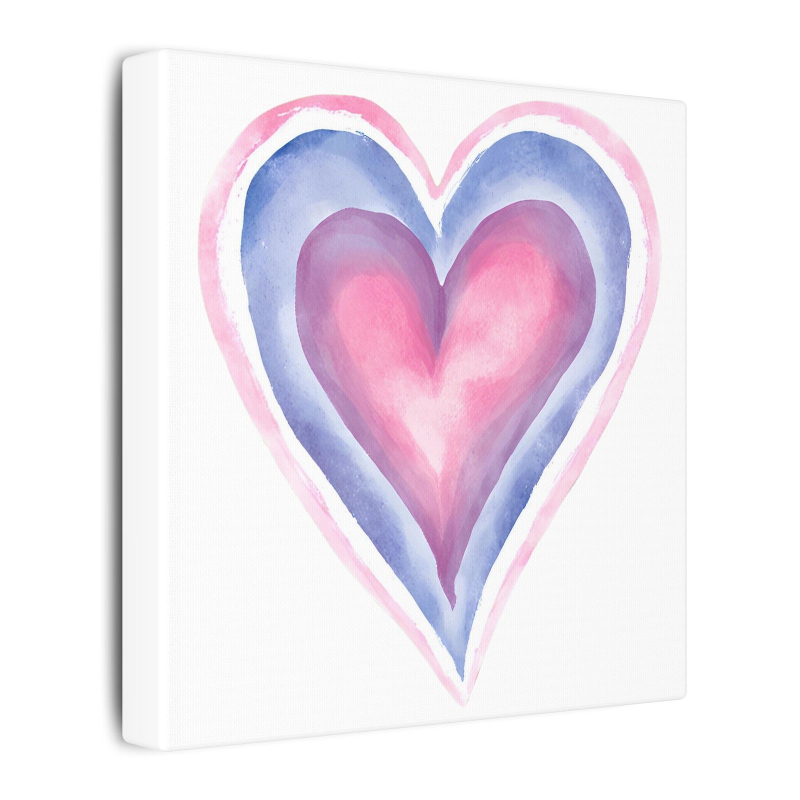 A soft, watercolor heart printed on a matte stretched canvas that brings quiet warmth to a favorite corner. Gentle washes of pink and lavender bloom from the center, layered with translucent bands that feel hand-painted. The 0.75″ depth gives the image subtle presence without overwhelming a space. Lightweight but sturdy, this piece hangs securely with soft rubber dots on the back so the image sits true on your wall. The natural pine frame and eco-conscious inks mean the artwork looks fresh while staying kind to the planet — a calm, intimate accent for bedrooms, nurseries, or cozy living spaces.