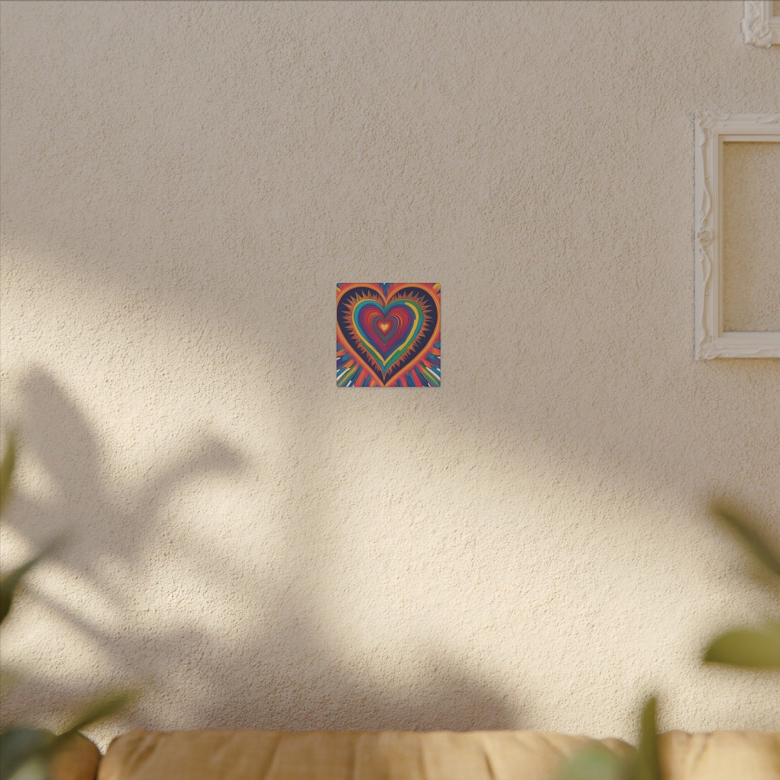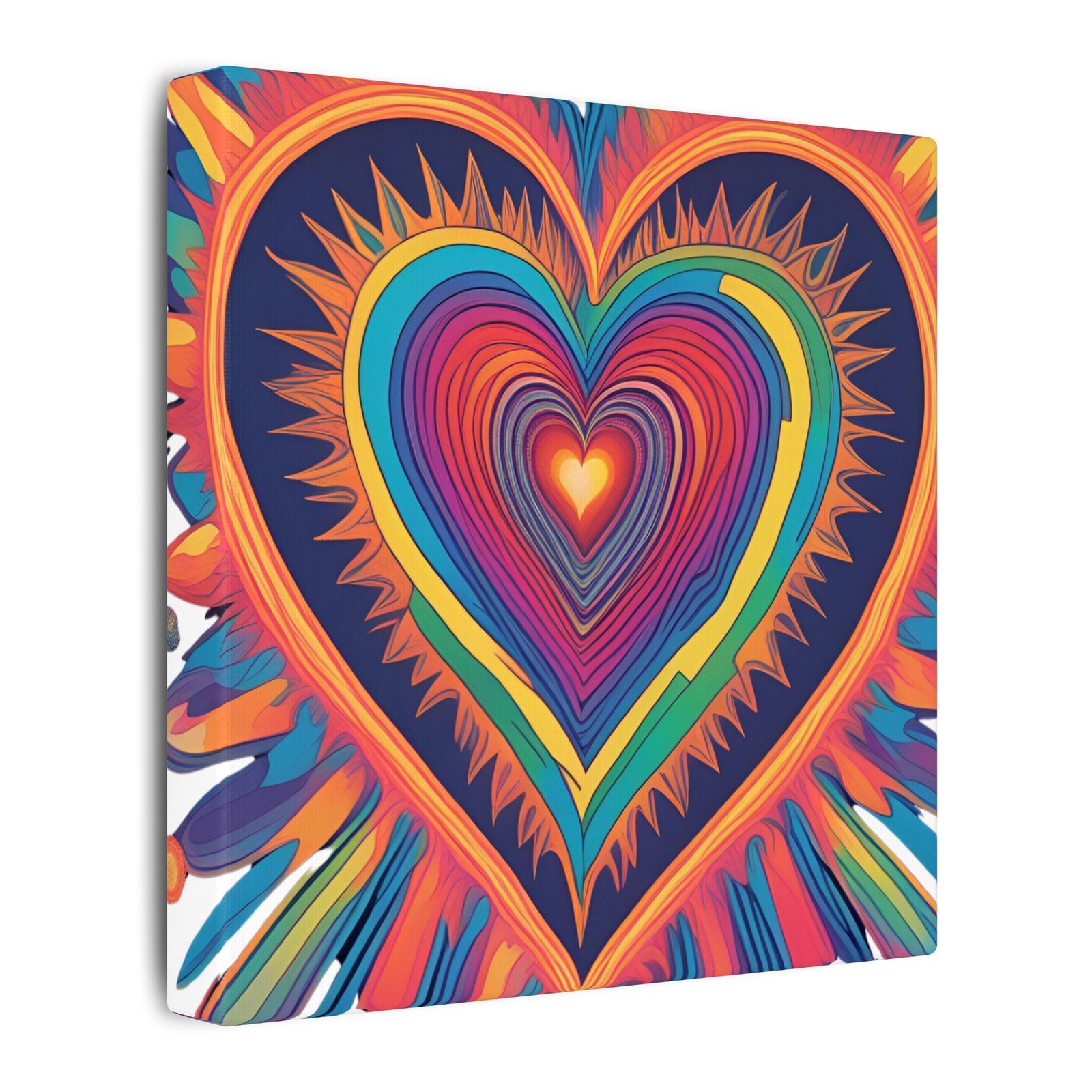 This stretched matte canvas brings warm, electric energy to any wall. Layers of rainbow hues form a vibrating heart at the center, radiating sunburst spikes and painterly drips that feel handcrafted and alive. The 0.75″ profile gives the piece presence without overwhelming the room, and the matte finish mutes glare so the colors read rich and velvety from every angle. It settles into living rooms, studios, or cozy nooks where bold color and upbeat emotion are welcome — a daily reminder of joy, connection, and the small sparks that brighten ordinary days.