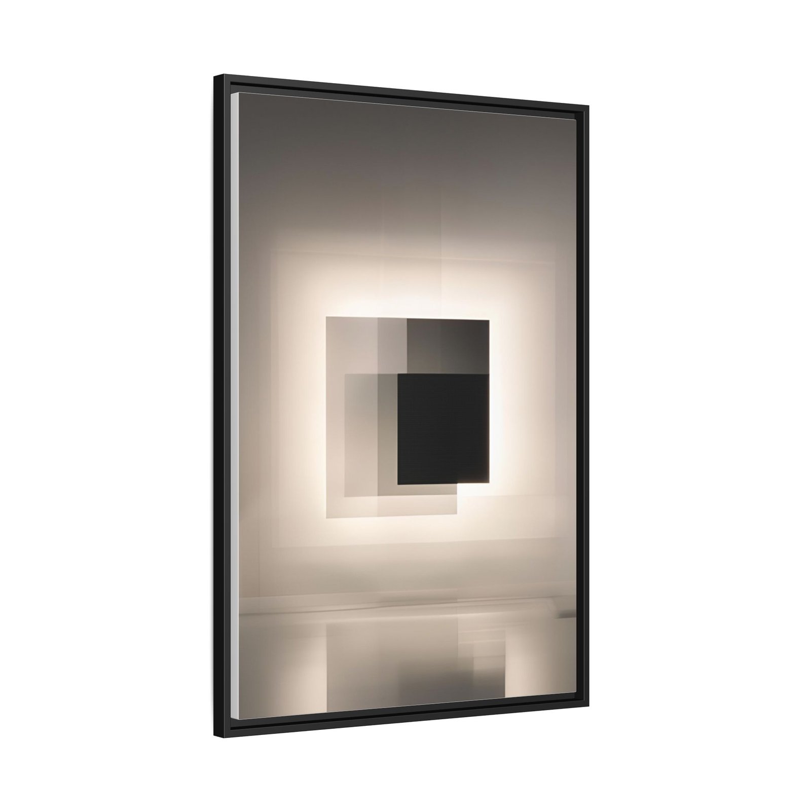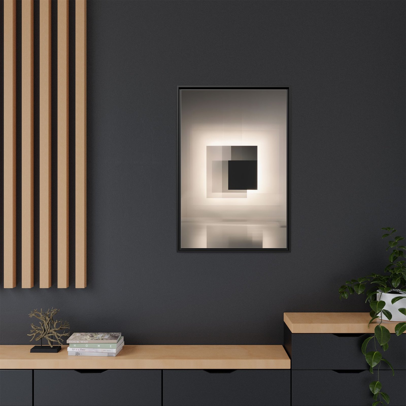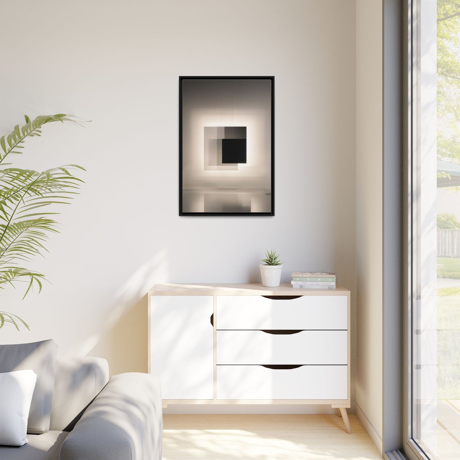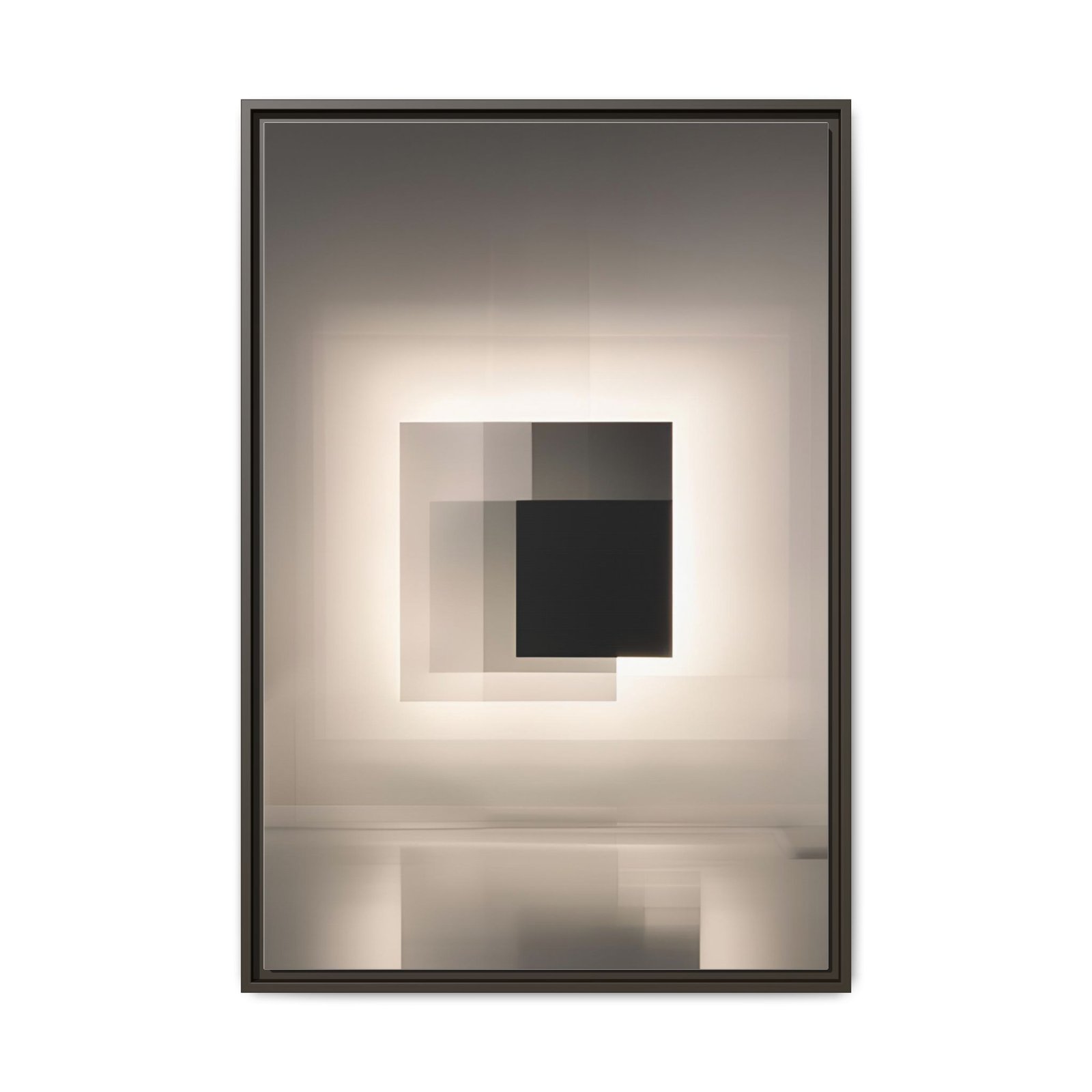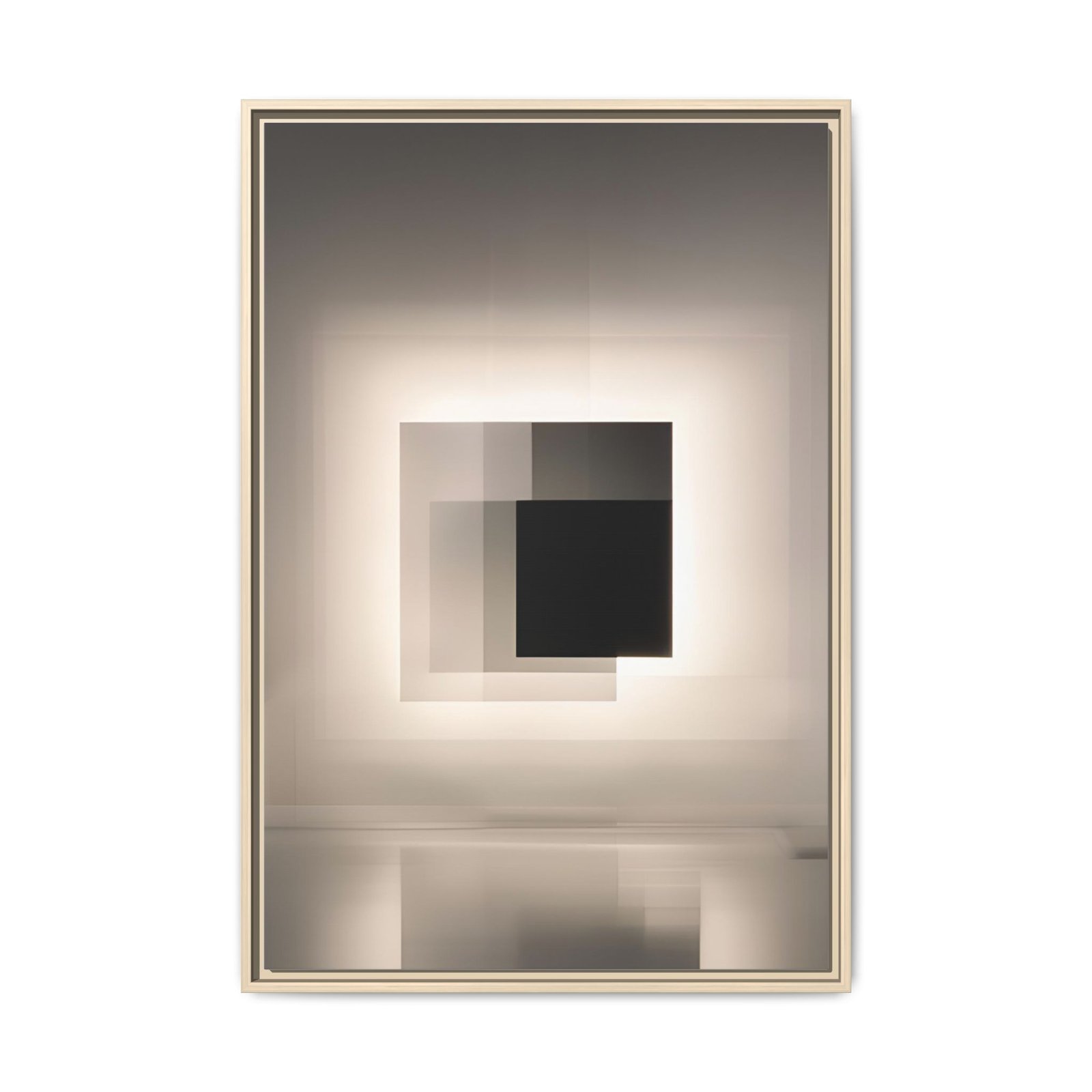 A framed matte canvas that brings quiet geometry and warm light into a room. Subtle gradients and layered squares float above a gentle reflection, creating a contemplative focal point that settles into living rooms, entryways, or minimalist offices. The thin pine frame and muted palette keep the artwork grounded, letting the composition read as both modern and meditative. Hang vertically to emphasize depth, or choose a larger horizontal size to expand the sense of calm across a wall.