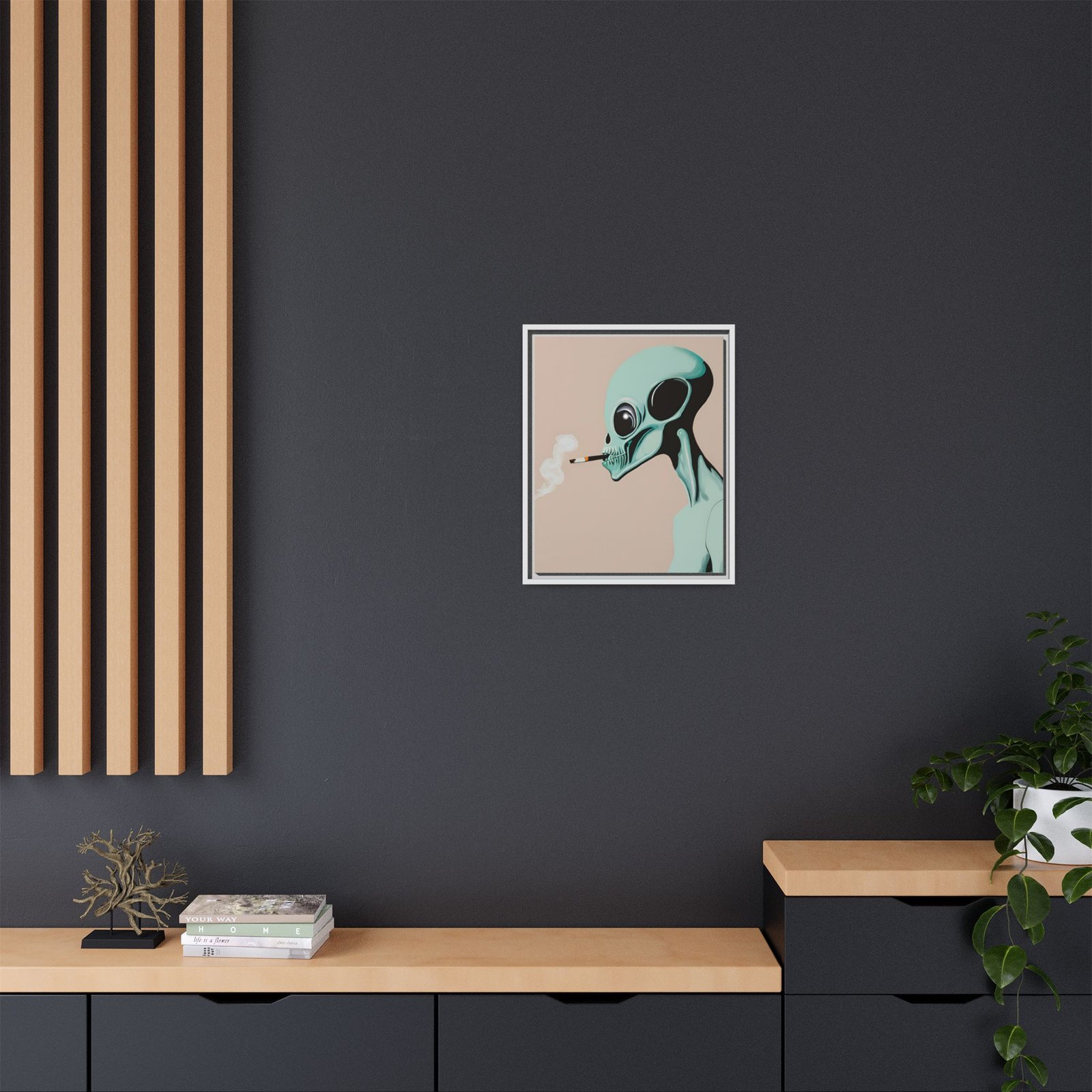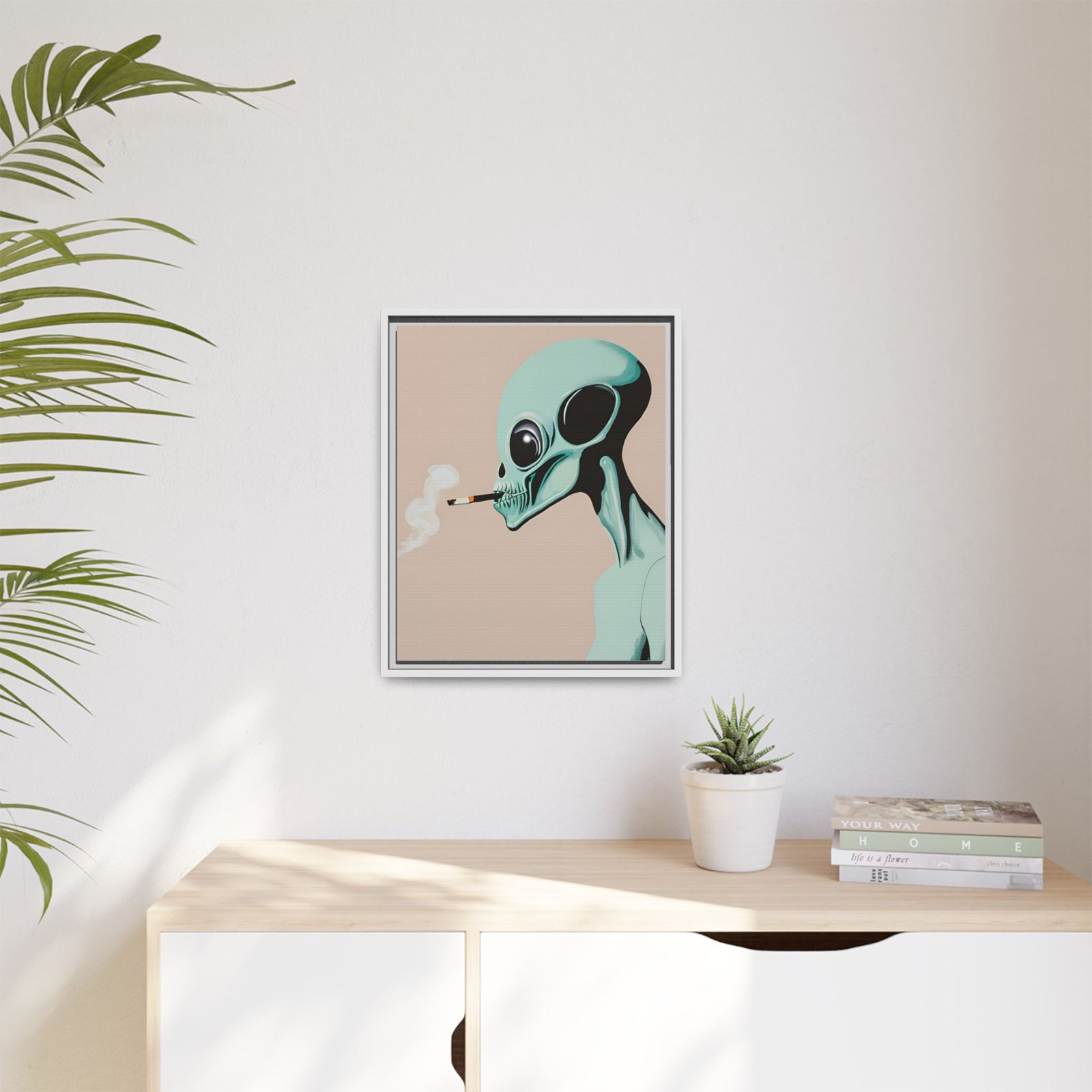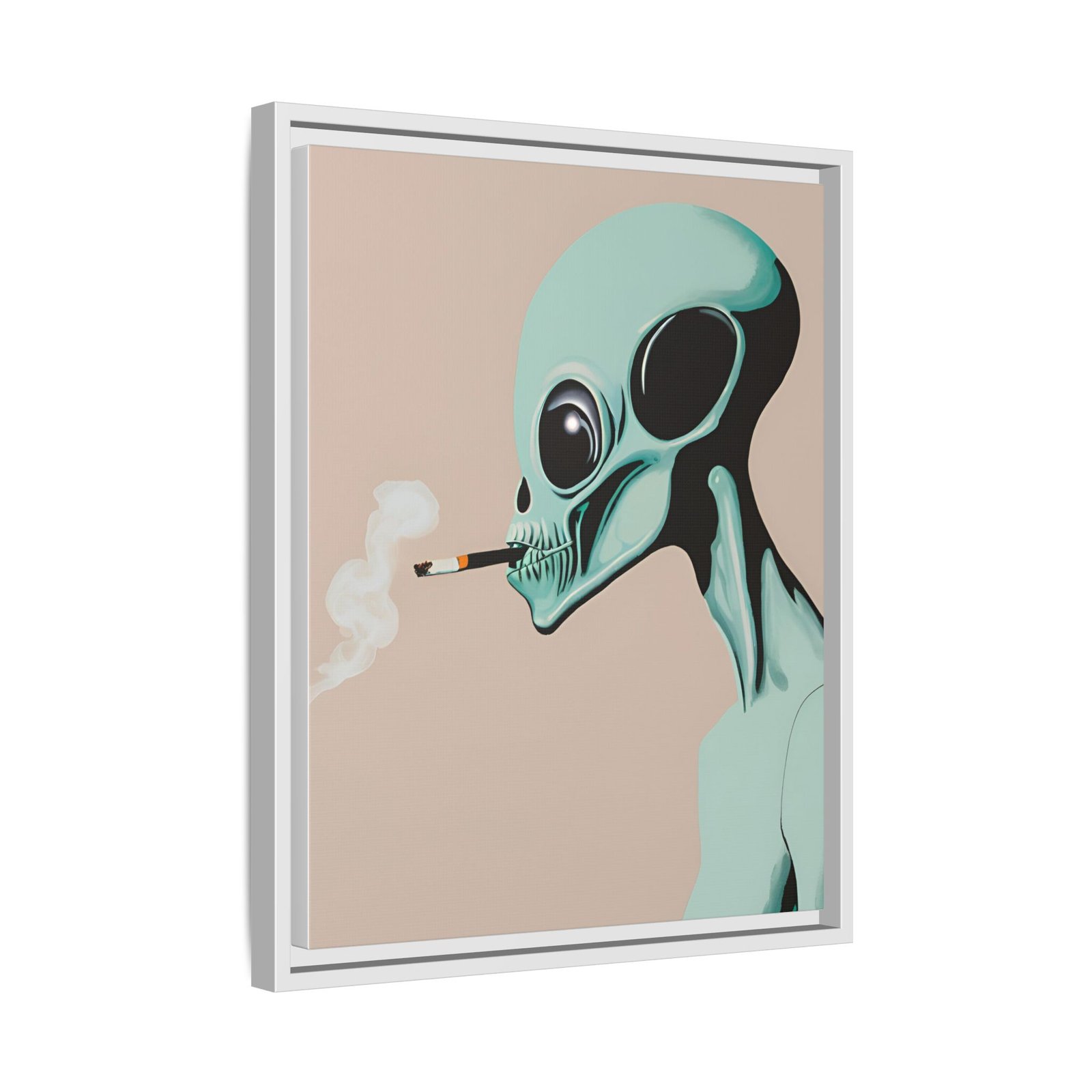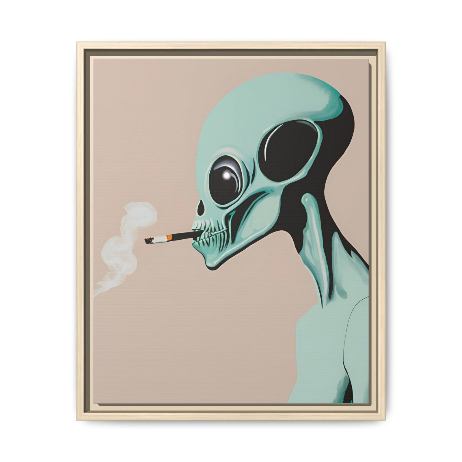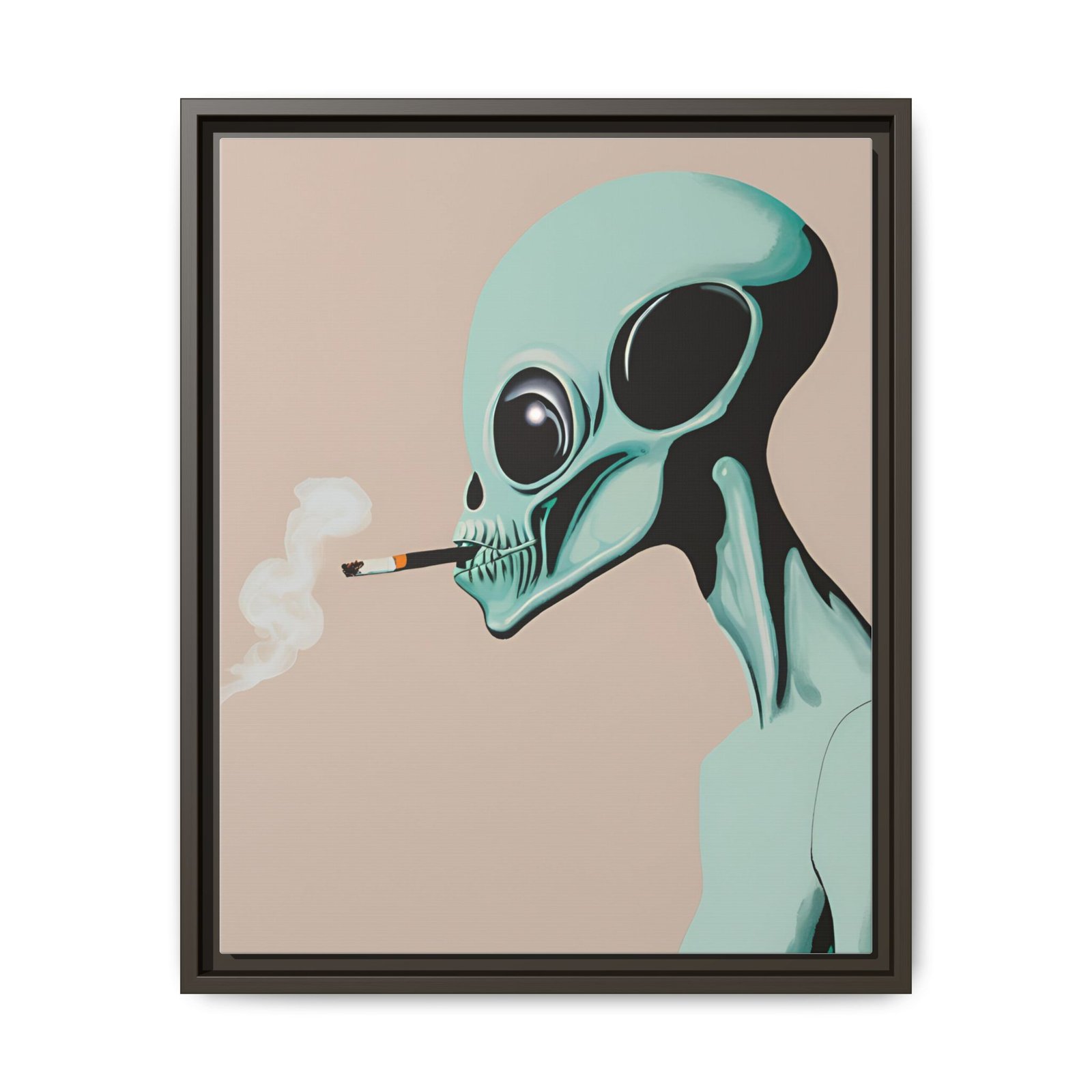 A framed matte canvas print that brings a cool, surreal edge to any wall. The artwork shows a mint-green alien exhaling a curl of smoke against a warm beige background — a quiet, slightly mischievous portrait that reads like a late-night story. The slim pine frame and matte finish keep reflections low and colors rich, letting the illustration’s soft pastels and deep contrasts sit calmly in living rooms, studios, or eclectic halls. It hangs easily with included sawtooth hardware and comes in multiple orientations and sizes to fit gallery walls or narrow niches. Sustainably produced with non-toxic latex inks on a cotton-poly canvas composite, this piece looks polished while keeping environmental impact low.