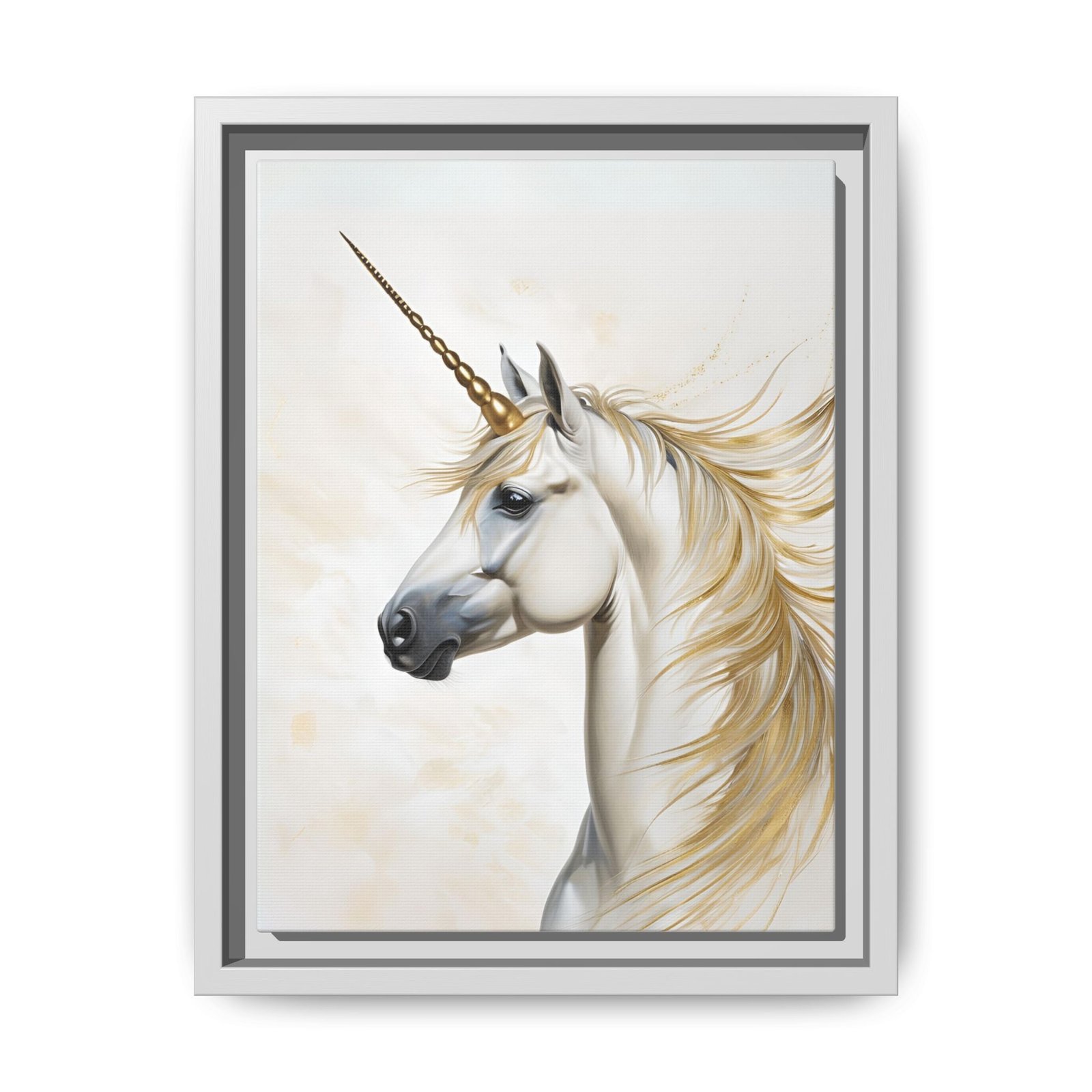 A framed matte canvas print that brings a quiet, enchanted presence to any room. The artwork shows a luminous unicorn rendered in soft creams and golds, its flowing mane catching light like brushed metal. Mounted on a slim pine frame with a smooth black finish, the muted background and delicate highlights let the creature feel both mythical and calm — a companion piece that calms a reading nook, anchors a nursery wall, or adds subtle wonder to a hallway. The coated cotton-poly canvas and Greenguard Gold inks keep colors vivid without glare, while the sawtooth hanging hardware makes installation simple.