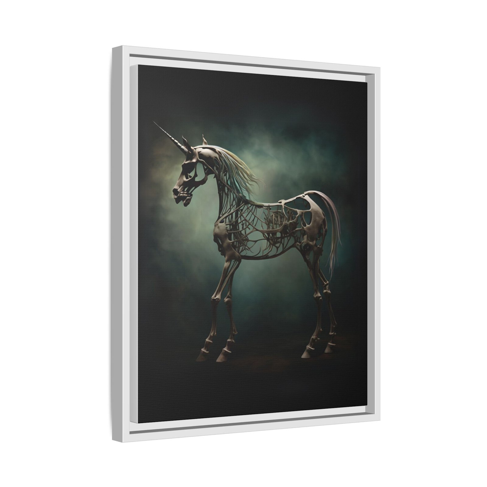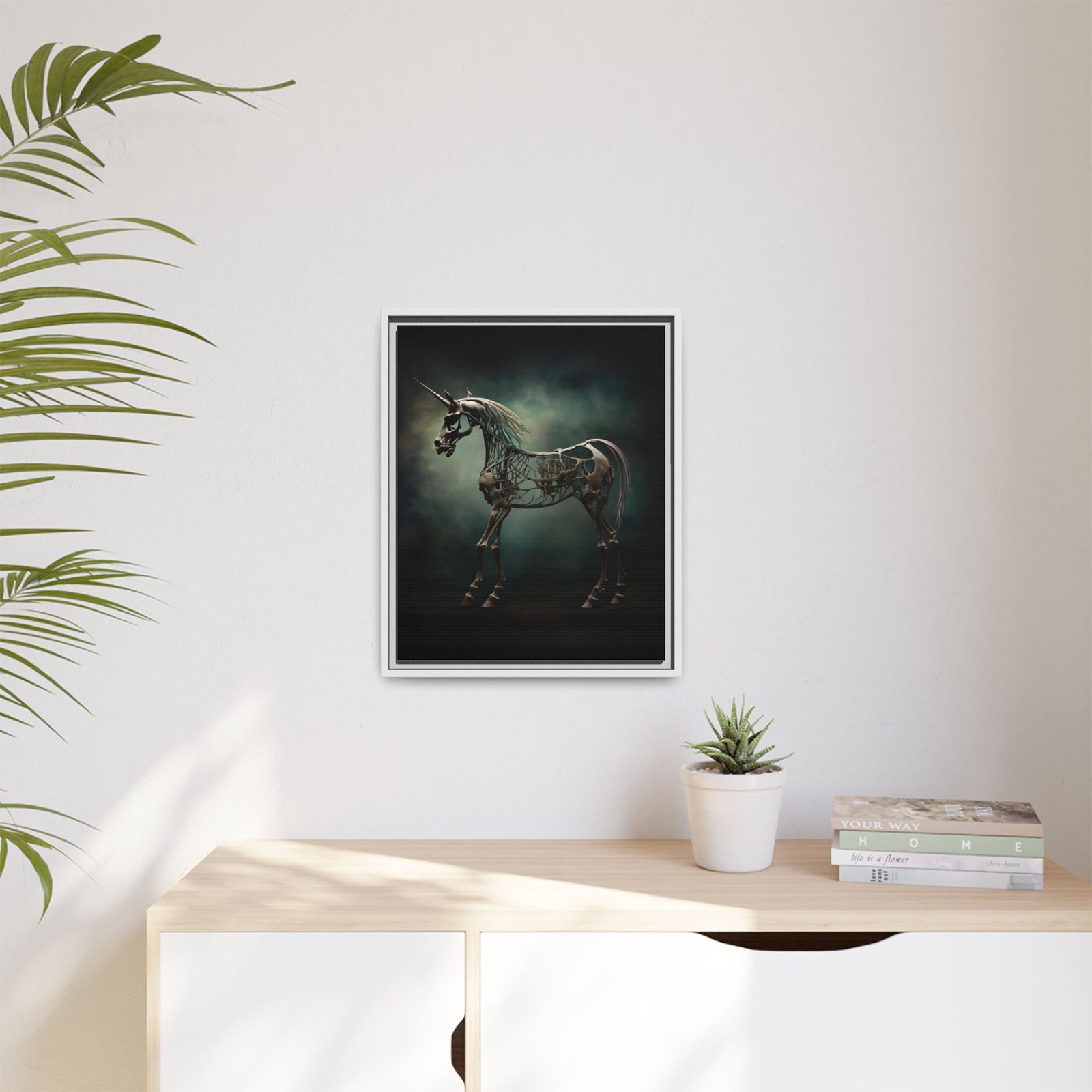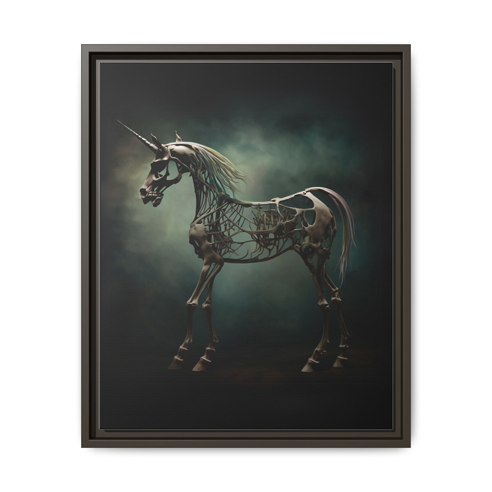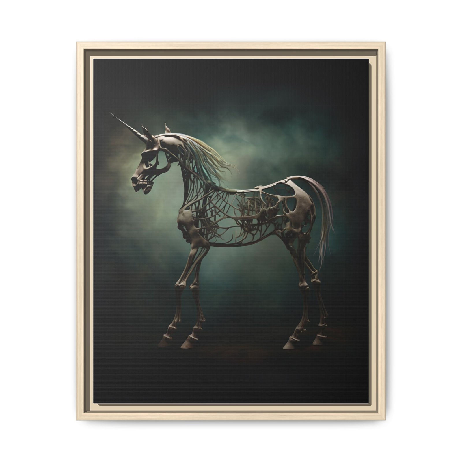 A matte canvas print framed in sleek pine, this piece brings an atmospheric, dark-fantasy presence to any wall. The artwork — a haunting, skeletal unicorn set against a moody, teal-green mist — feels like a quiet story paused between breaths. Rich, deep blacks and jewel-toned highlights come alive on a specially coated cotton-poly canvas, while the refined black frame gives the image a gallery-ready edge. It hangs easily with sawtooth hardware. For collectors of surreal and gothic art, this framed canvas becomes the room’s focal point: contemplative, mysterious, and quietly theatrical.