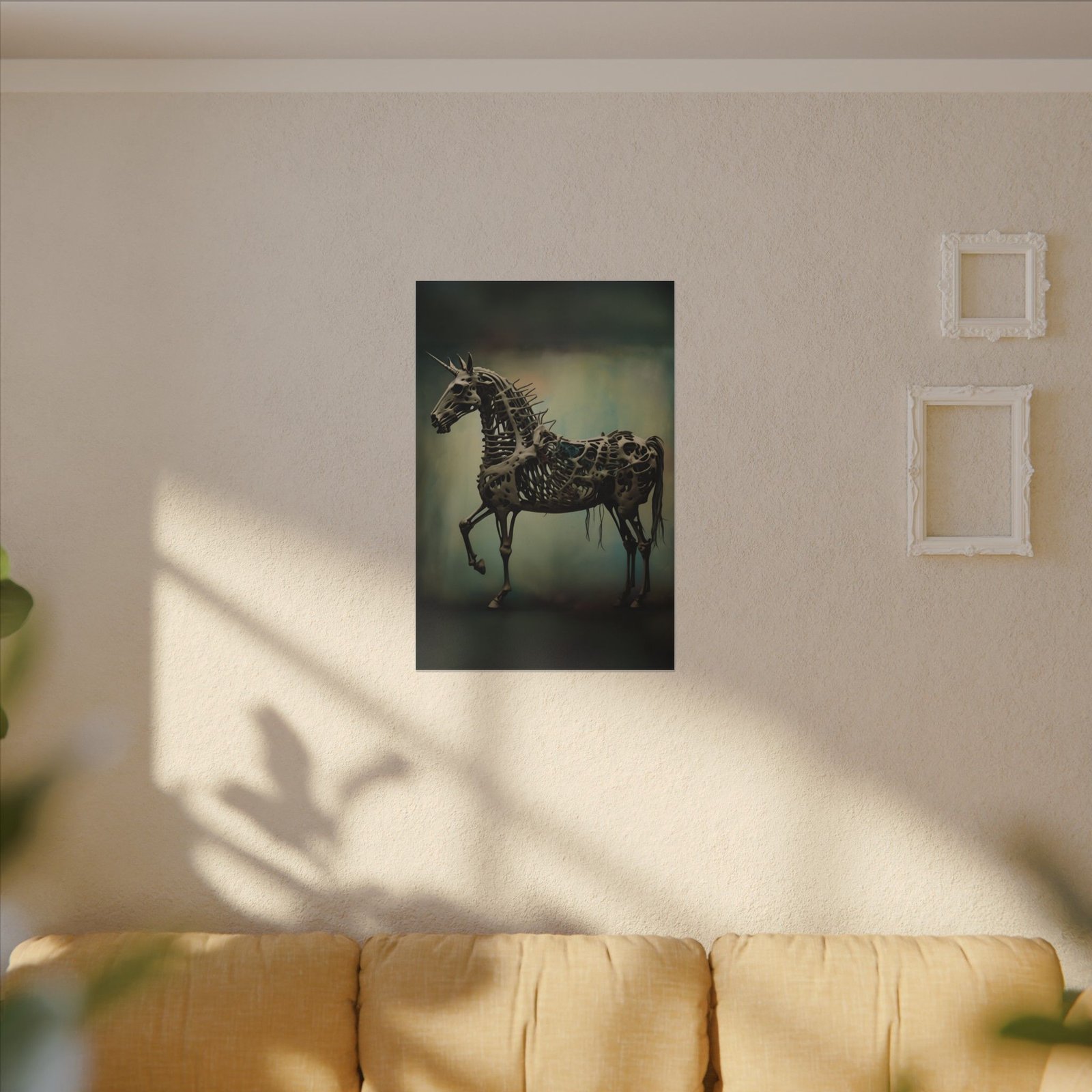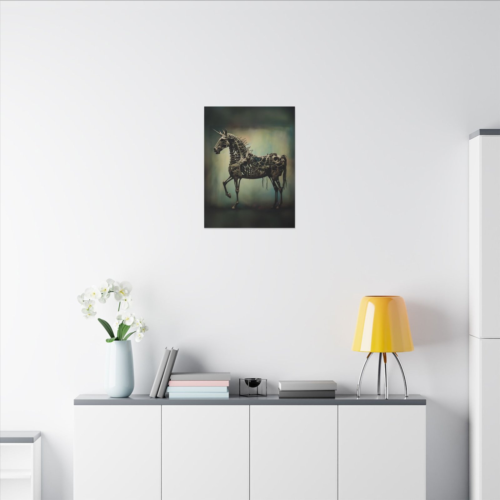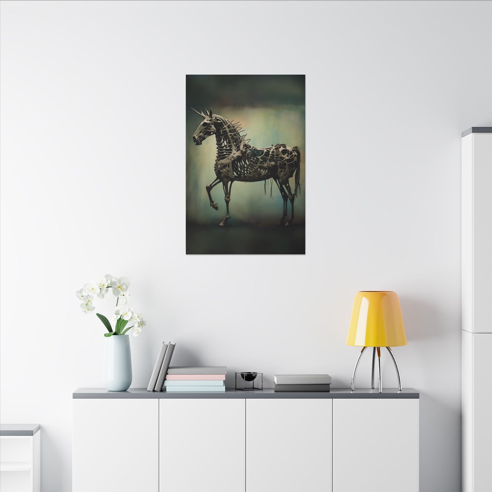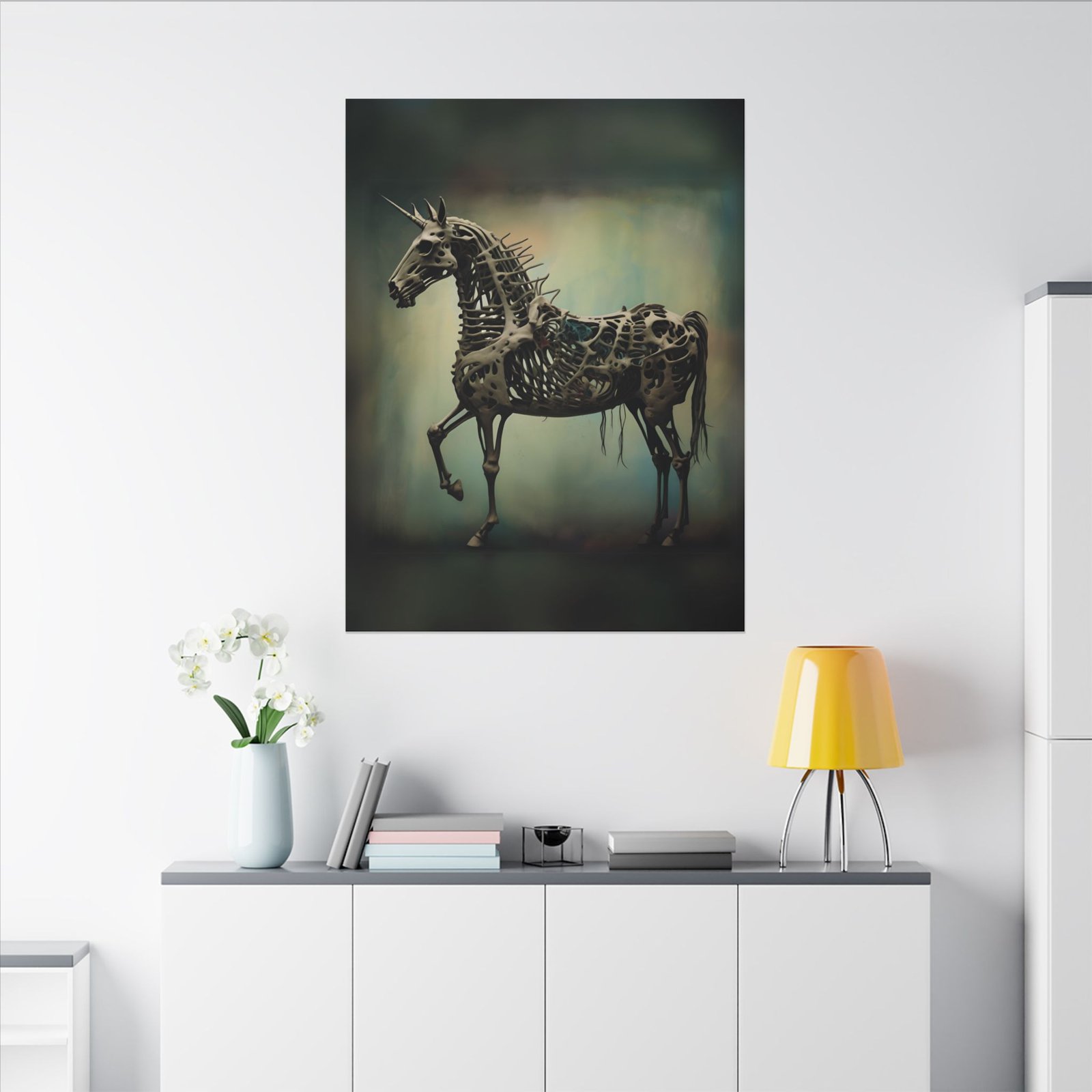 Transform your living space with this stunning Matte Canvas artwork, an eye-catching addition that blends artistic flair with modern design. The unique print features a captivating skeletal unicorn, perfect for lovers of fantasy and the unconventional. This canvas brings a moody yet enchanting atmosphere, making it ideal for living rooms, bedrooms, or creative workspaces. Whether you’re decorating for Halloween, adding personality to your home, or searching for a distinctive gift for an art enthusiast, this piece resonates with those who appreciate unique and thought-provoking decor. Celebrate creativity and imagination with this artwork, suitable for gifting on special occasions such as birthdays, housewarmings, or just because!