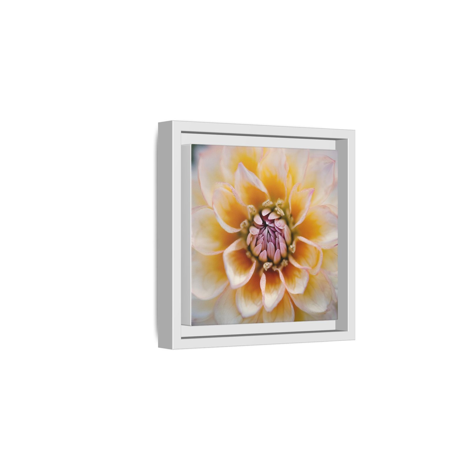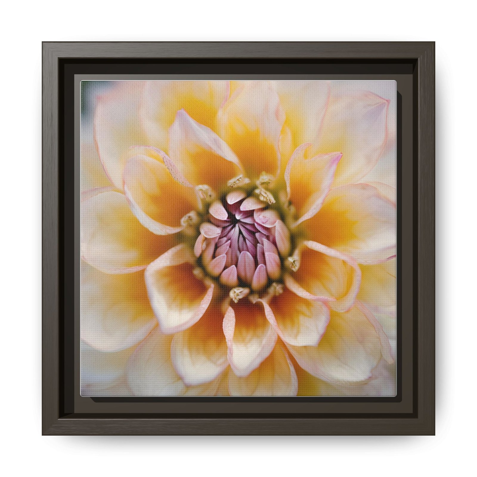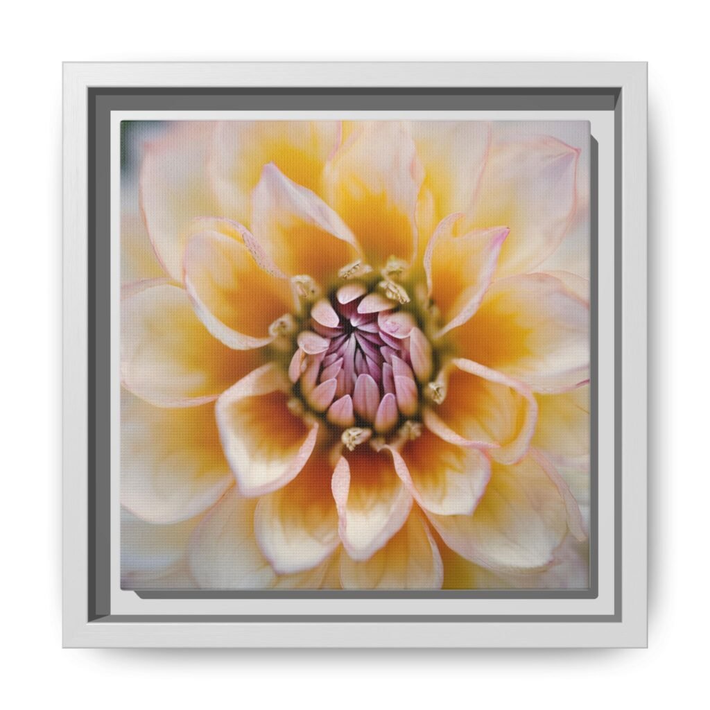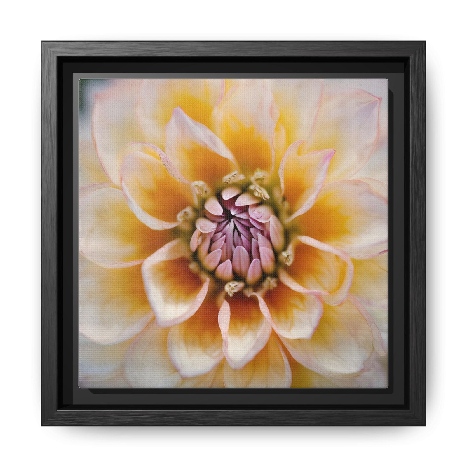 A soft, painterly bloom captured on a museum-quality matte canvas and set inside a sleek framed edge. The layered petals and warm, sunlit tones invite a quiet pause — like a slow morning with coffee by the windowsill. Hang it in a reading nook, bedroom, or entryway to invite calm and a hint of garden warmth. The black frame gives the image modern structure while the textured matte surface keeps reflections low and colors richly layered, so the floral details feel almost within reach.