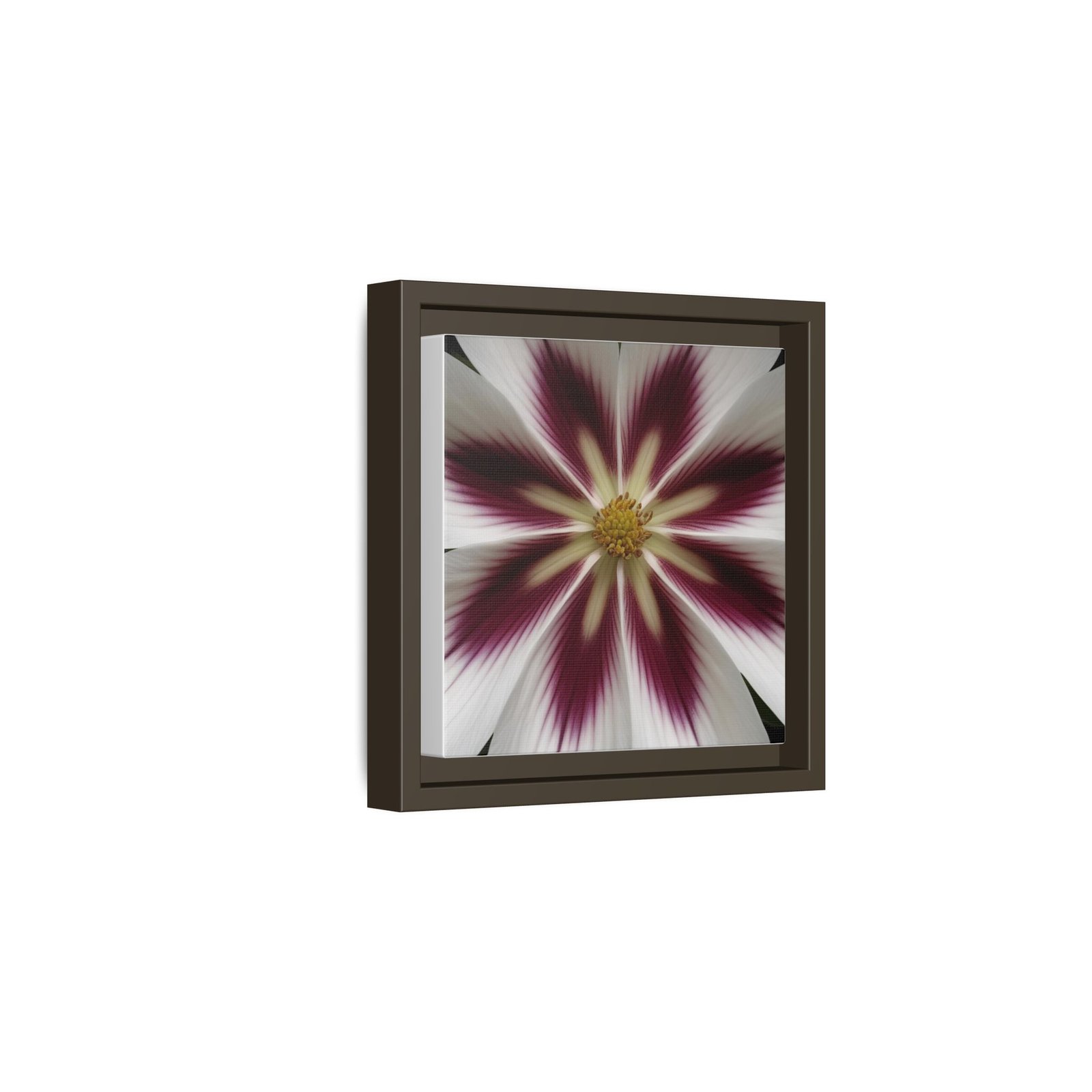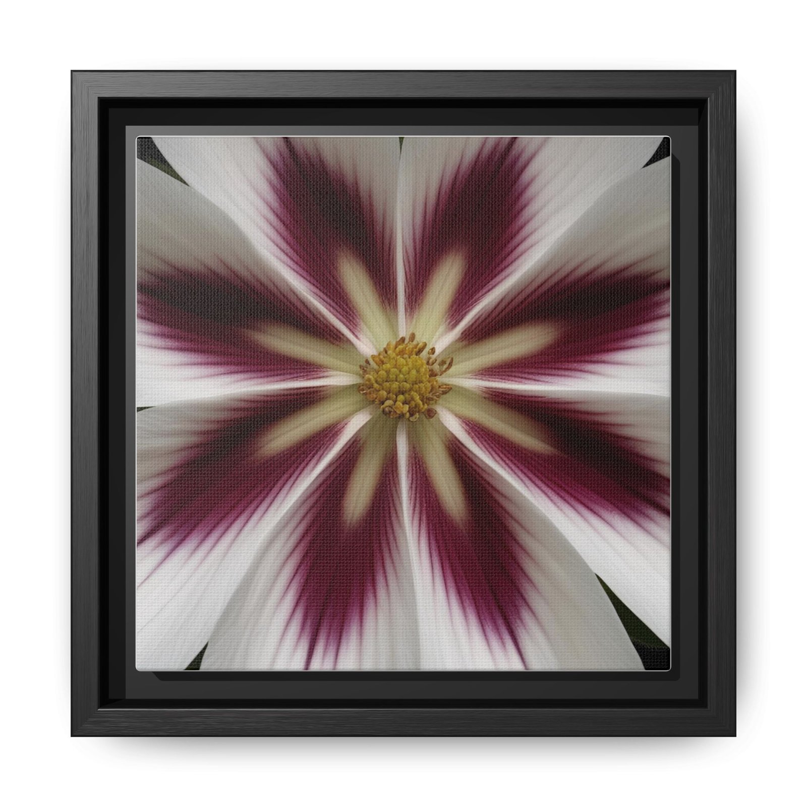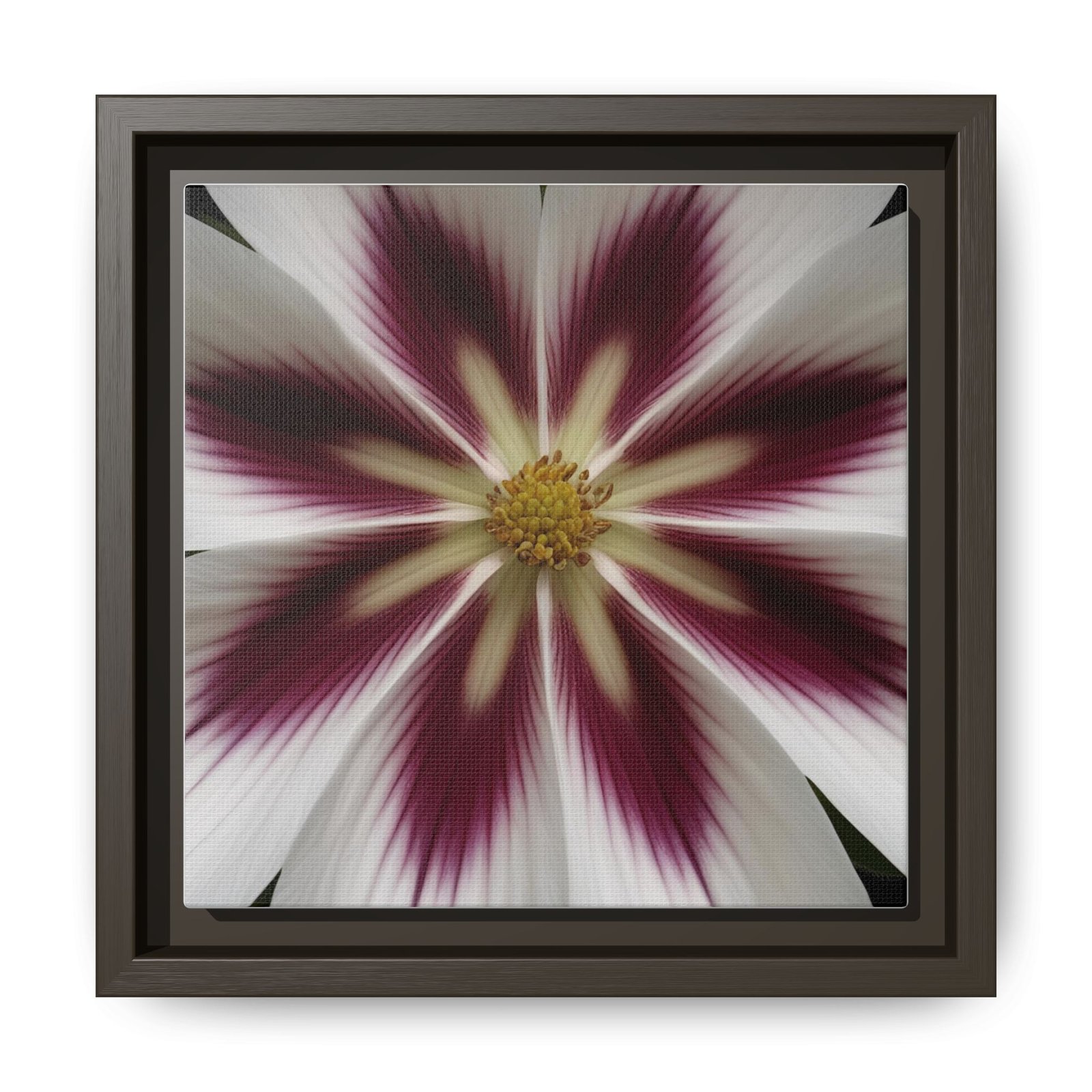 This framed matte canvas brings a quiet, gallery-ready presence to a room. The floral design radiates from the center in muted whites, deep berry tones, and soft gold — a composition that feels both botanical and slightly abstract. Mounted on a slim pine frame with a matte finish, the piece reads as modern and handcrafted. It hangs flush against the wall and anchors small vignettes: a reading nook, hallway, or layered gallery wall. Colors stay true and vivid thanks to latex and Greenguard Gold inks printed on a cotton–polyester canvas with a specialty coating. Choose horizontal, vertical, or square orientations and select a frame color to match your space. Sawtooth hardware is already attached for simple hanging.