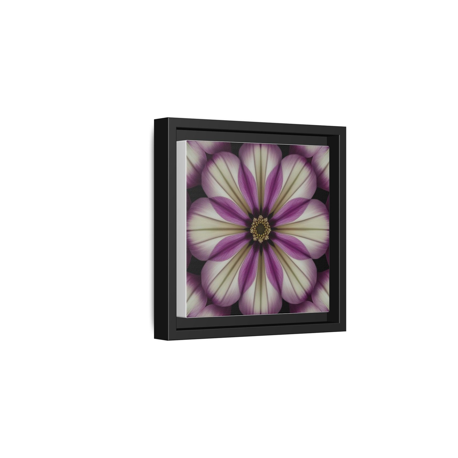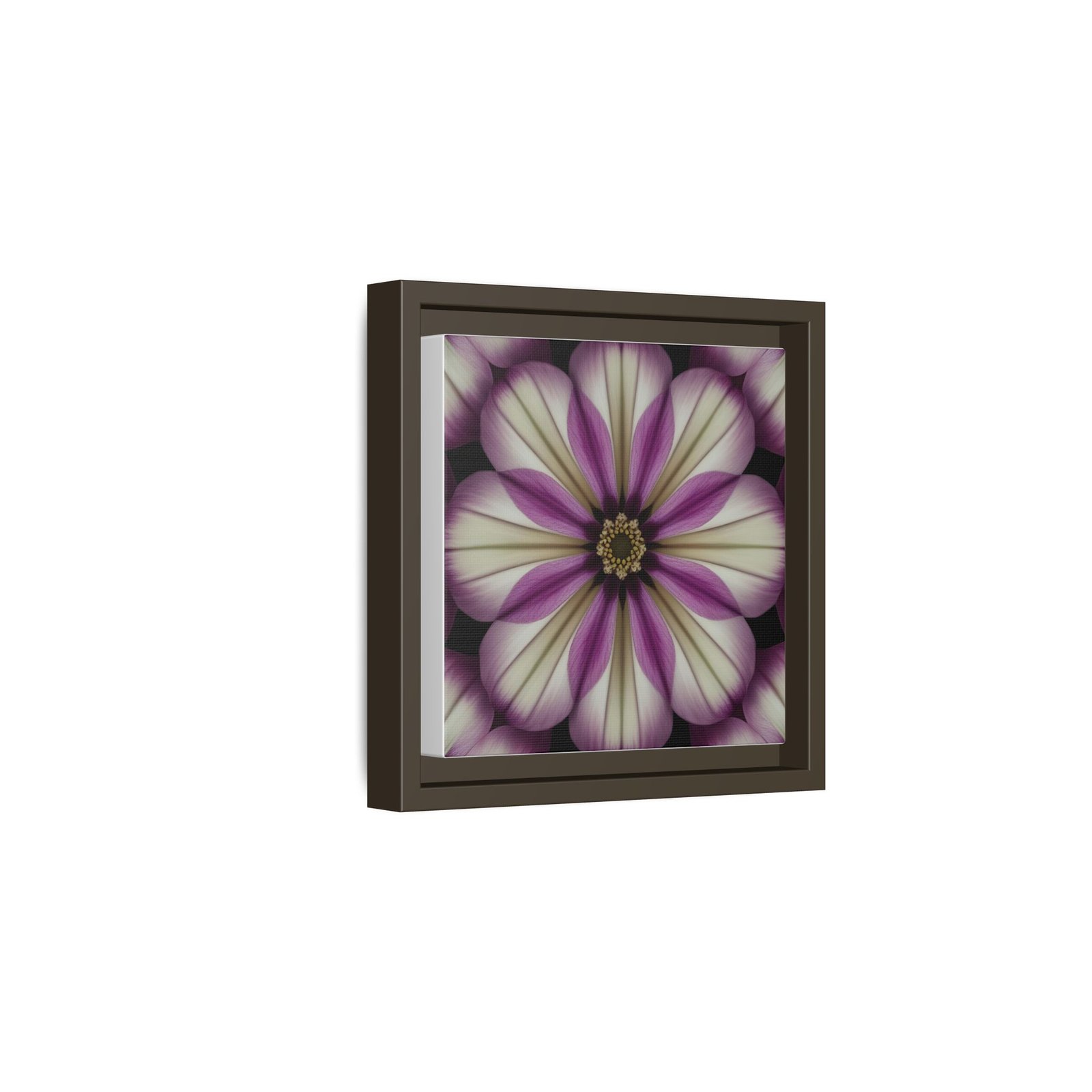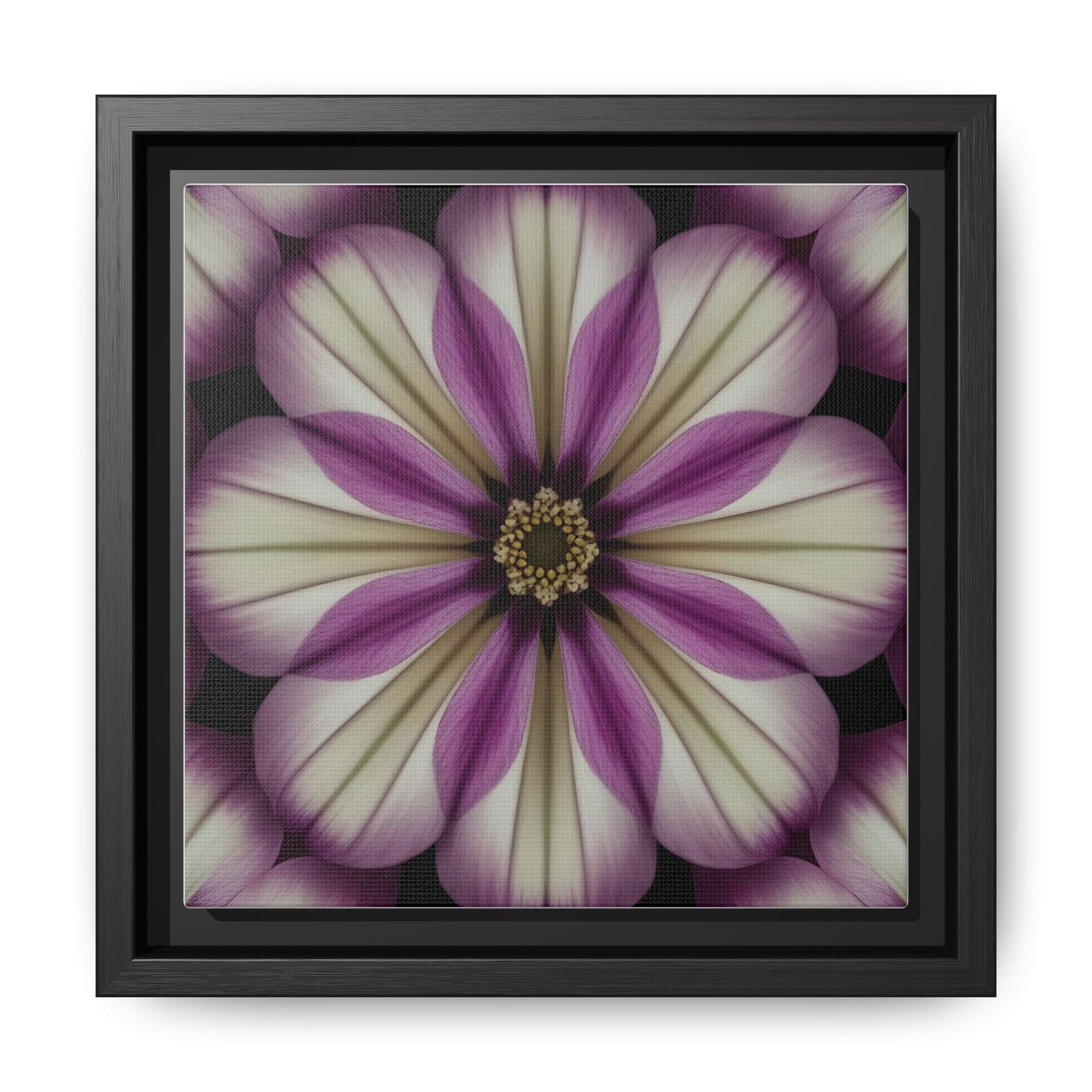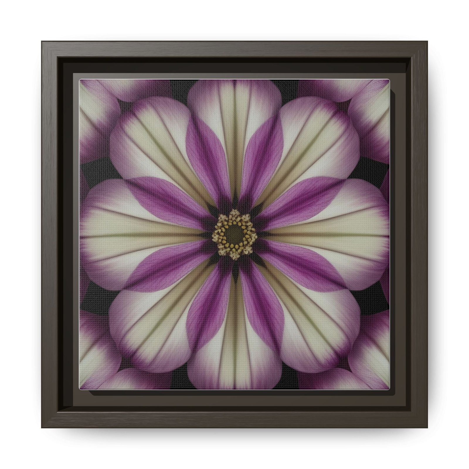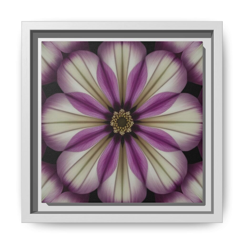 A framed matte canvas that brings a quiet, meditative bloom into any room. Soft ivory petals fade into dusty mauve and plum tones, arranged in a symmetrical floral mandala that feels both vintage and modern. The matte finish calms reflections and gives the image a tactile, gallery-quality presence. Hang it alone as a contemplative focal point or group it with other botanicals to create a restrained, botanical gallery wall. It settles easily into living rooms, bedside nooks, studios, or entryways — anywhere you want a gentle, floral heartbeat that doesn’t shout.